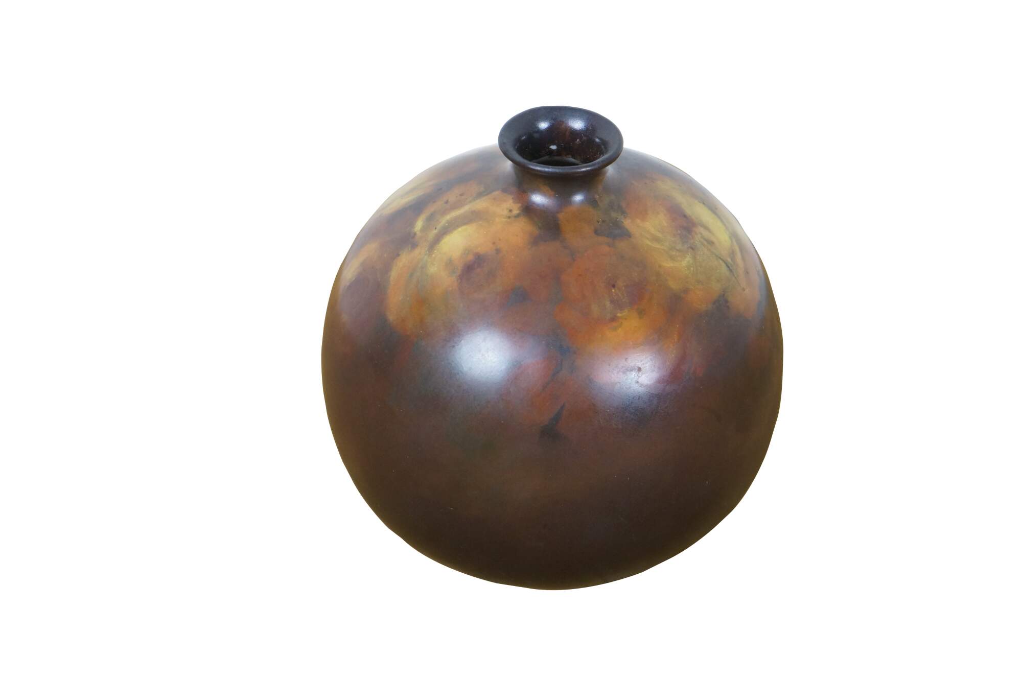 Antique late 19th century ceramic bud vase. Orb-shaped body with a short, narrow neck, decorated in brown with hand-painted yellow roses. No maker’s marks on the base. Attributed to Rookwood Pottery. This piece came in with a collection of Rookwood, and although not marked, appears to have possibly been a piece produced by them.