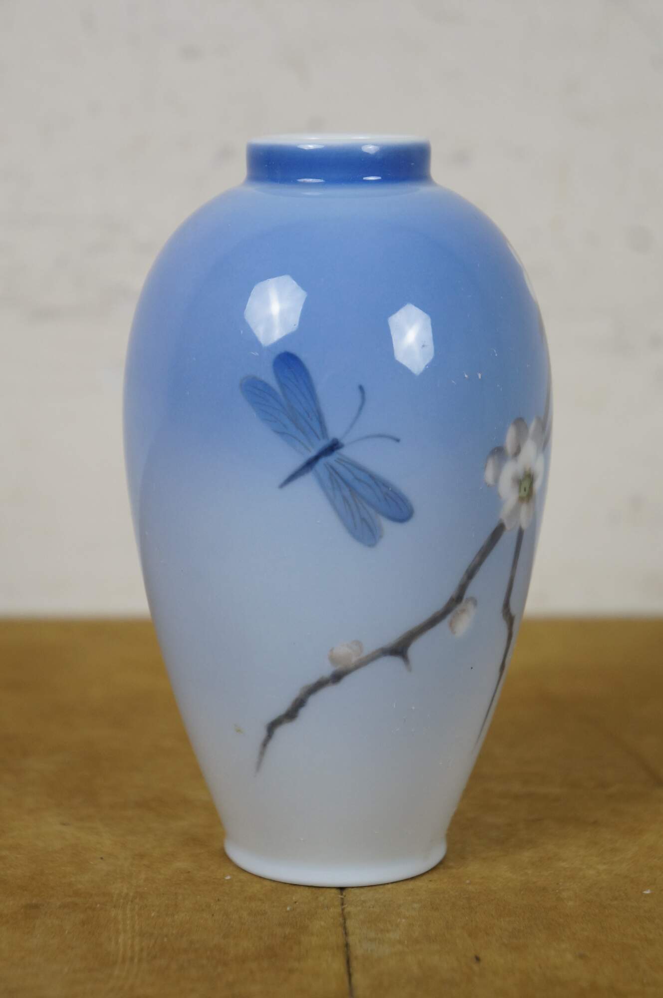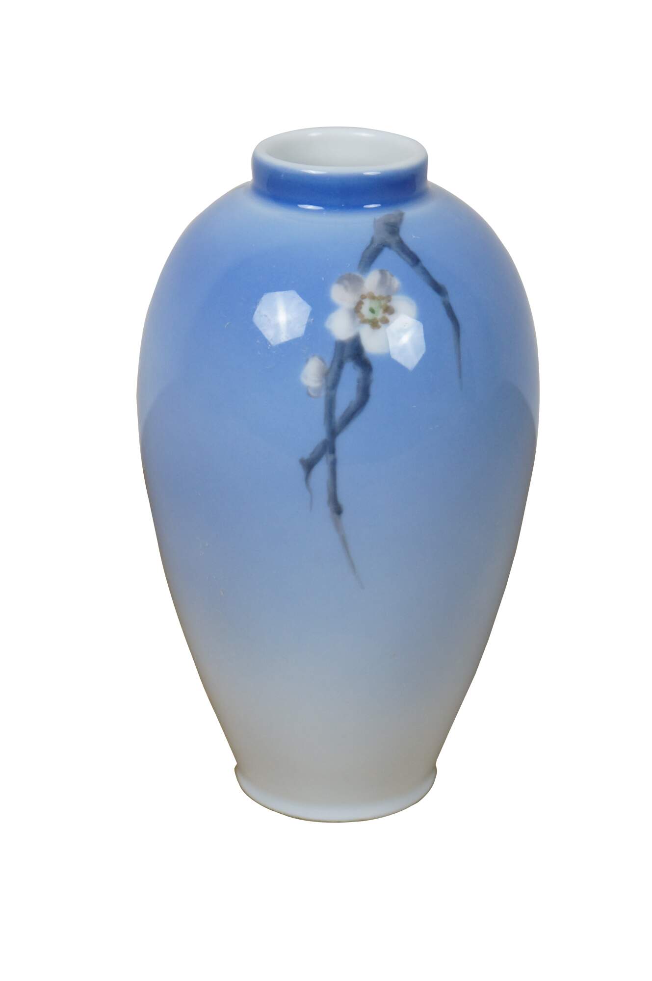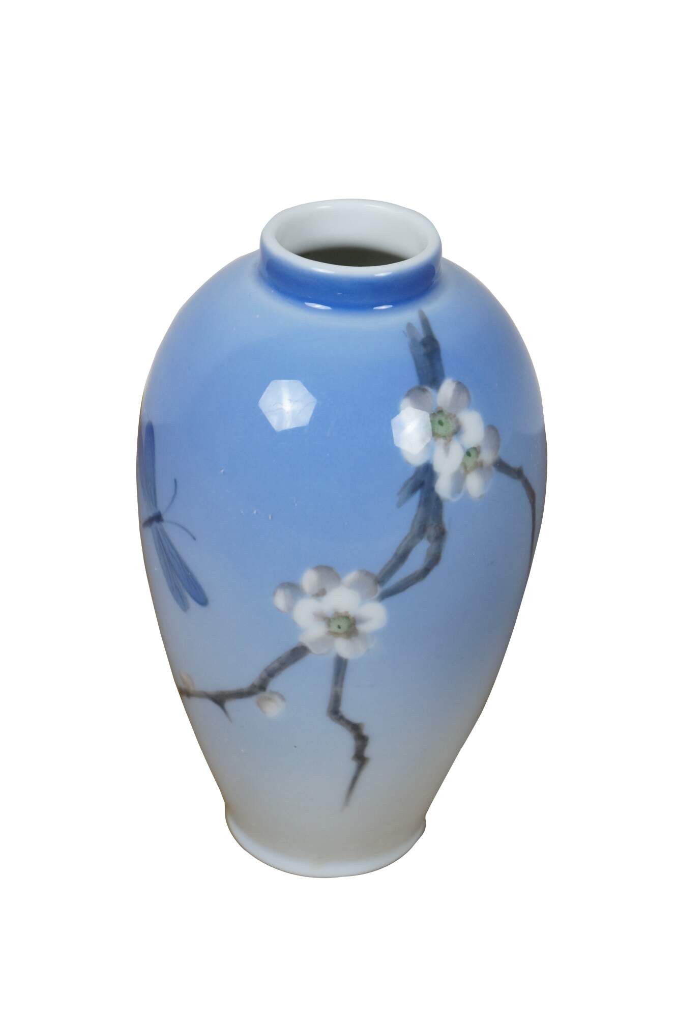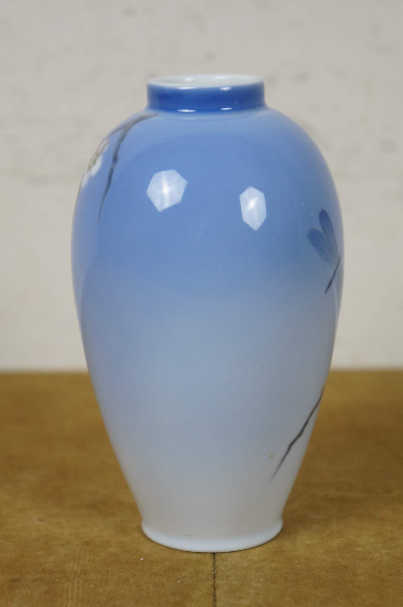Mid century, 1969-1973, Royal Copenhagen flower vase - 2K / 2301 / 47B. Oblong shape with short narrowed neck, decorated with a blue to white ombre, painted under the glaze with a branch of white cherry blossoms and a blue dragonfly.