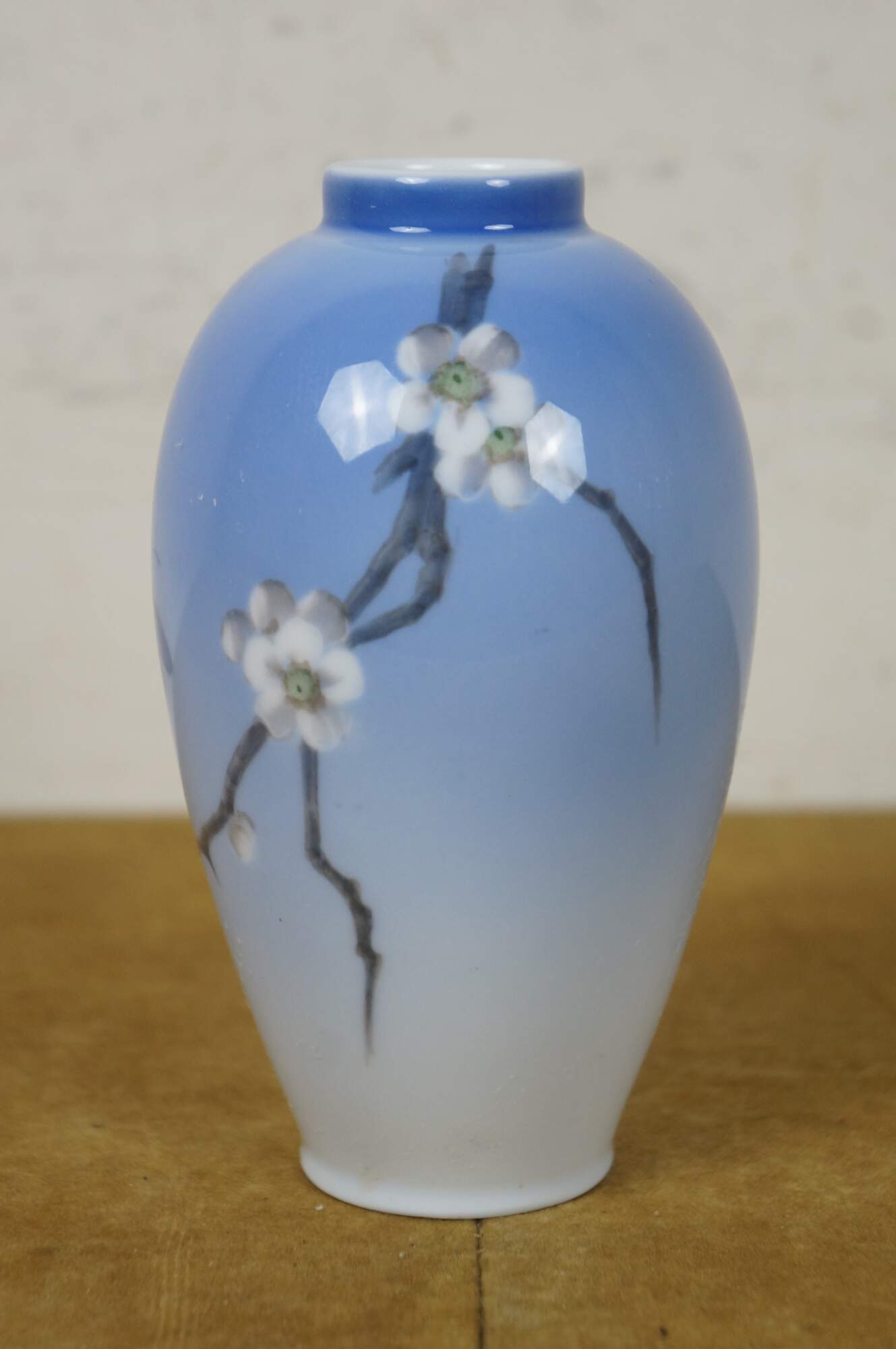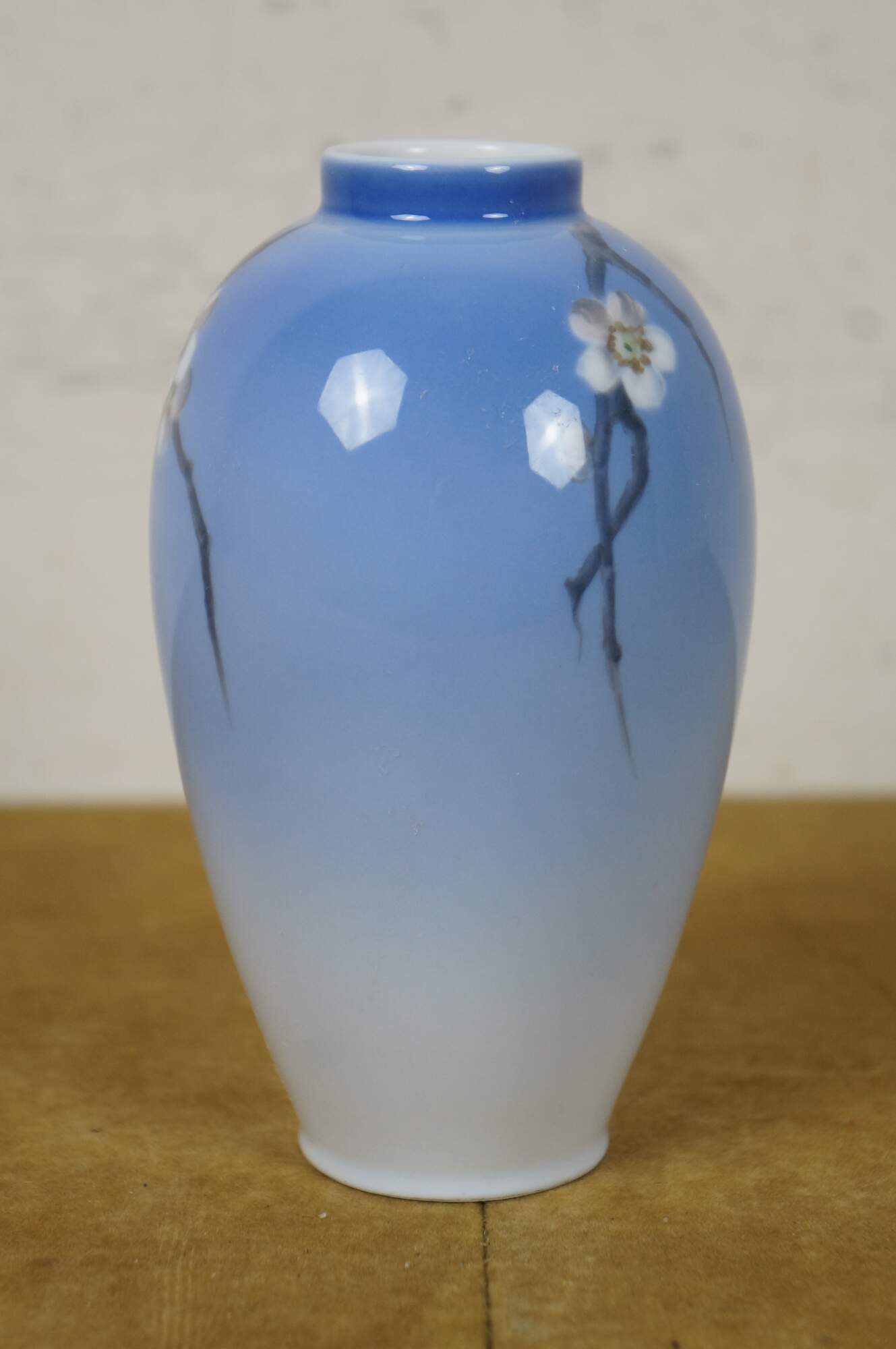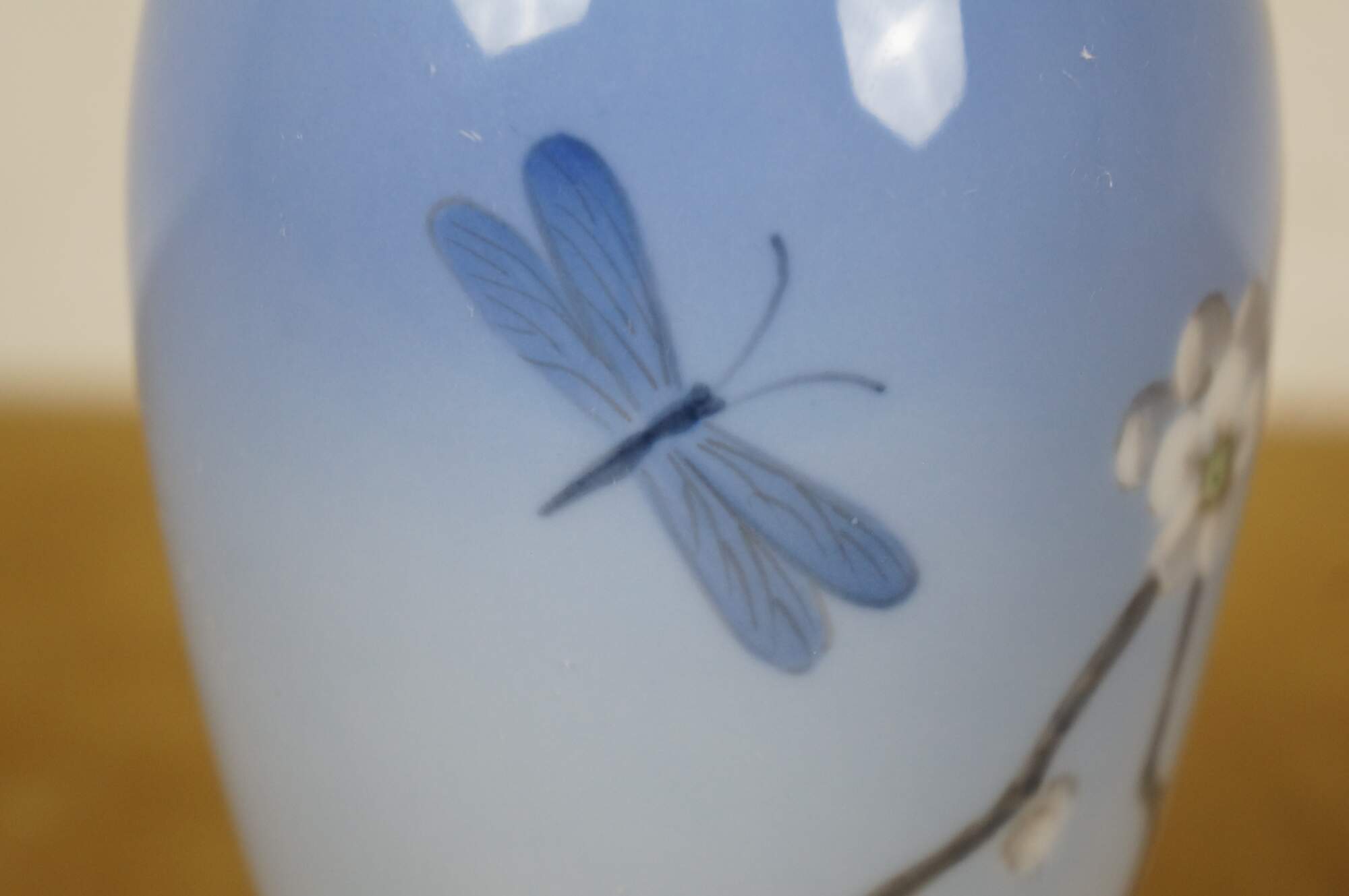 Mid century, 1969-1973, Royal Copenhagen flower vase - 2K / 2301 / 47B. Oblong shape with short narrowed neck, decorated with a blue to white ombre, painted under the glaze with a branch of white cherry blossoms and a blue dragonfly.