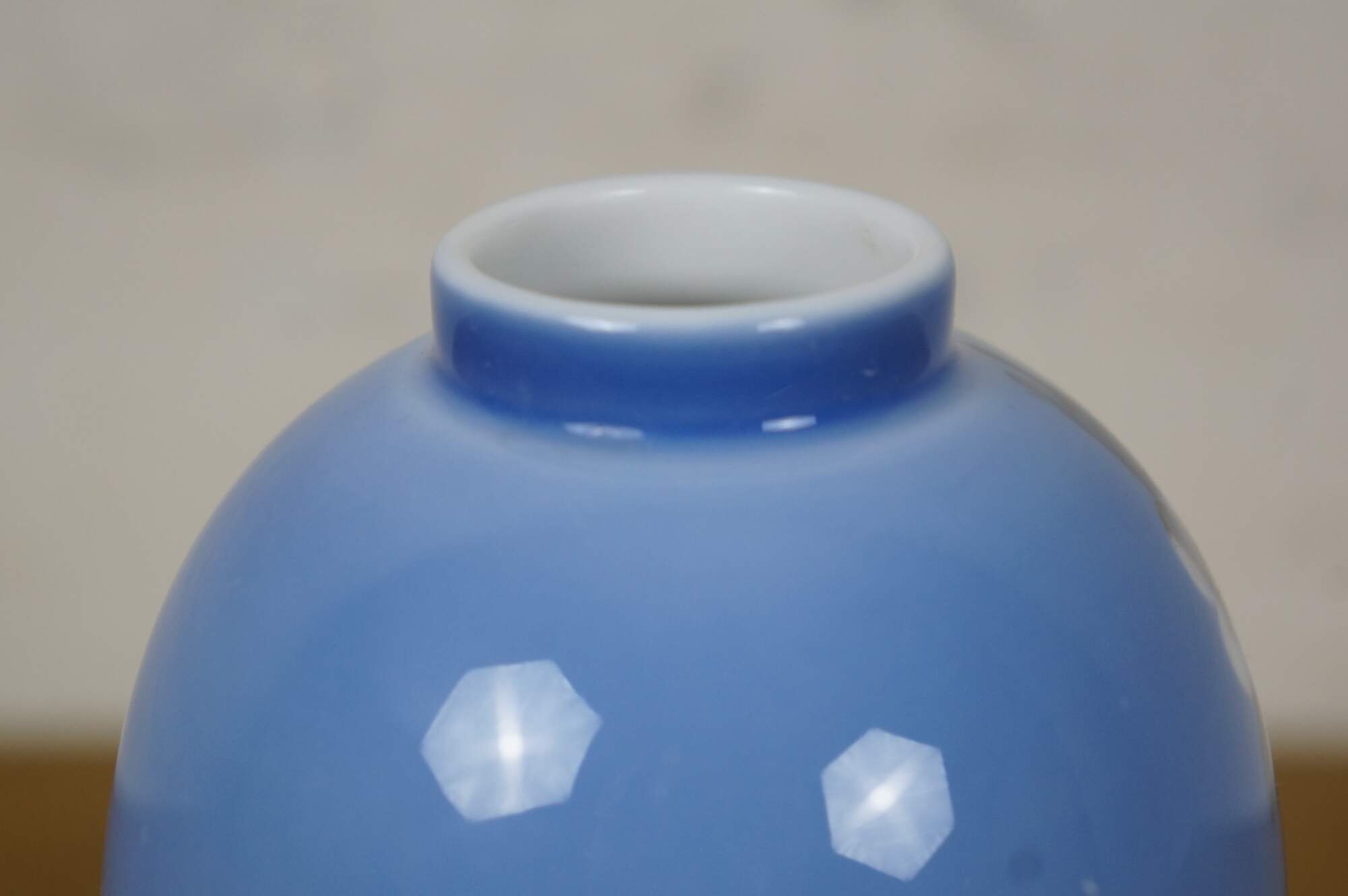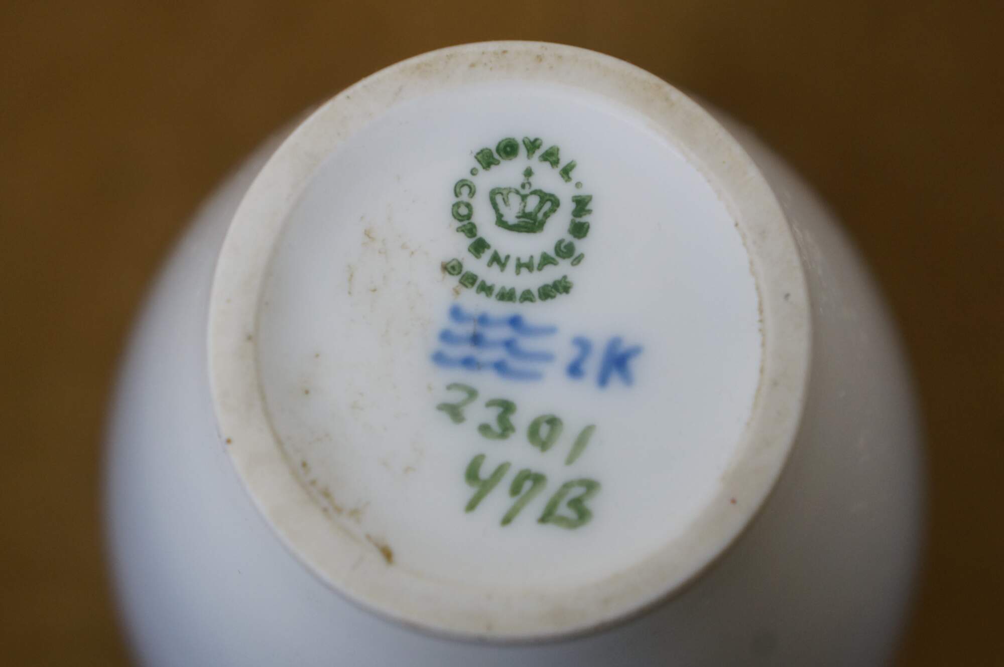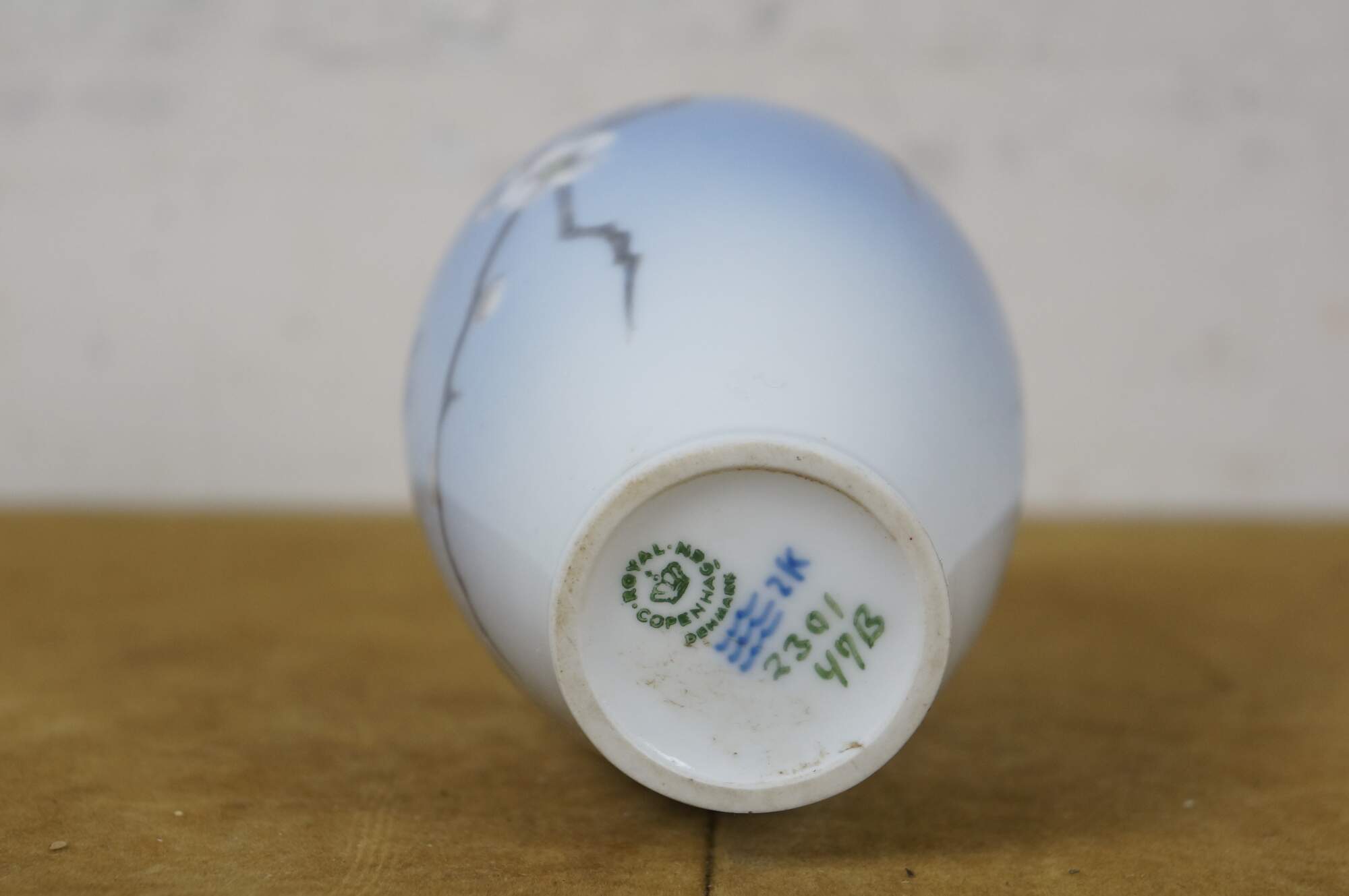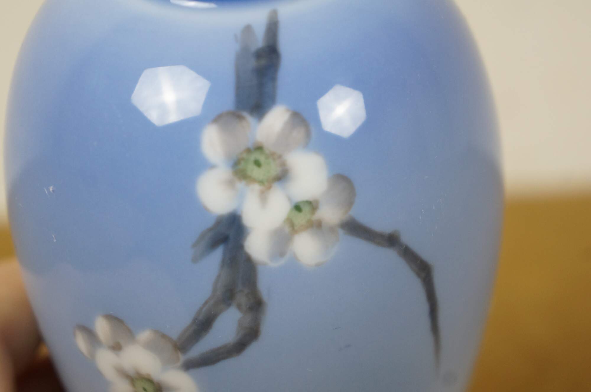 Mid century, 1969-1973, Royal Copenhagen flower vase - 2K / 2301 / 47B. Oblong shape with short narrowed neck, decorated with a blue to white ombre, painted under the glaze with a branch of white cherry blossoms and a blue dragonfly.