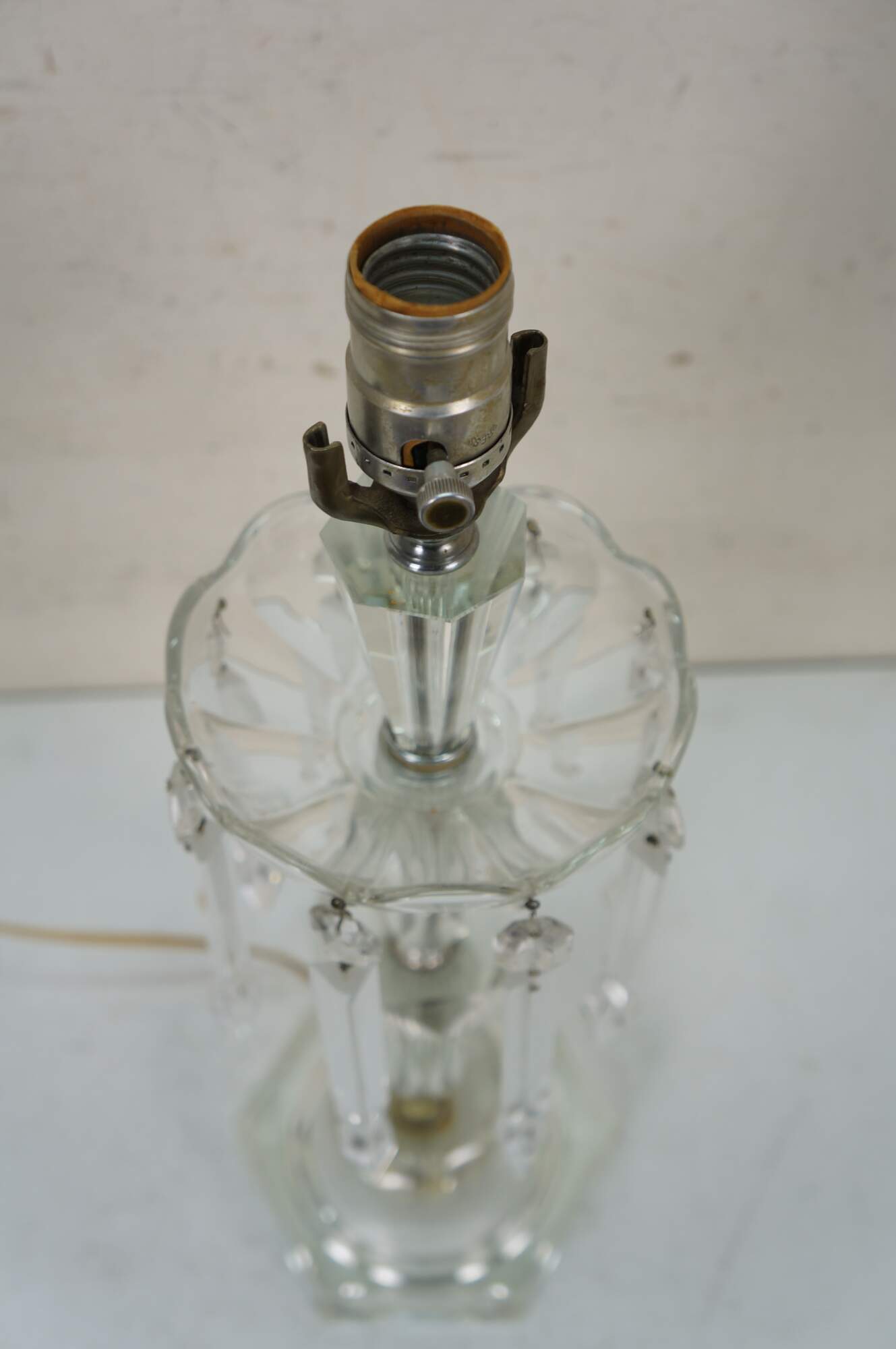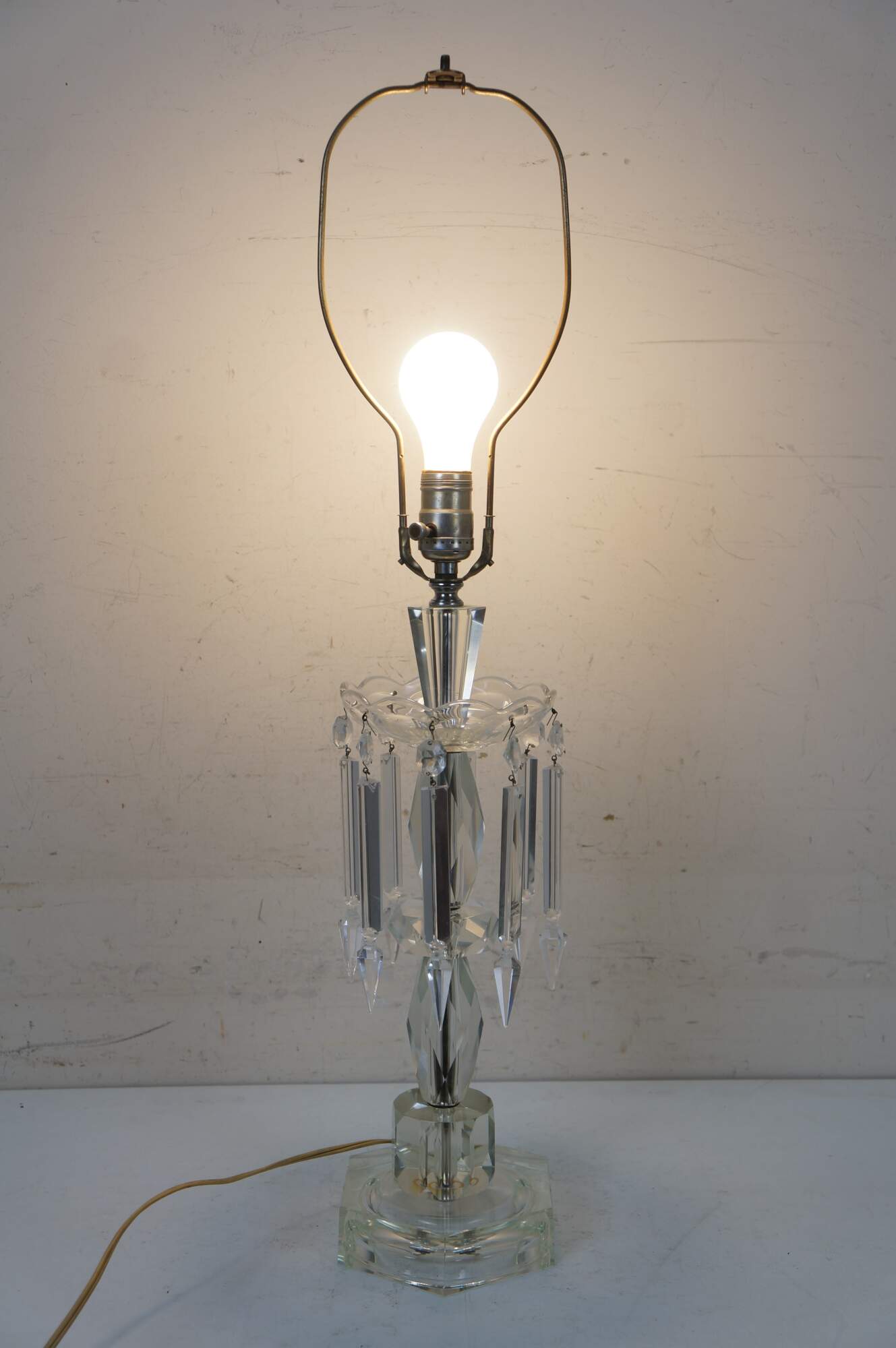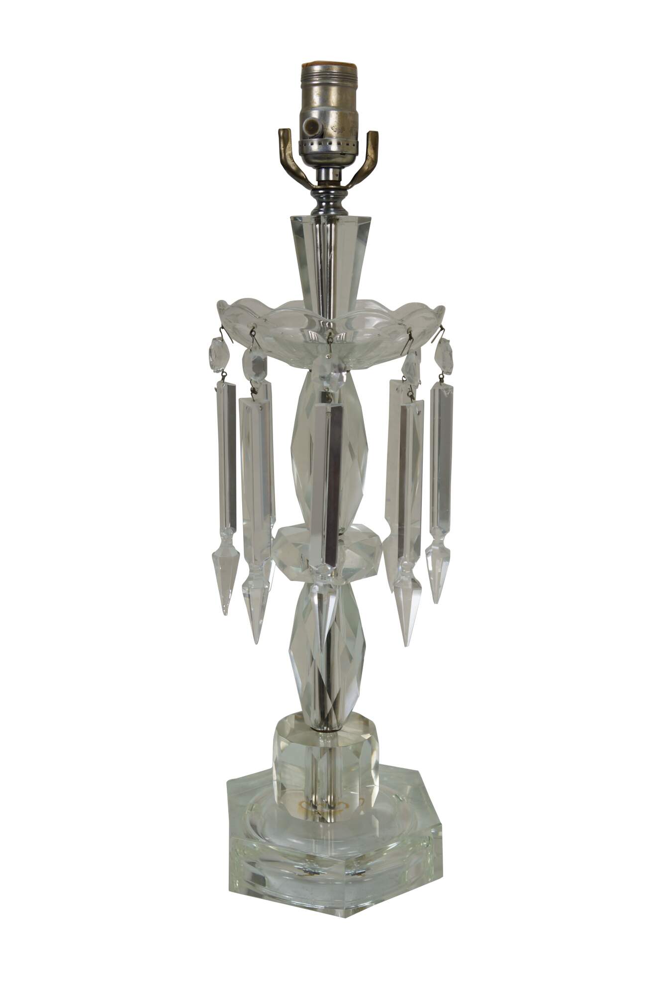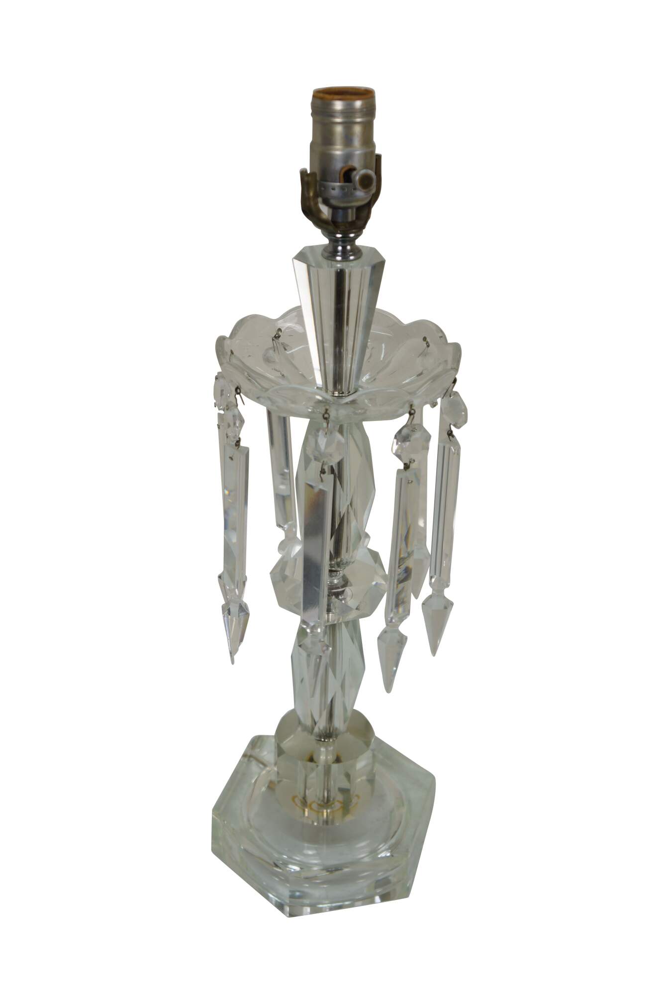 Circa mid 20th century drop crystal luster table lamp - hexagonal crystal base and stacked faceted crystal body with scalloped candle cup shaped top hung with 8 cut drop crystals. Includes harp. No finial, no shade.