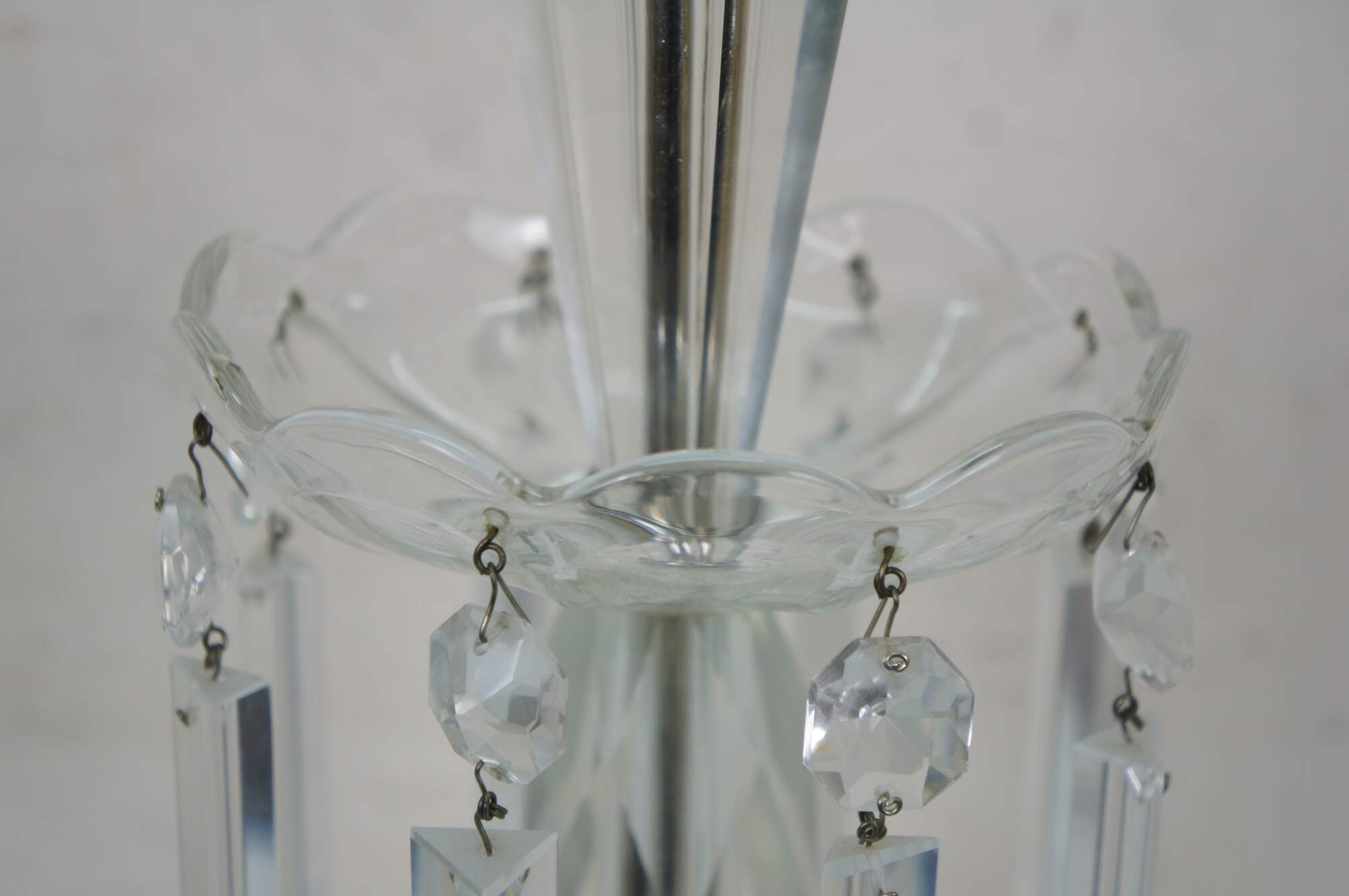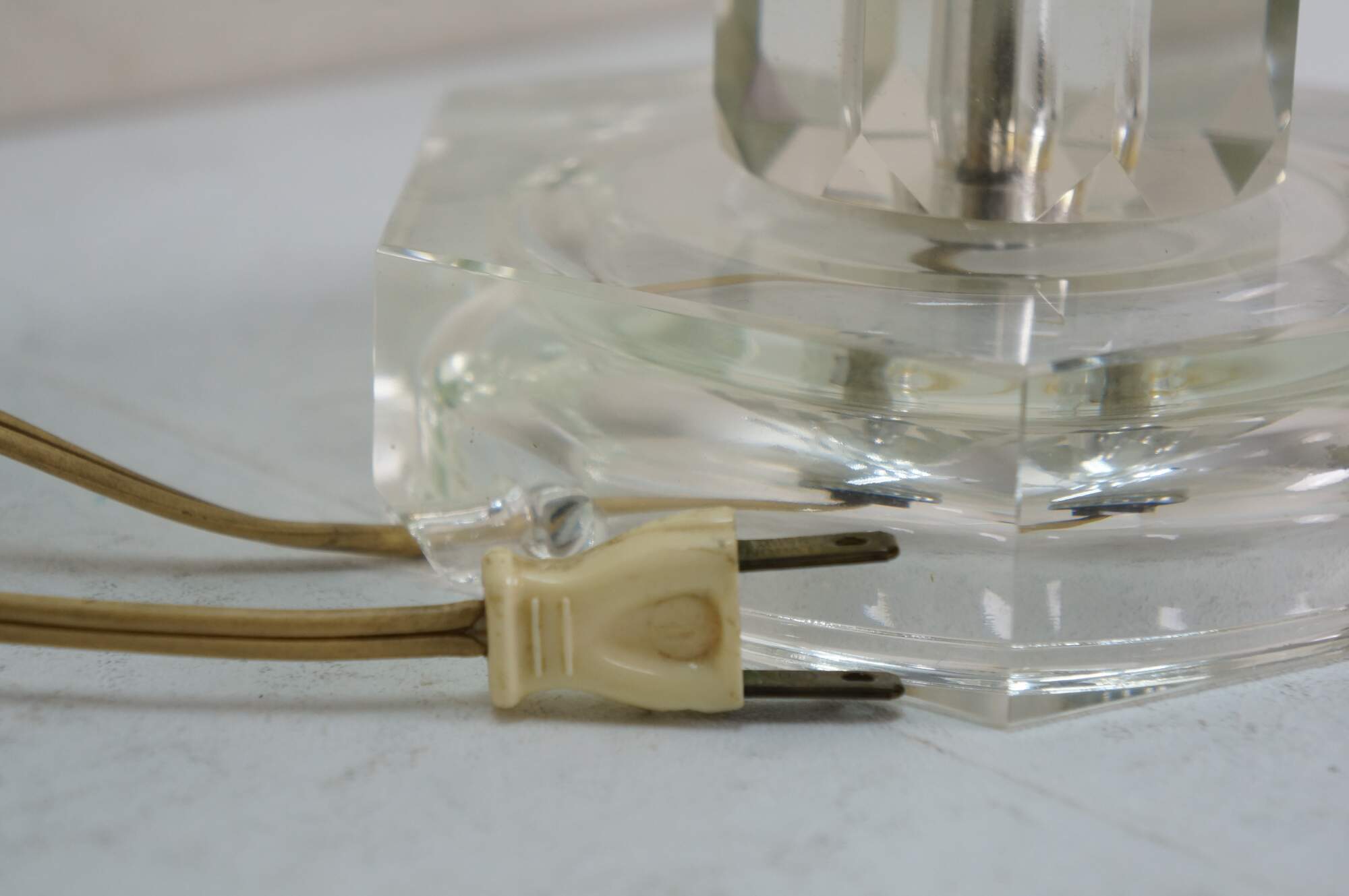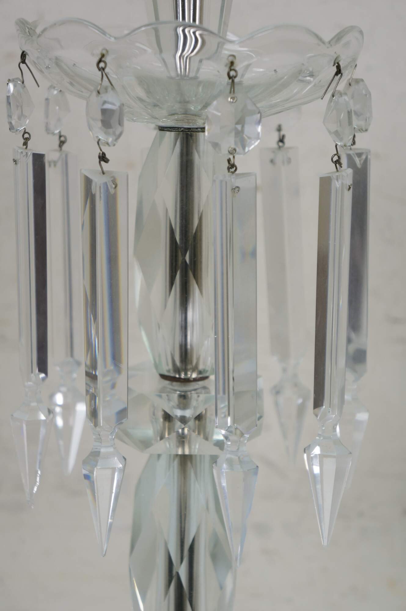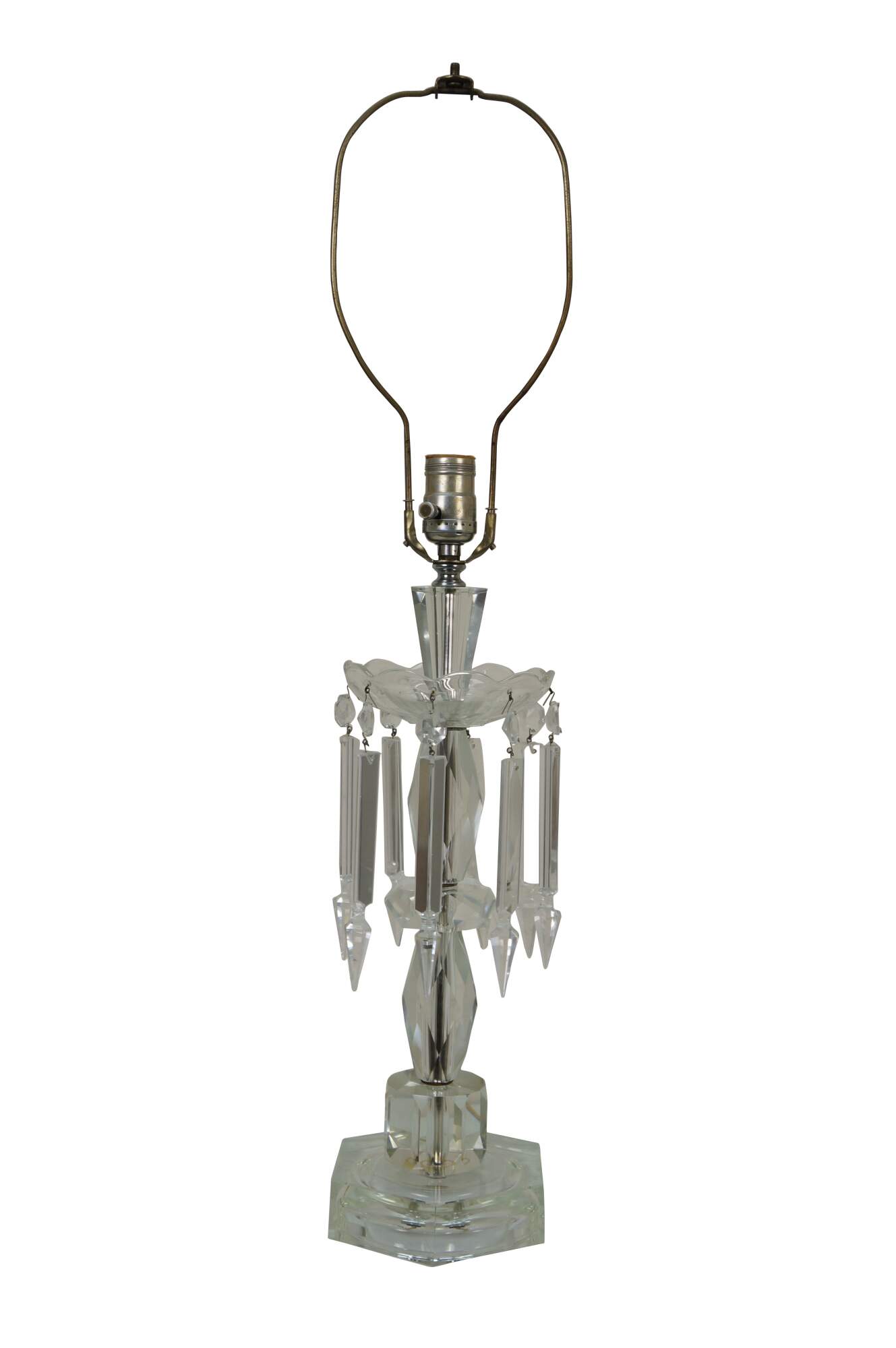 Circa mid 20th century drop crystal luster table lamp - hexagonal crystal base and stacked faceted crystal body with scalloped candle cup shaped top hung with 8 cut drop crystals. Includes harp. No finial, no shade.