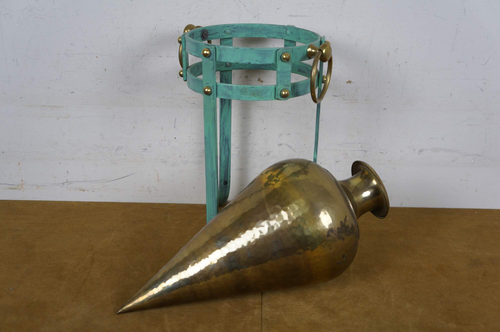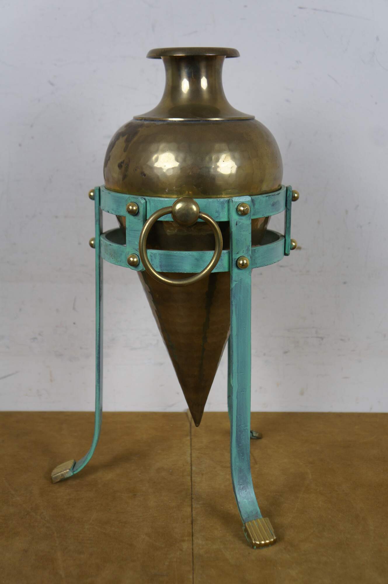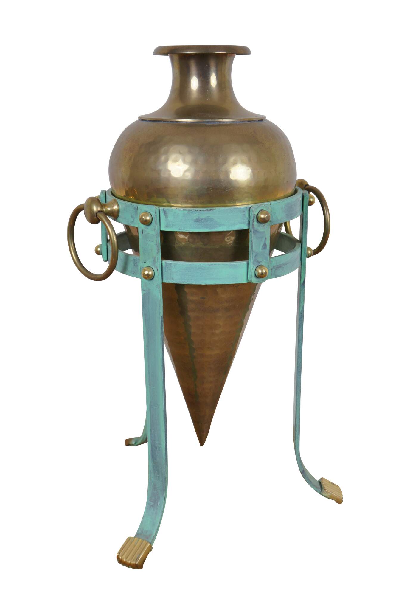 Late 20th century amphora mantel vase and stand. Hammered brass vessel with pointed base and tapered neck, held in a three legged tripod metal stand, painted verdigris green accented with grooved brass feet, studs, and two ring handles.