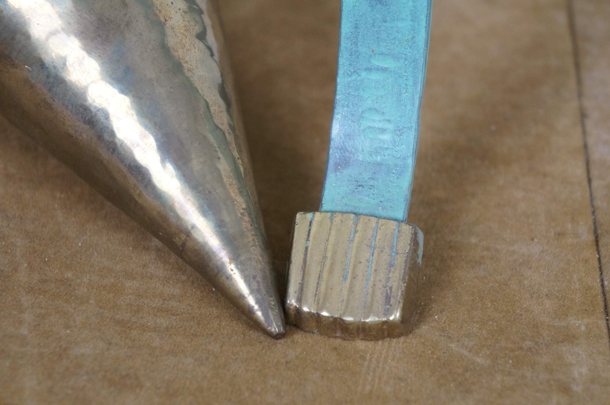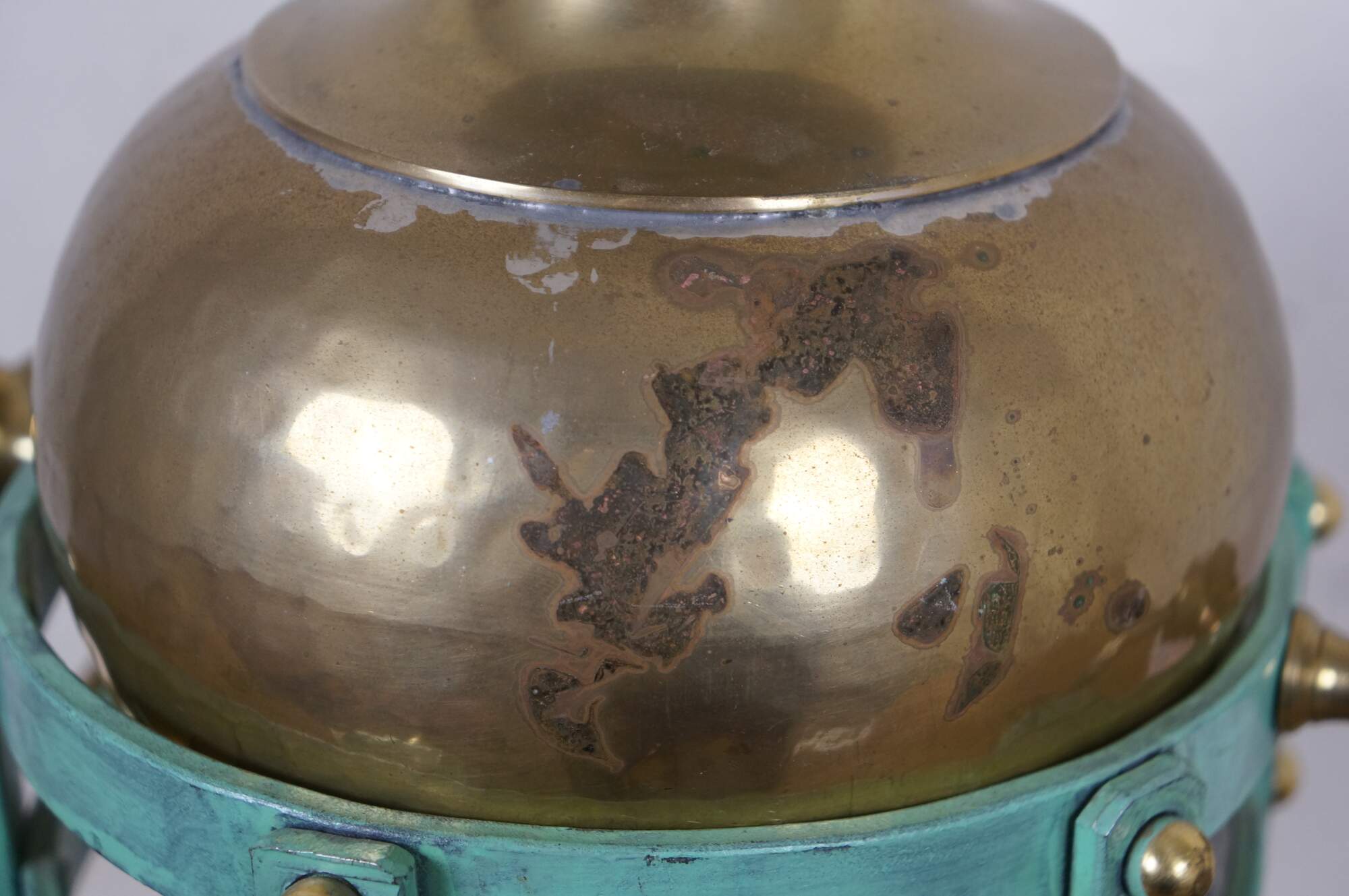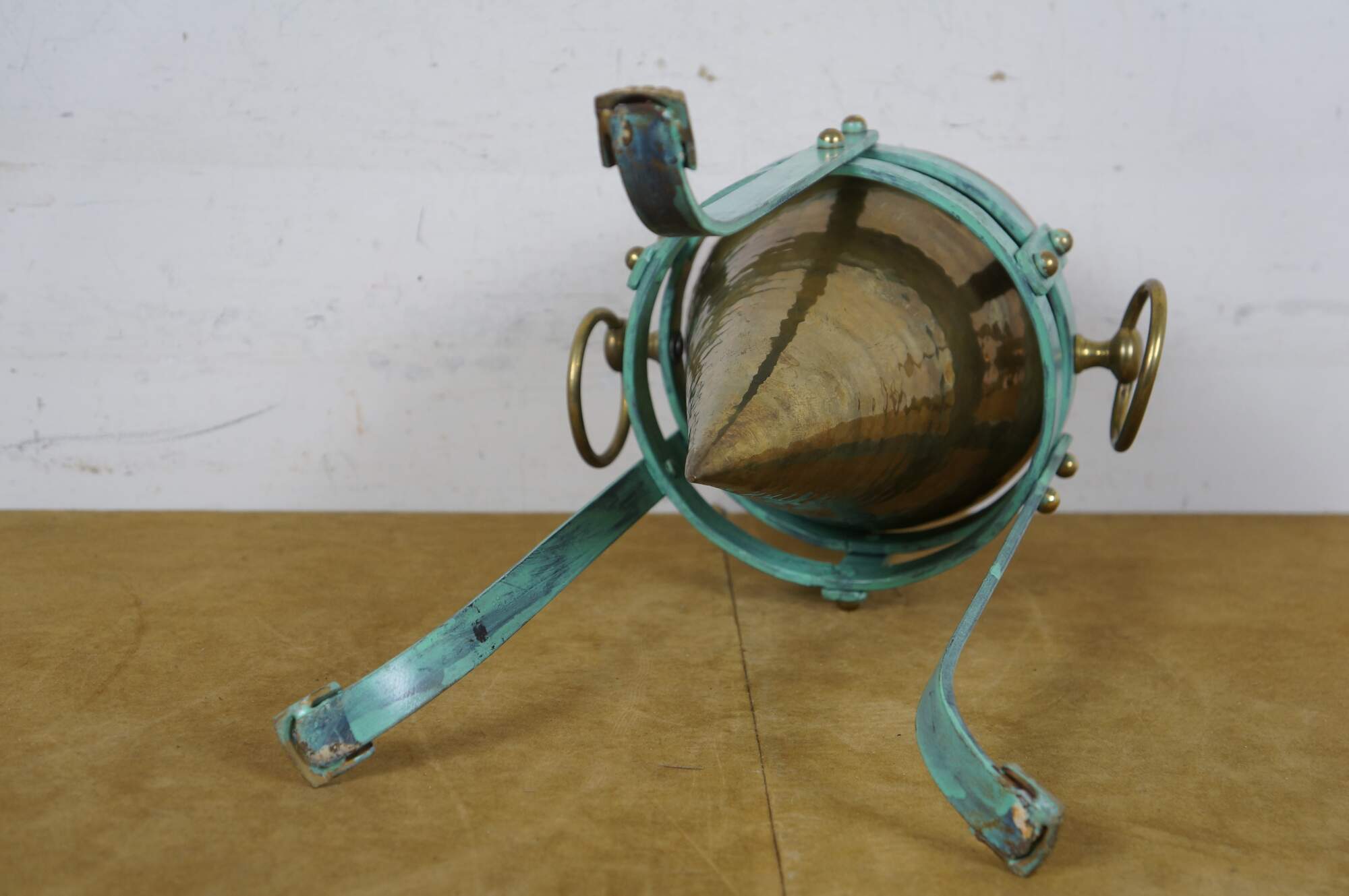 Late 20th century amphora mantel vase and stand. Hammered brass vessel with pointed base and tapered neck, held in a three legged tripod metal stand, painted verdigris green accented with grooved brass feet, studs, and two ring handles.