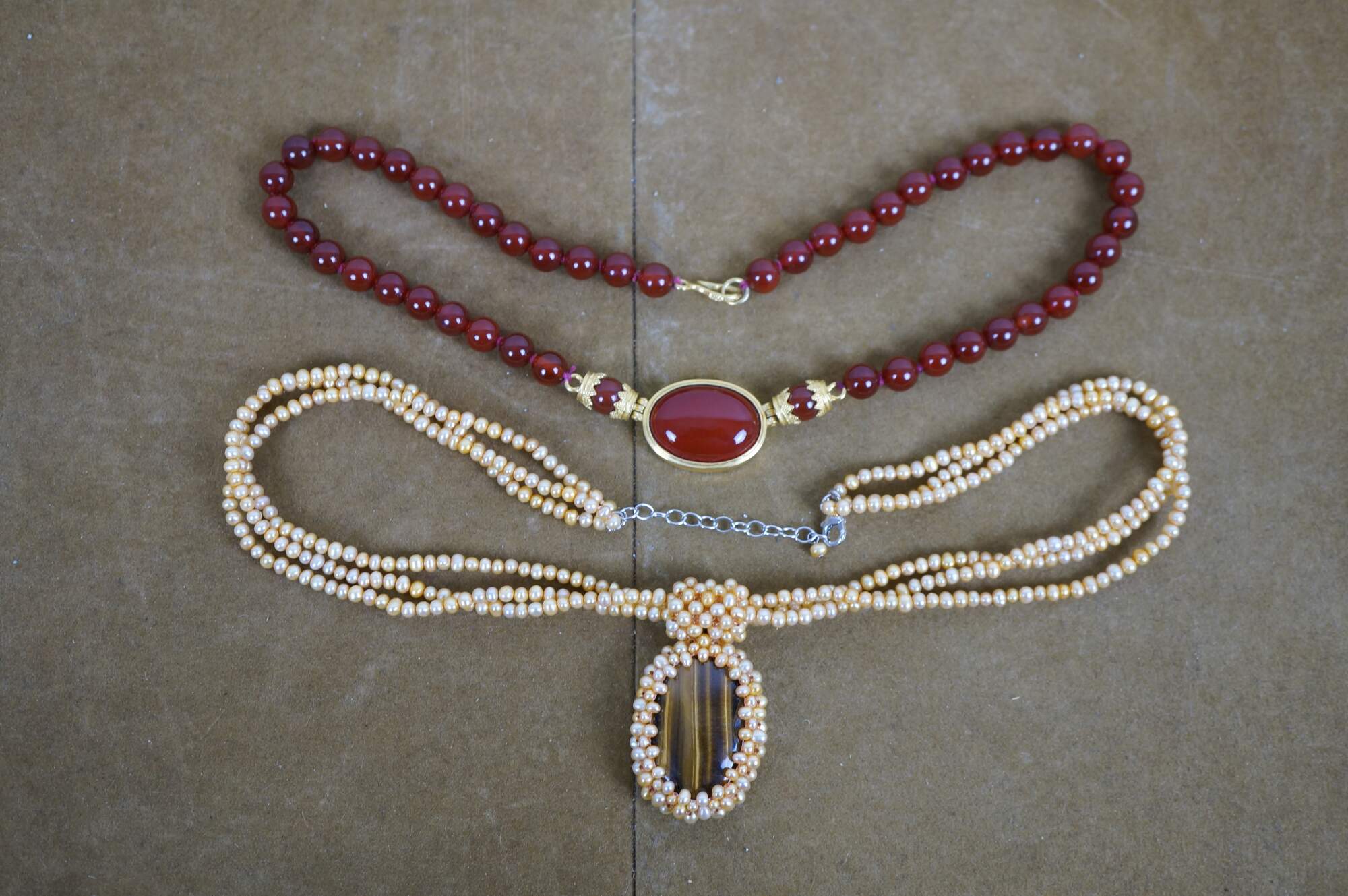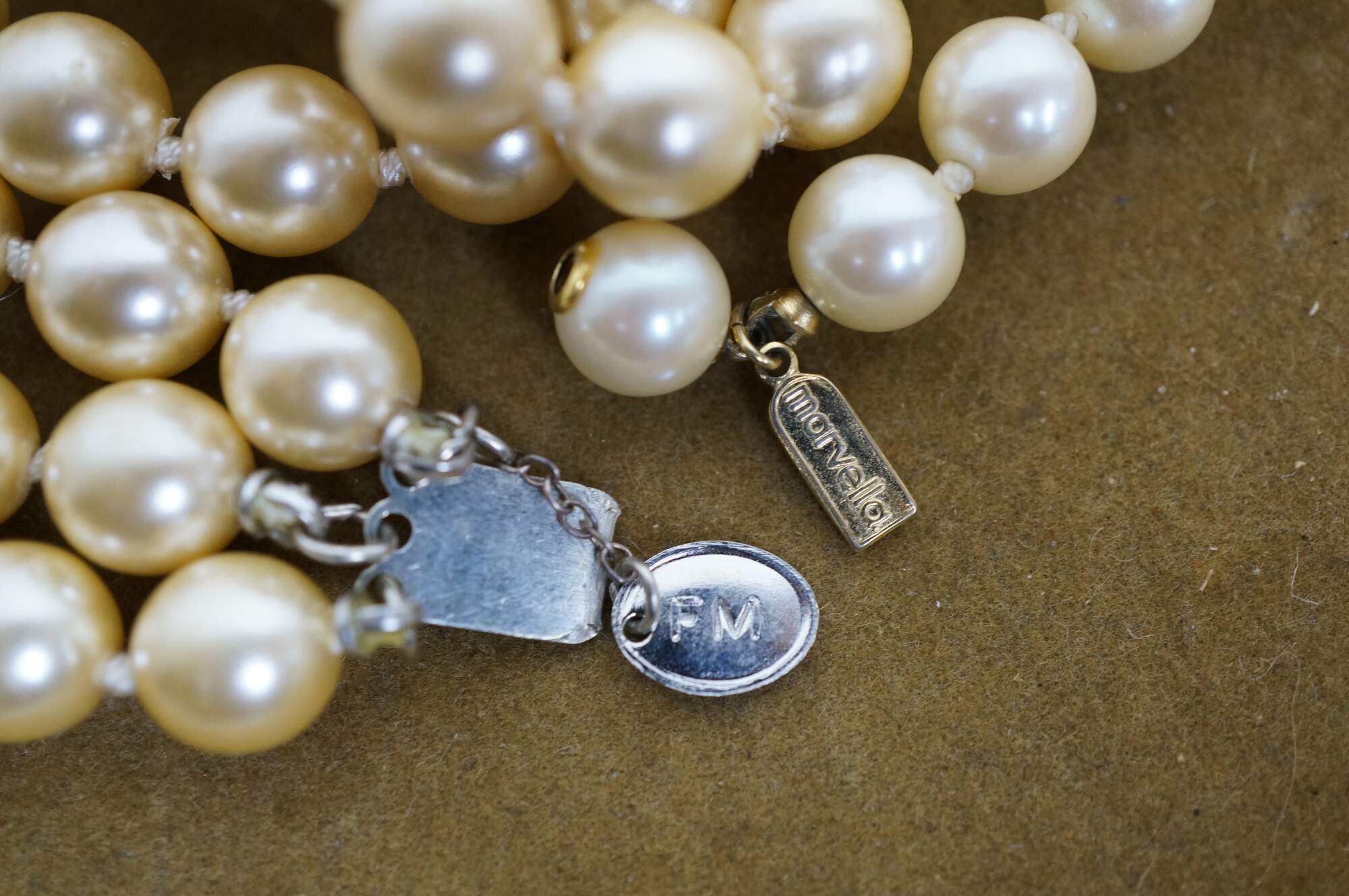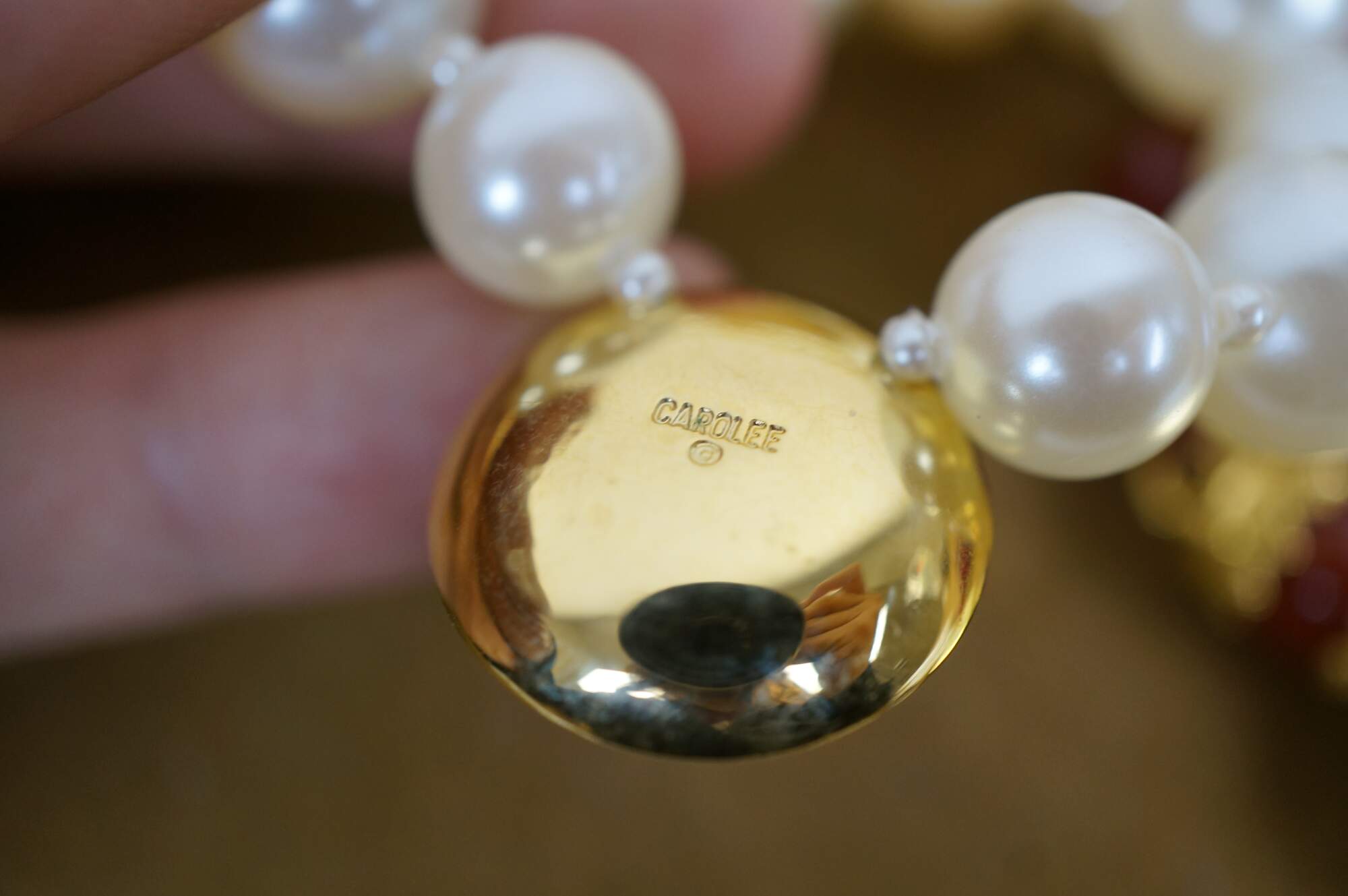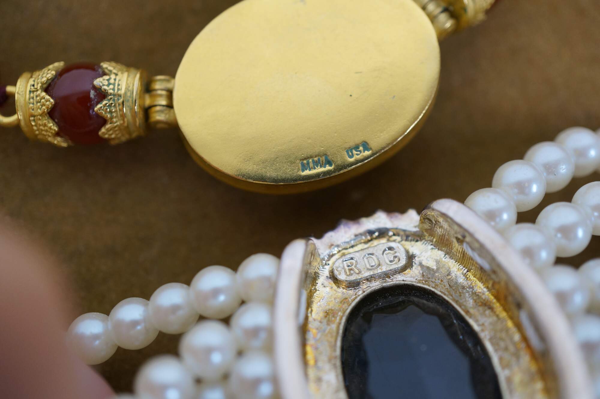 Lot of 20 mid to late 20th century beaded layered and choker style necklaces in a variety of colors. Brands include Marvella, FM, Carolee, MMA, RDC. Several Made in Japan.