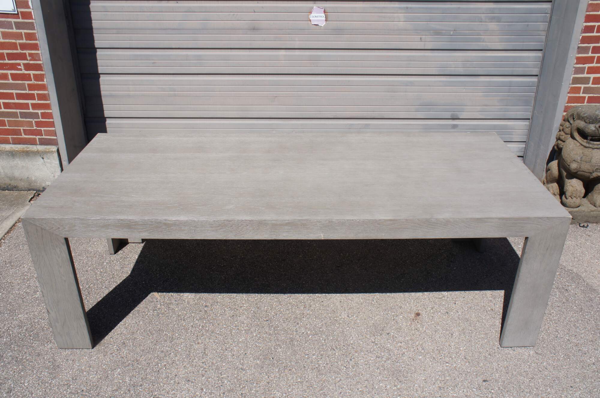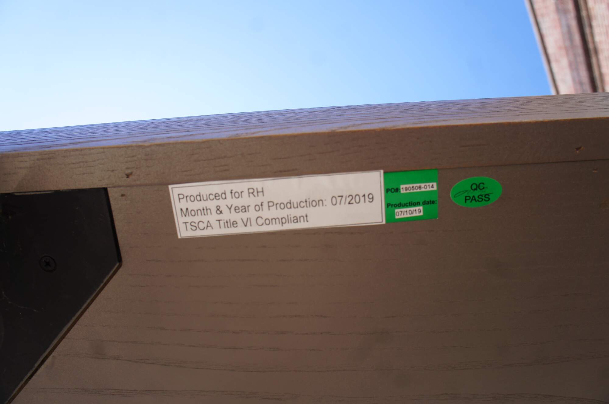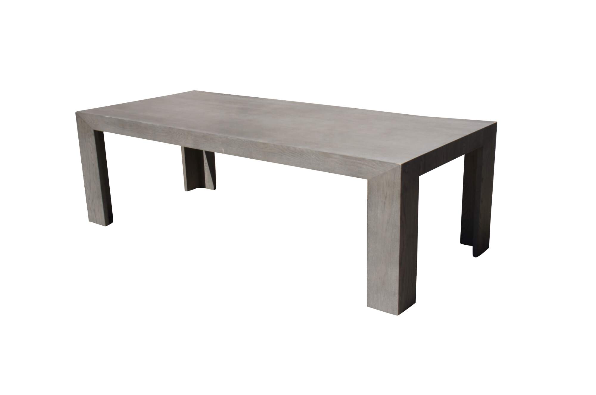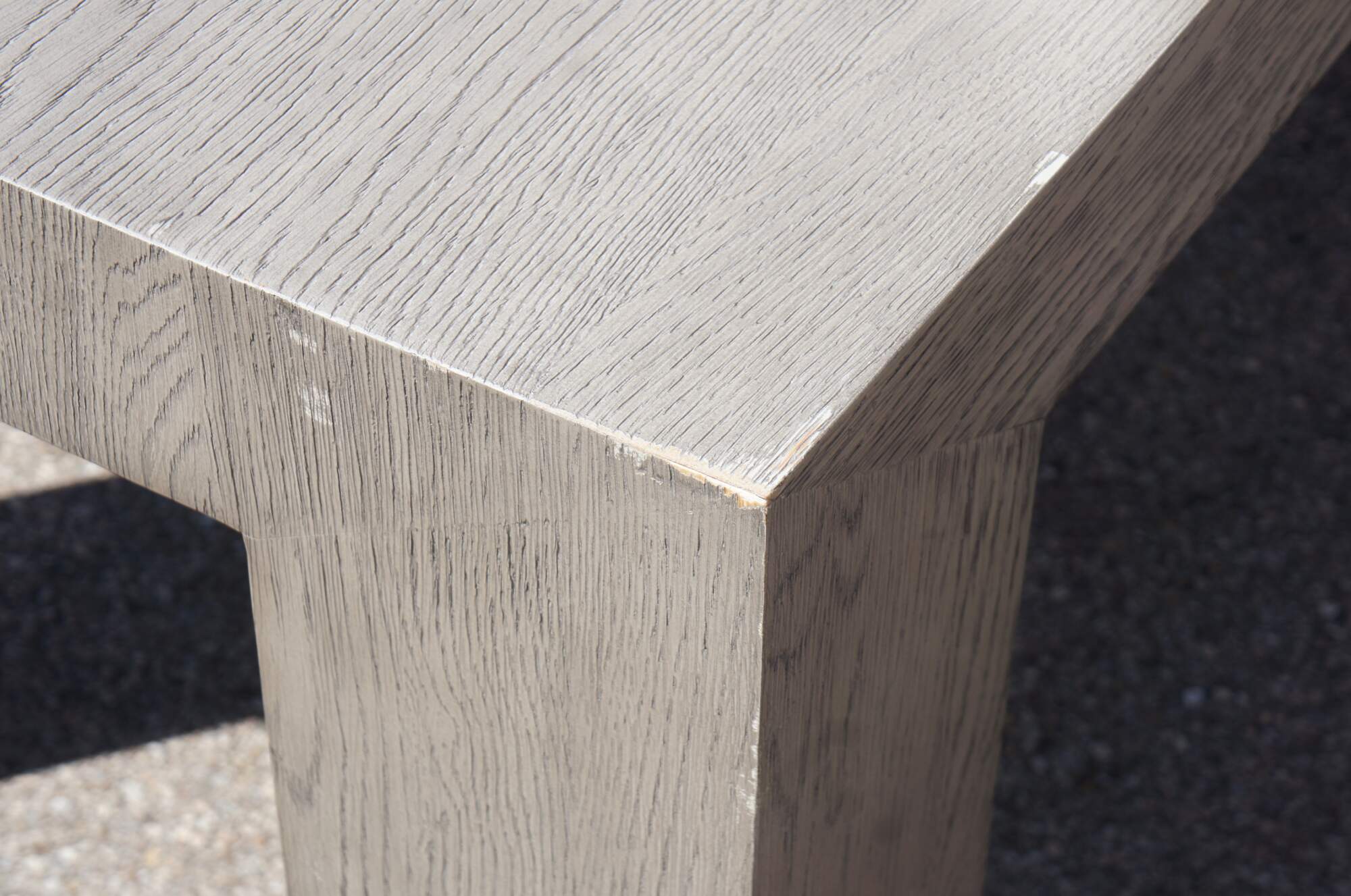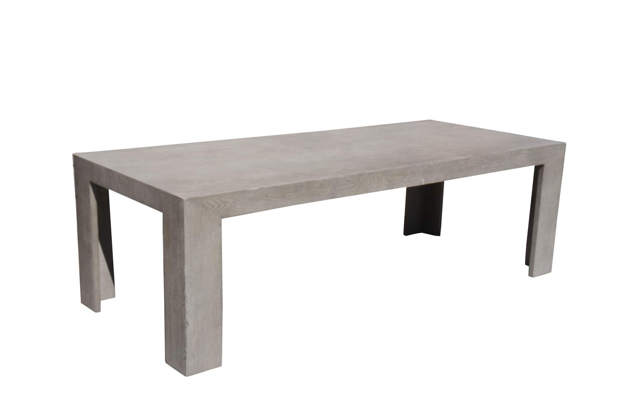 Restoration Hardware Machinto Dining Table. Features a rectangular Parsons-style form made of oak veneer with a grey form. Circa 2019.