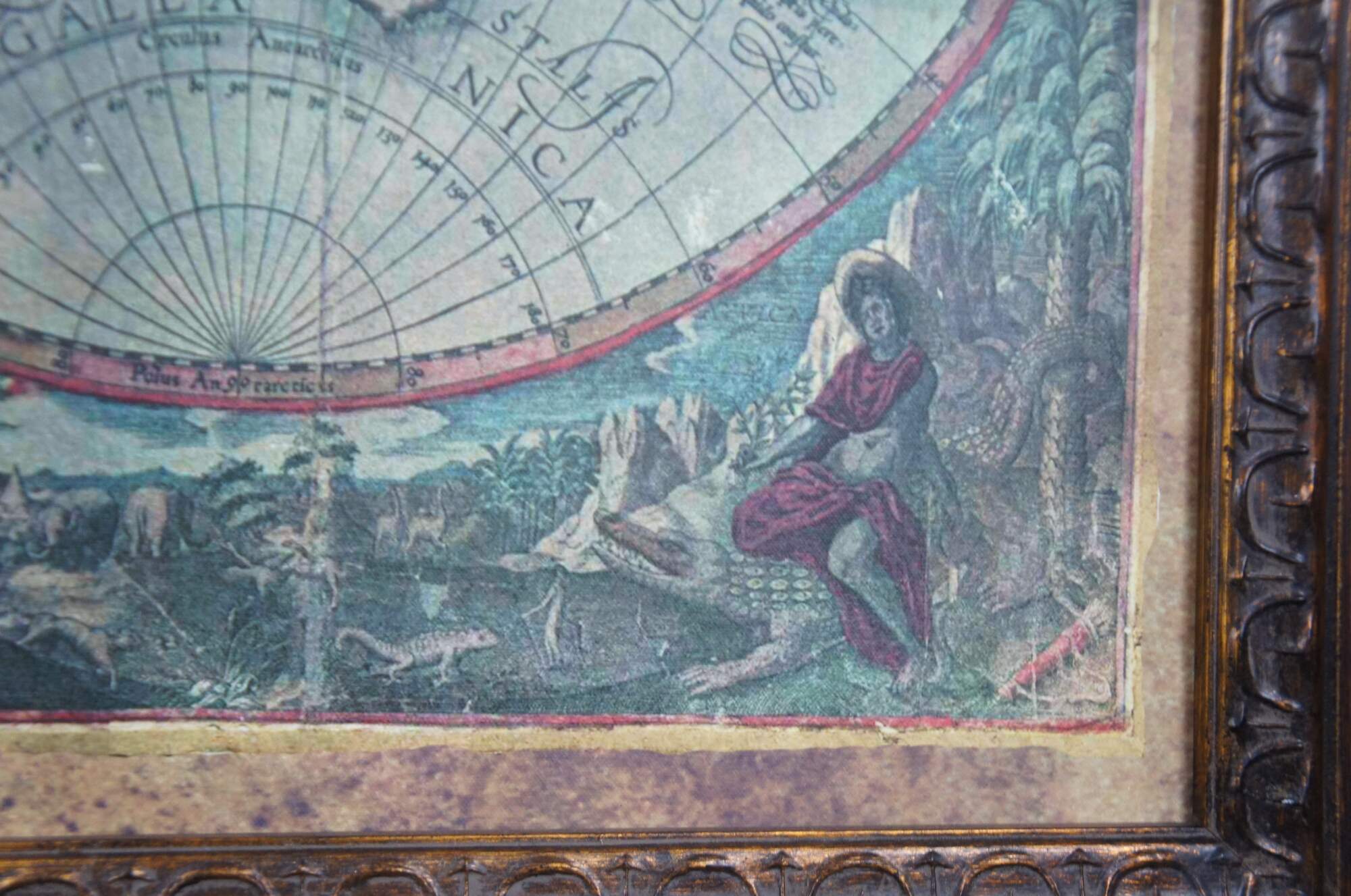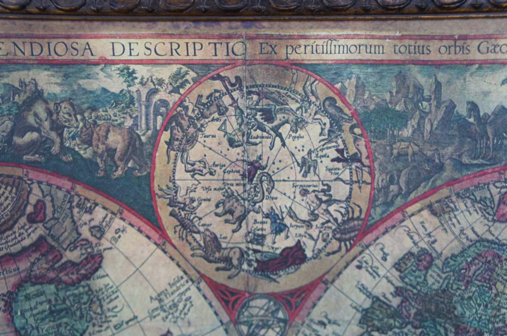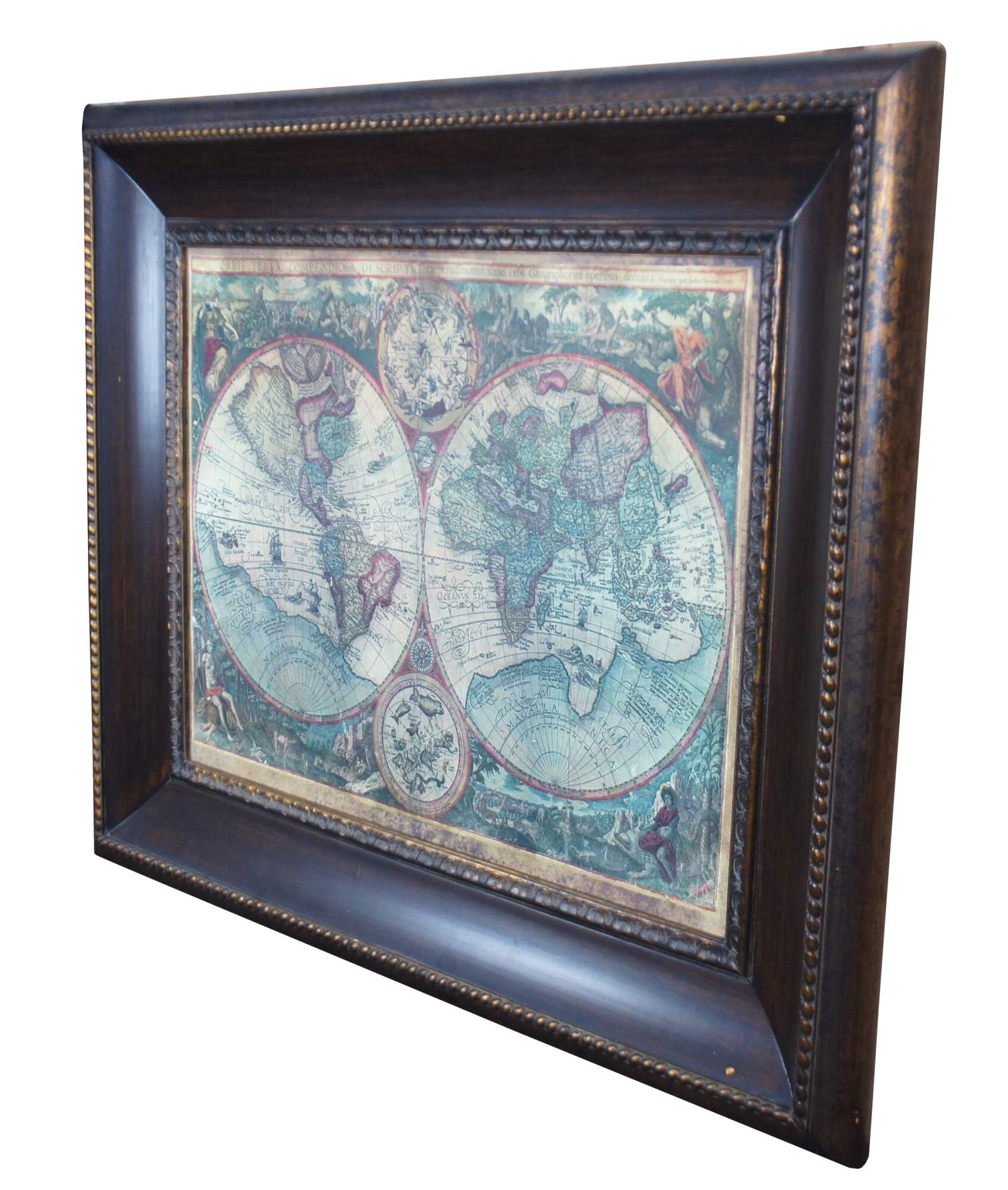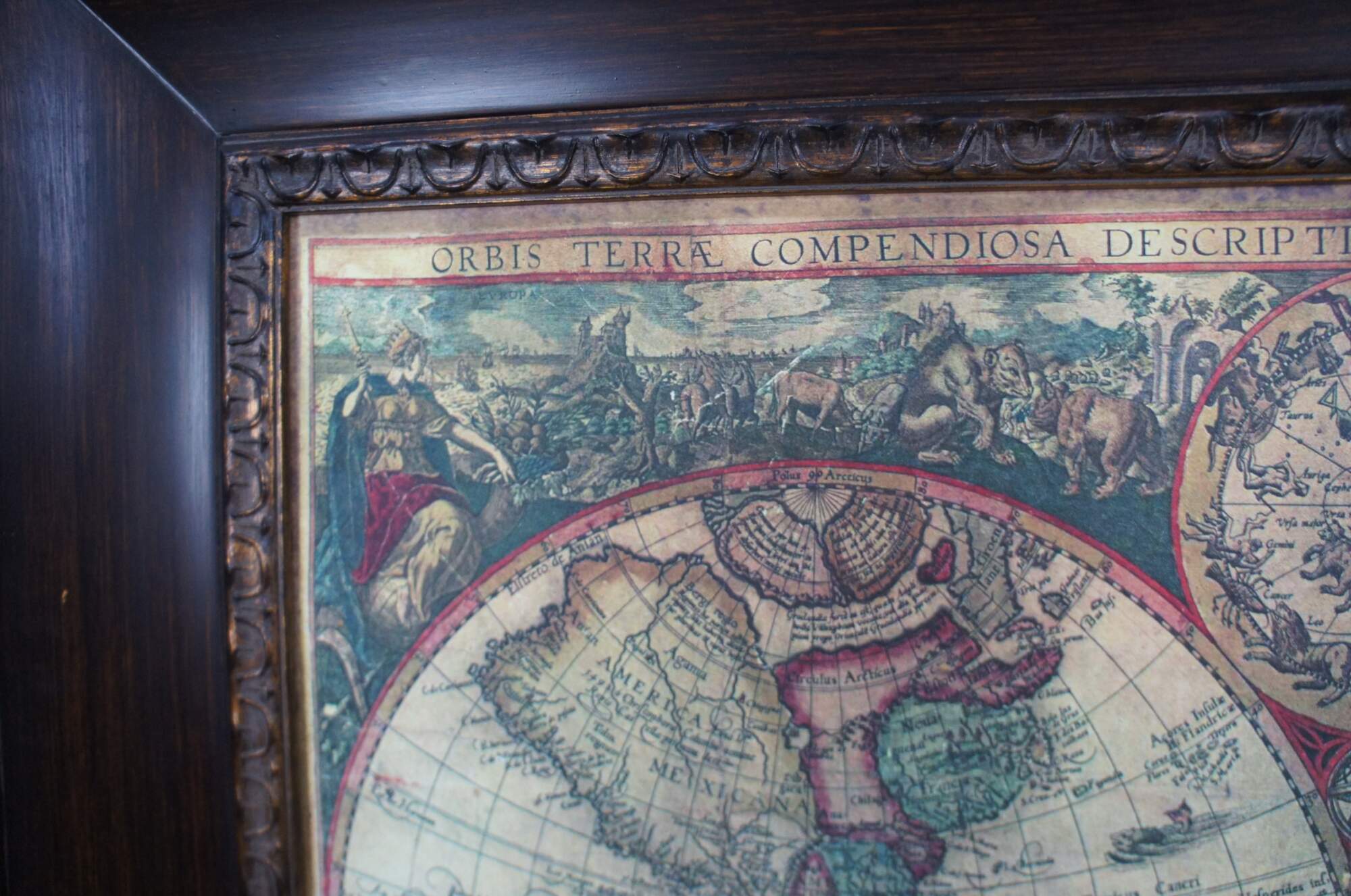 21st Century canvas print double hemisphere map of the World Johannes Baptista Vrients. This was second earliest printed map of the world to include allegorical vignettes around the two hemispheres. Framed in wood with beveling and gold trim