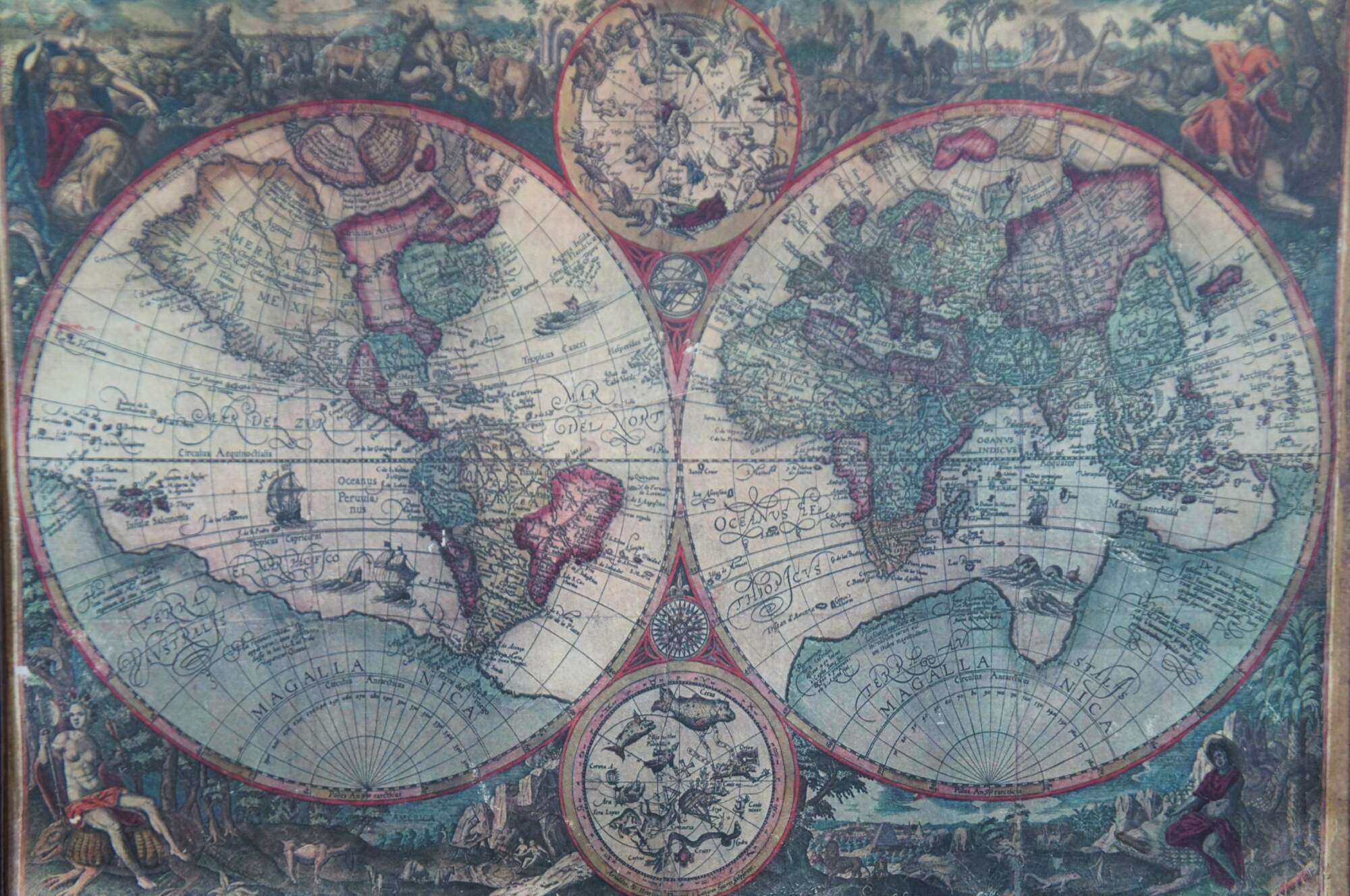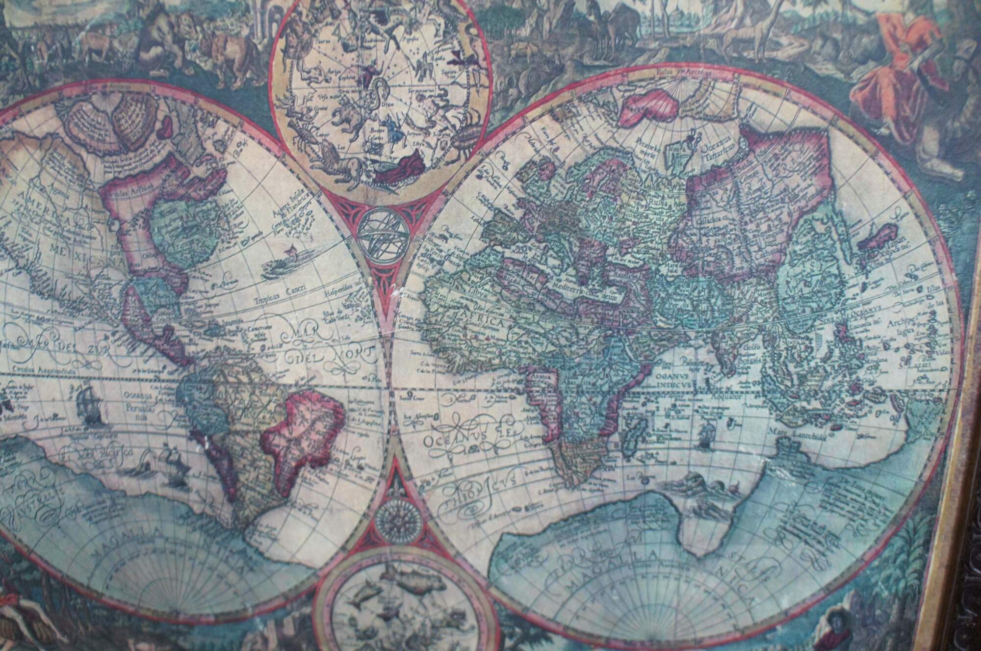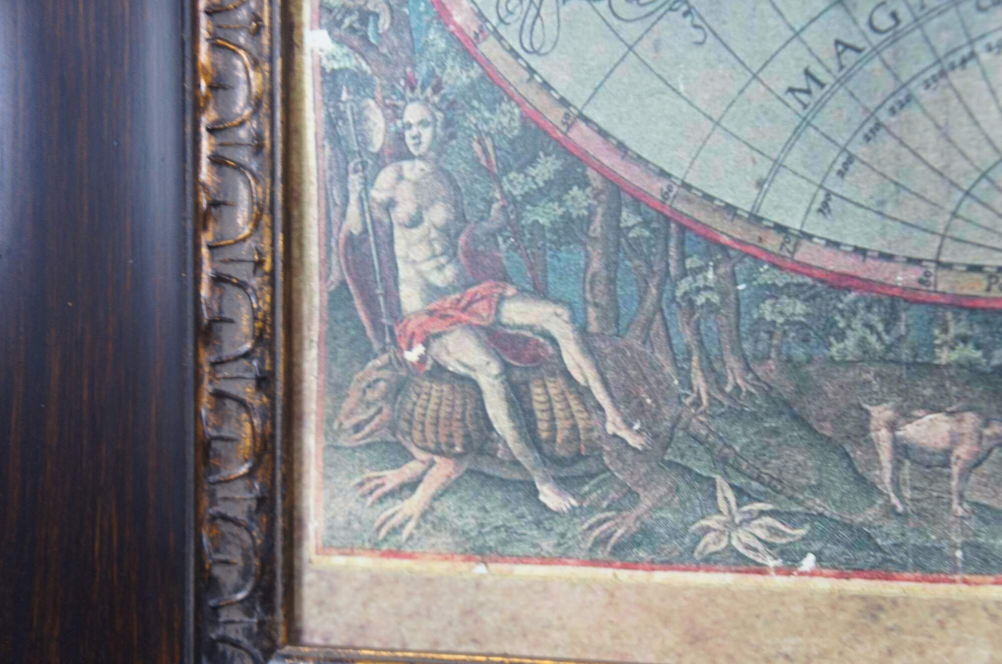 21st Century canvas print double hemisphere map of the World Johannes Baptista Vrients. This was second earliest printed map of the world to include allegorical vignettes around the two hemispheres. Framed in wood with beveling and gold trim