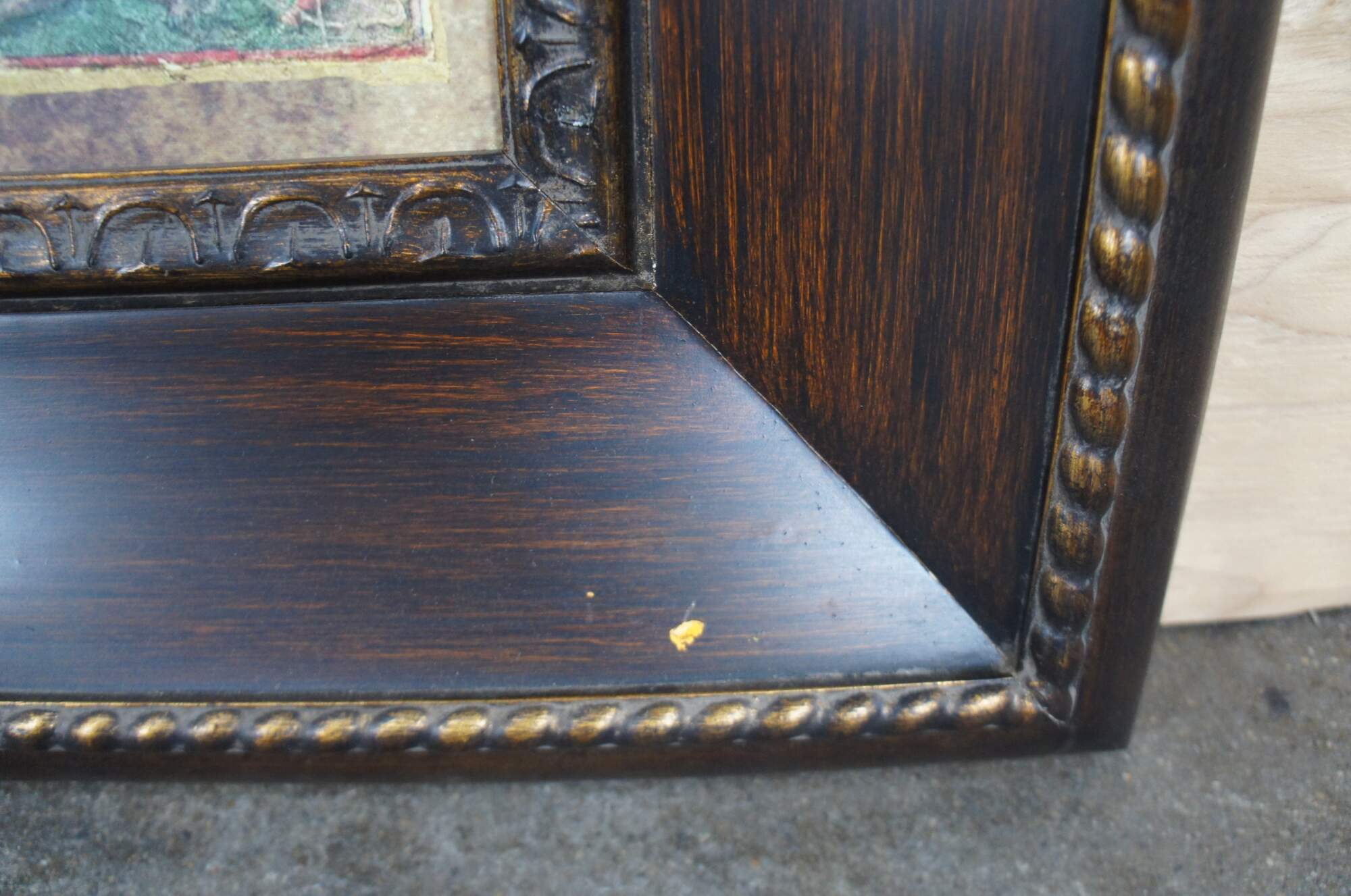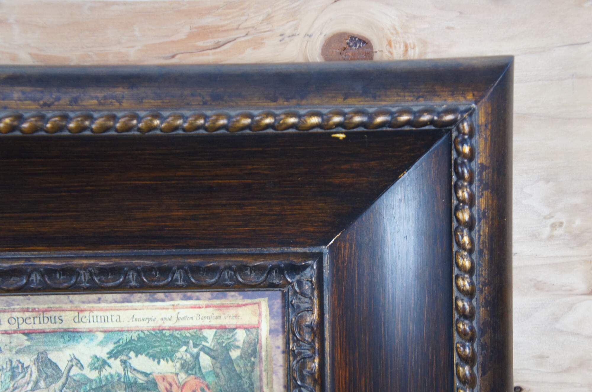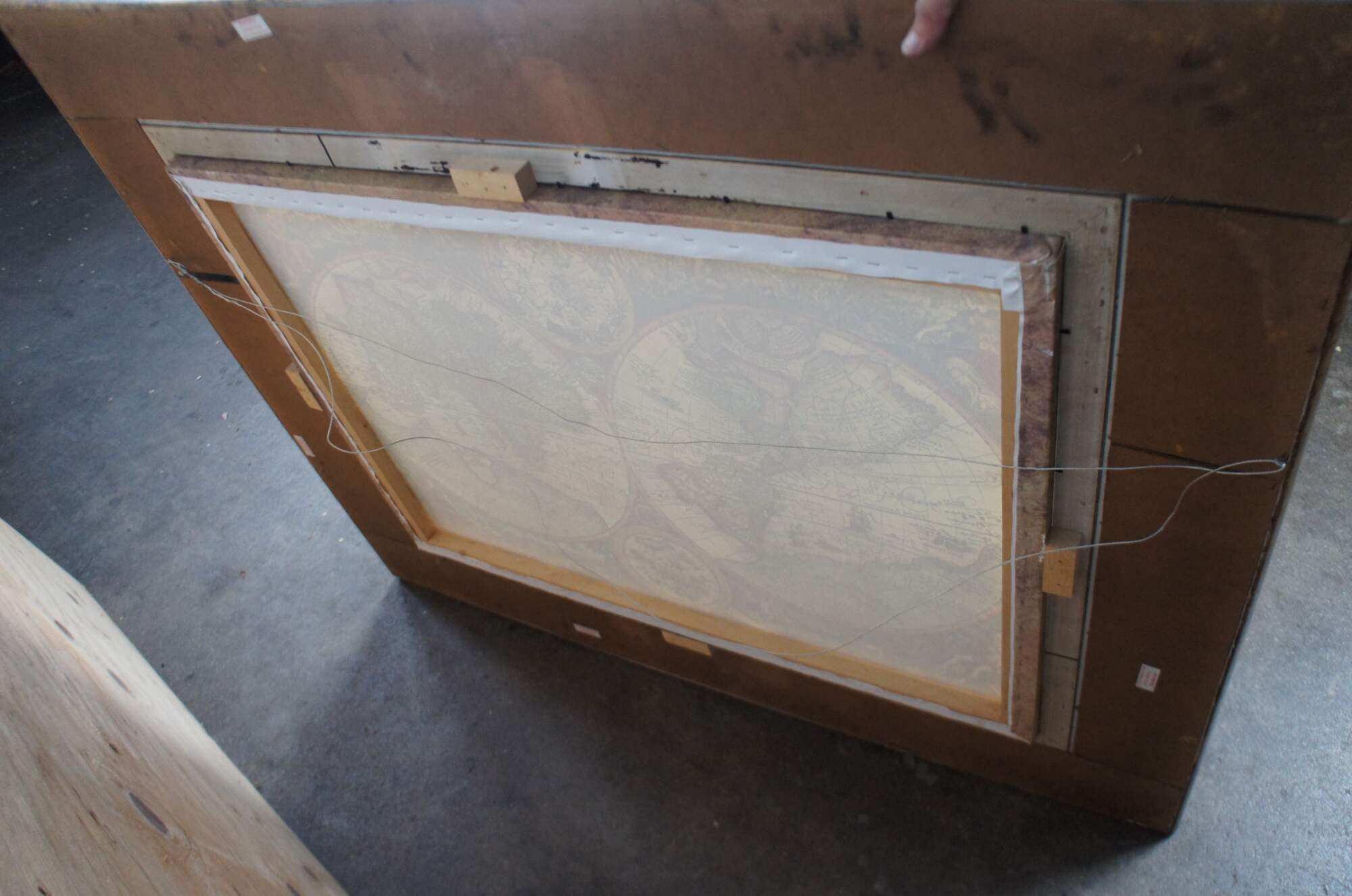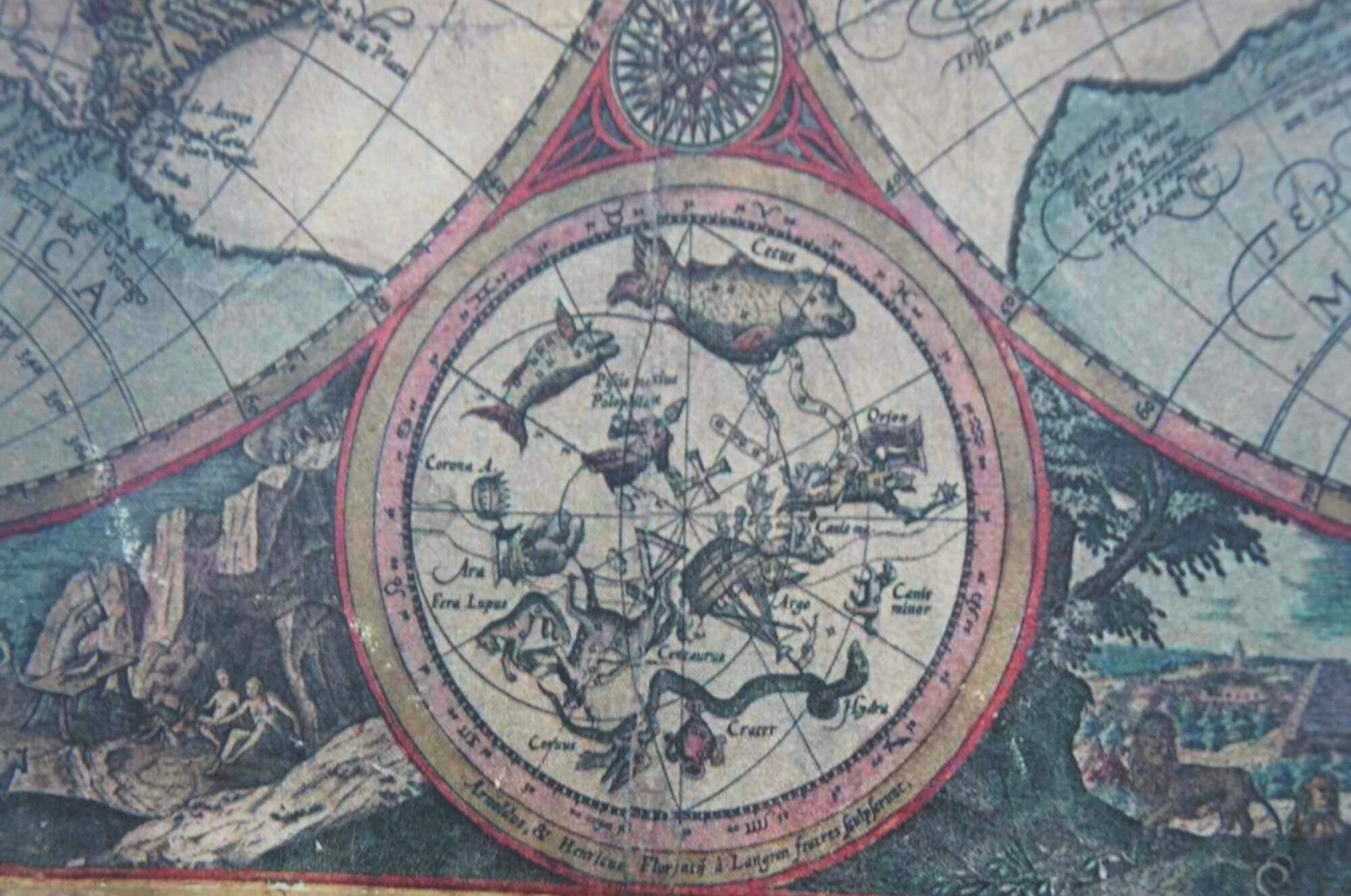 21st Century canvas print double hemisphere map of the World Johannes Baptista Vrients. This was second earliest printed map of the world to include allegorical vignettes around the two hemispheres. Framed in wood with beveling and gold trim