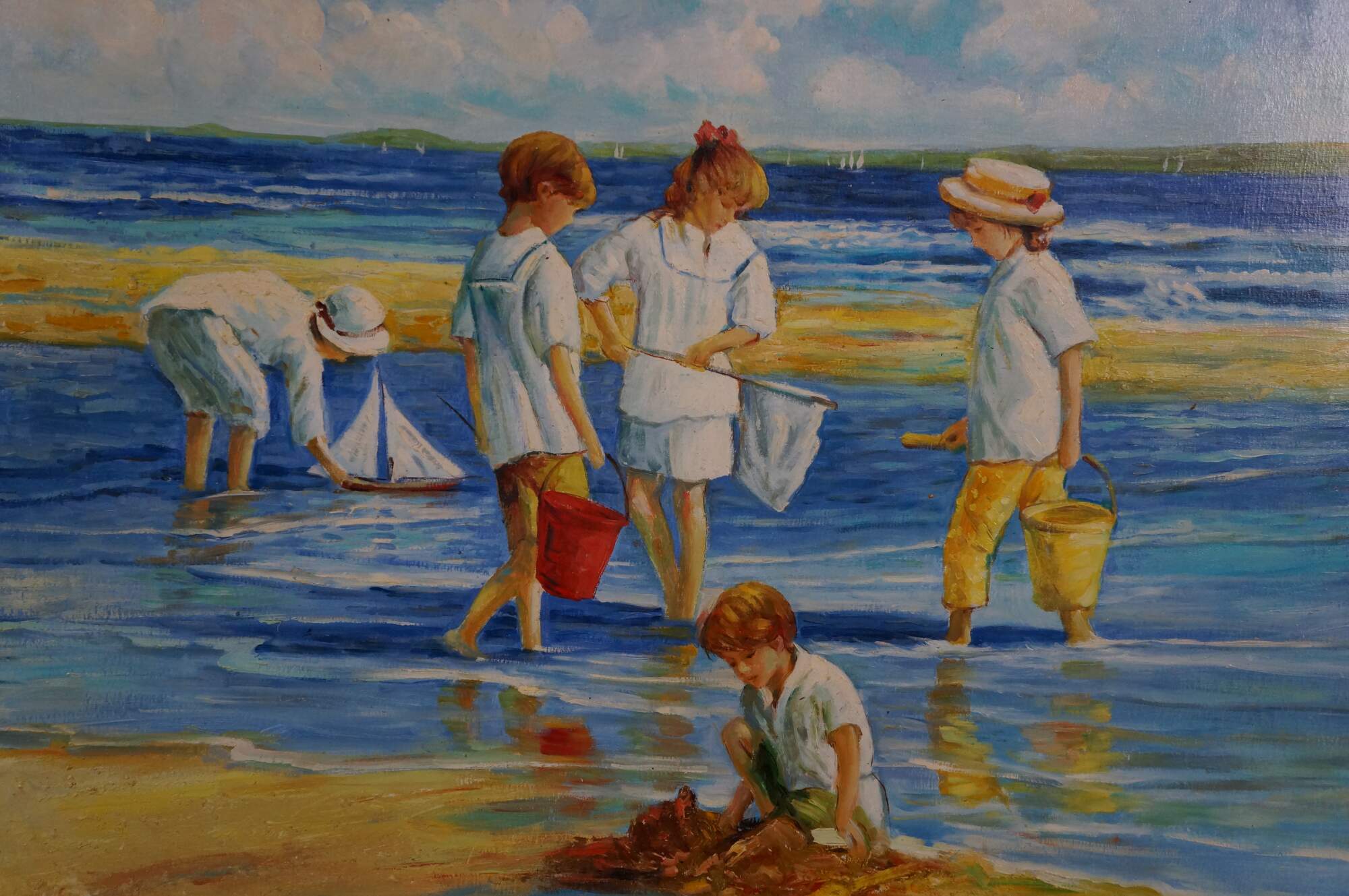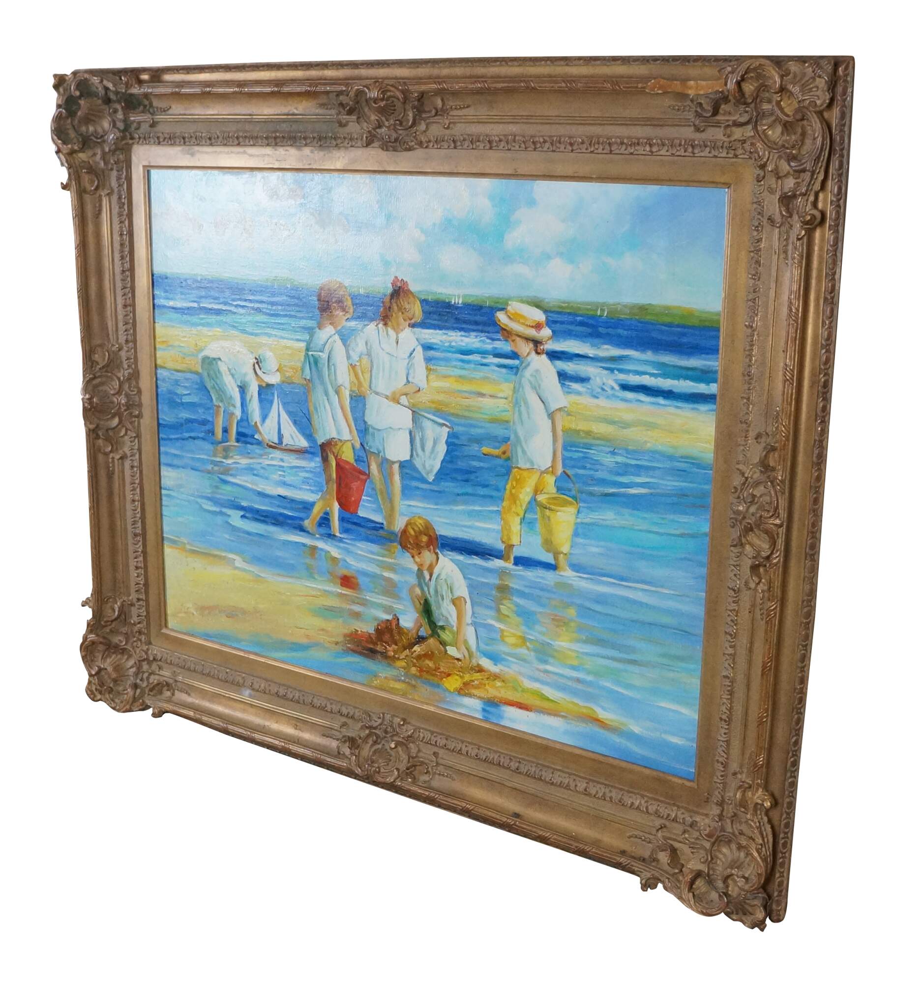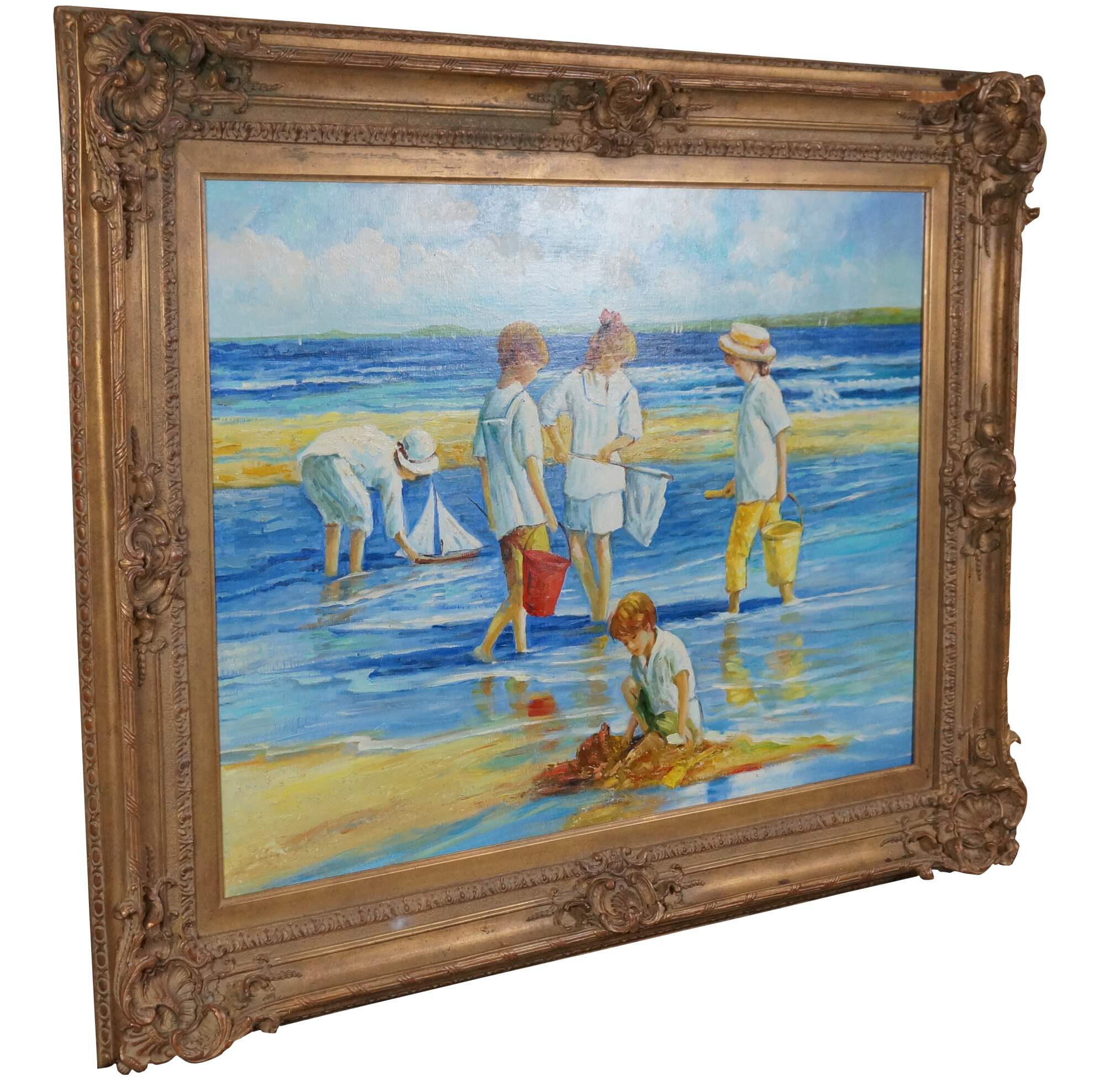 Contemporary School Impressionist Coastal Oil Painting. Features children playing near the water on the beach. A boy is shown in the foreground building a sandcastle with a group behind him holding a net and buckets, possibly searching for sand crabs. In the back, another boy is playing with a sailboat in the water. Sailboats and a landmass can be seen in the background. The canvas is framed in a Baroque manner with a gold finish.