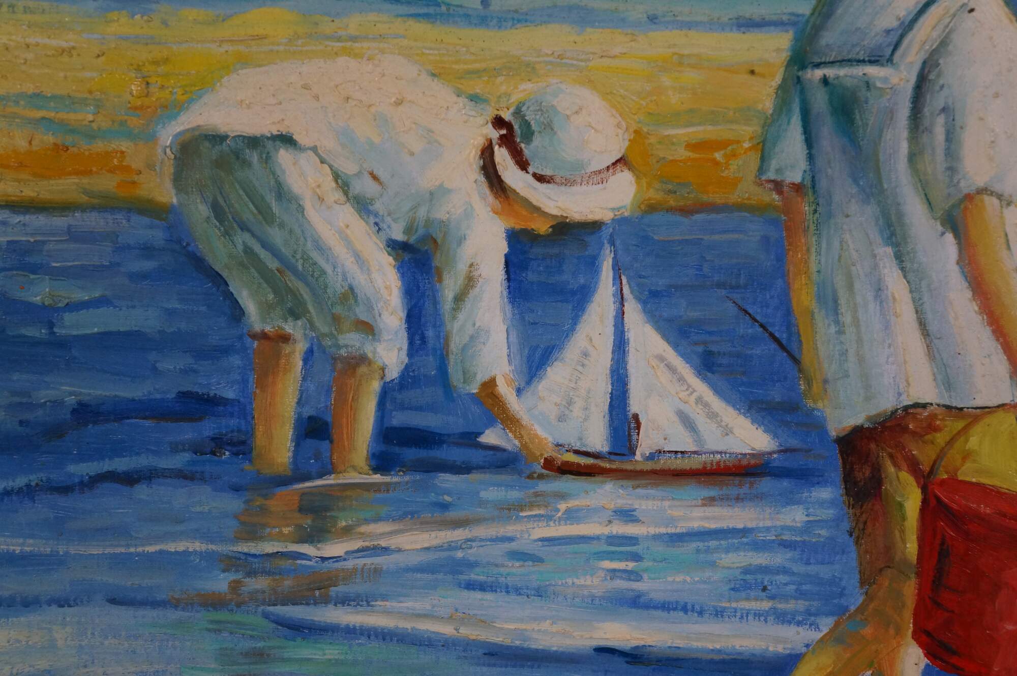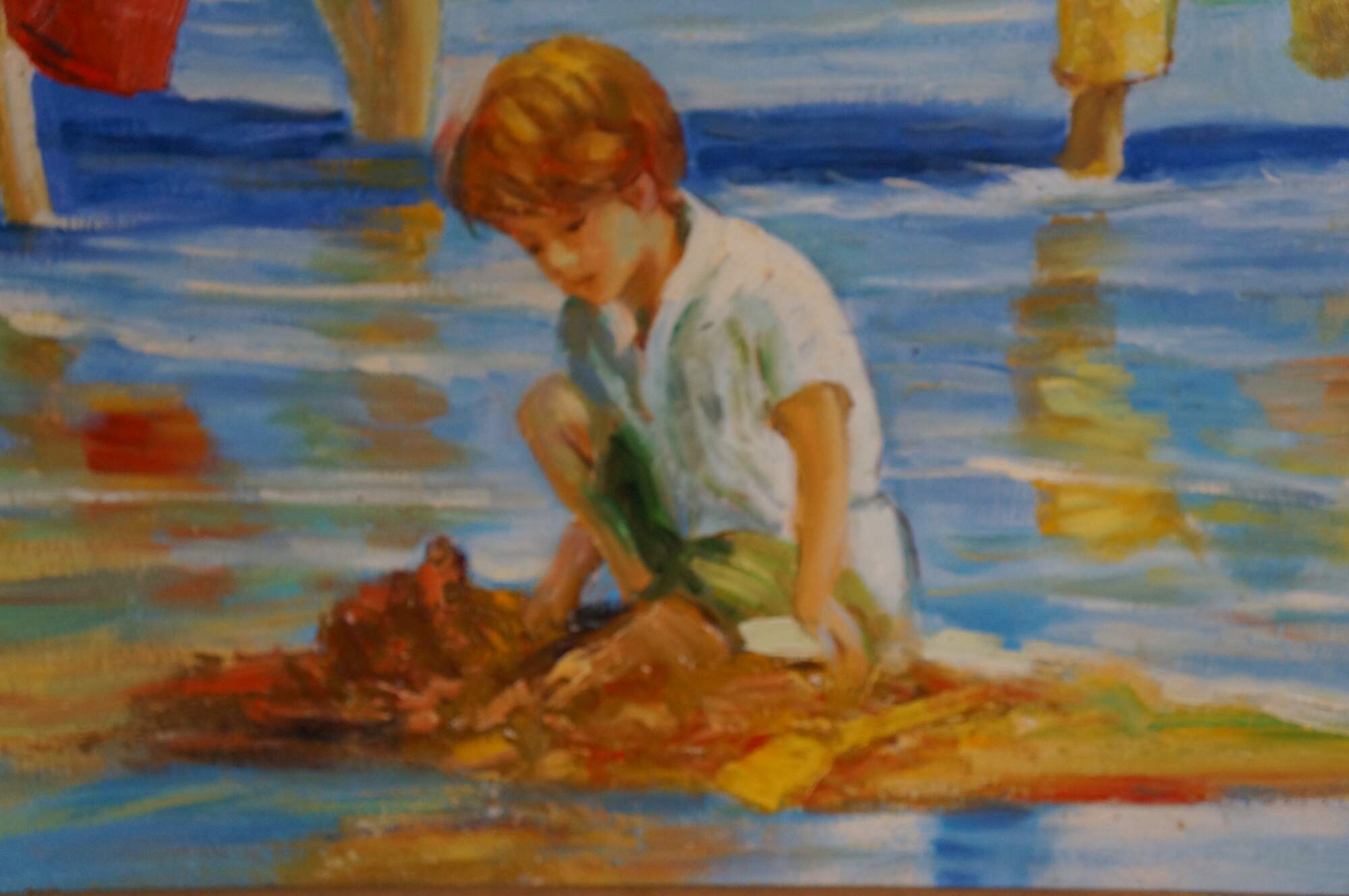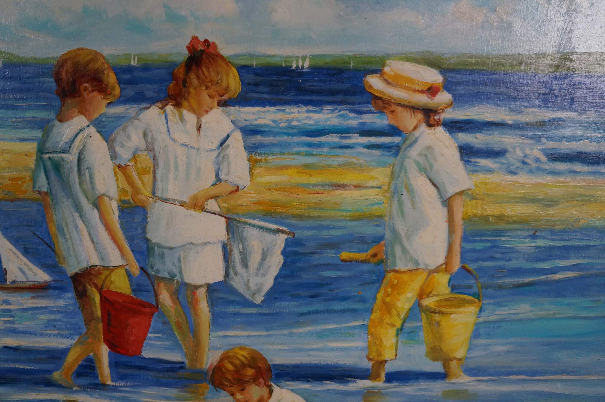 Contemporary School Impressionist Coastal Oil Painting. Features children playing near the water on the beach. A boy is shown in the foreground building a sandcastle with a group behind him holding a net and buckets, possibly searching for sand crabs. In the back, another boy is playing with a sailboat in the water. Sailboats and a landmass can be seen in the background. The canvas is framed in a Baroque manner with a gold finish.