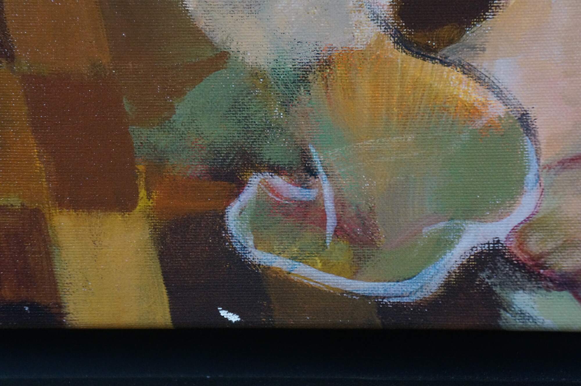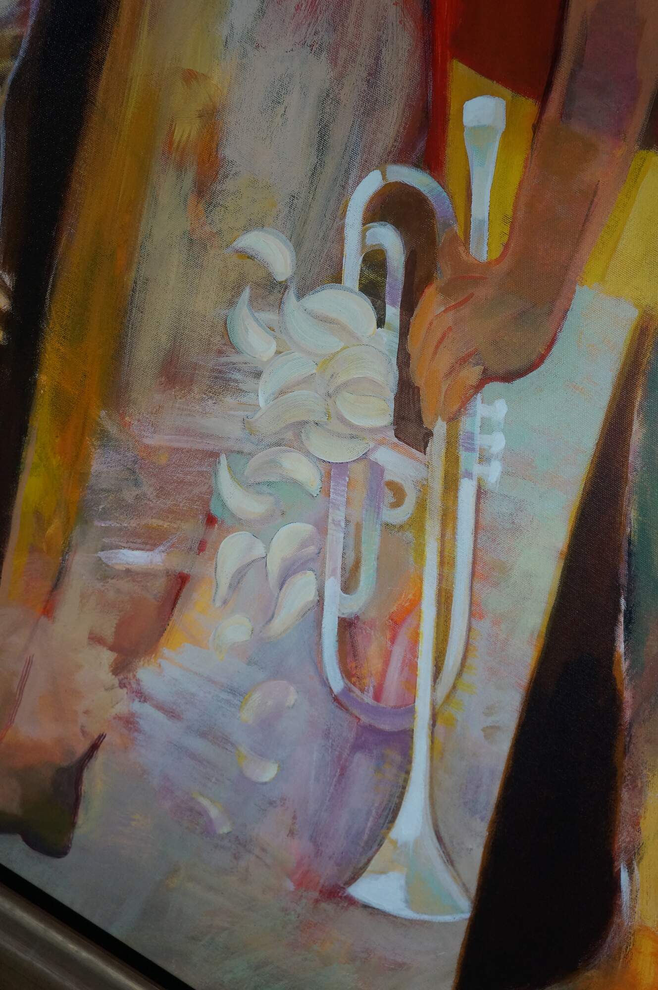 An abstract contemporary giclée featuring figures/musicians dancing in front of a Tuscan landscape. Beautifully colored and detailed. Giclée on premium canvas. Hand-signed limited edition 36/75. Professionally framed.
