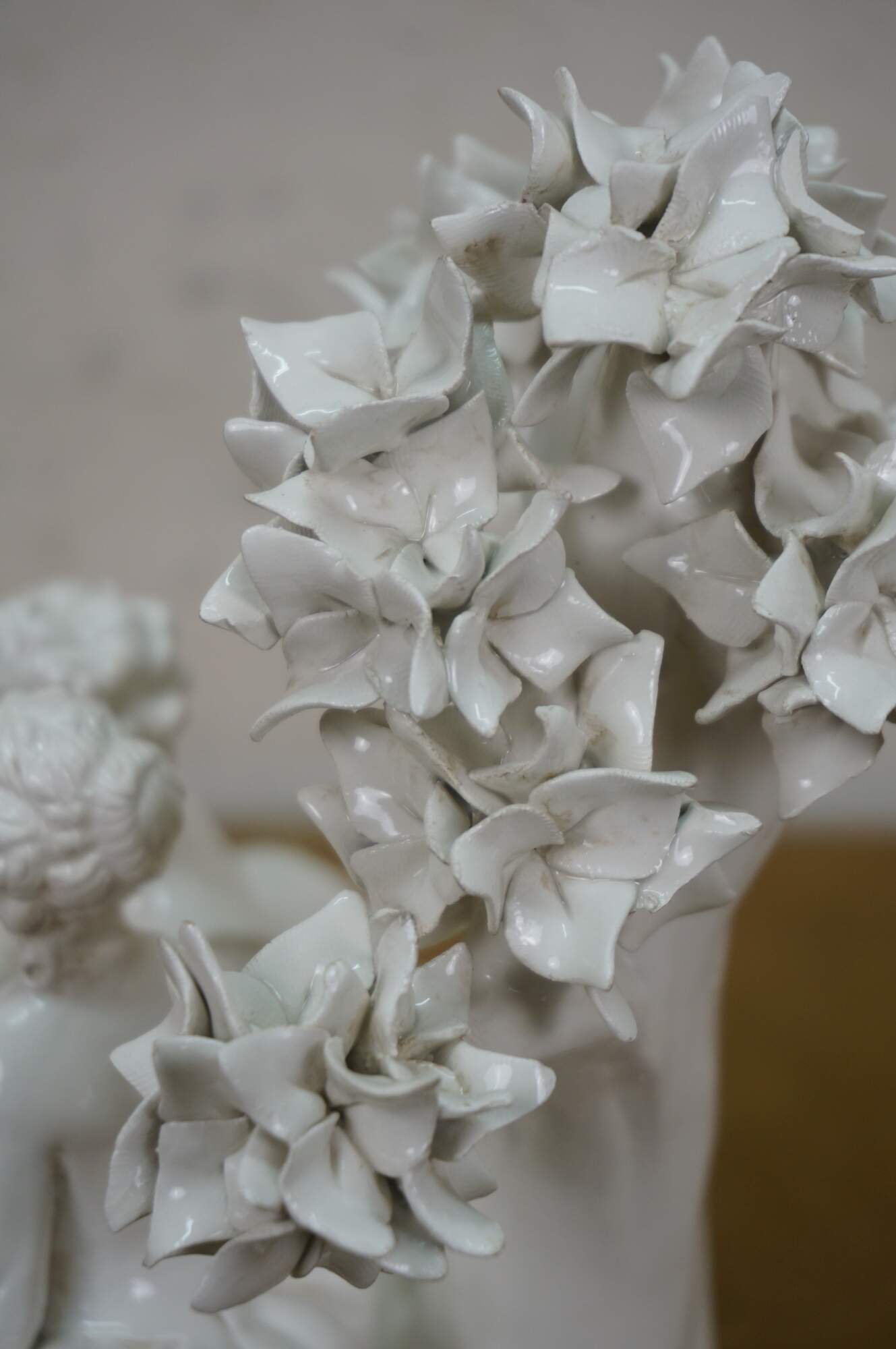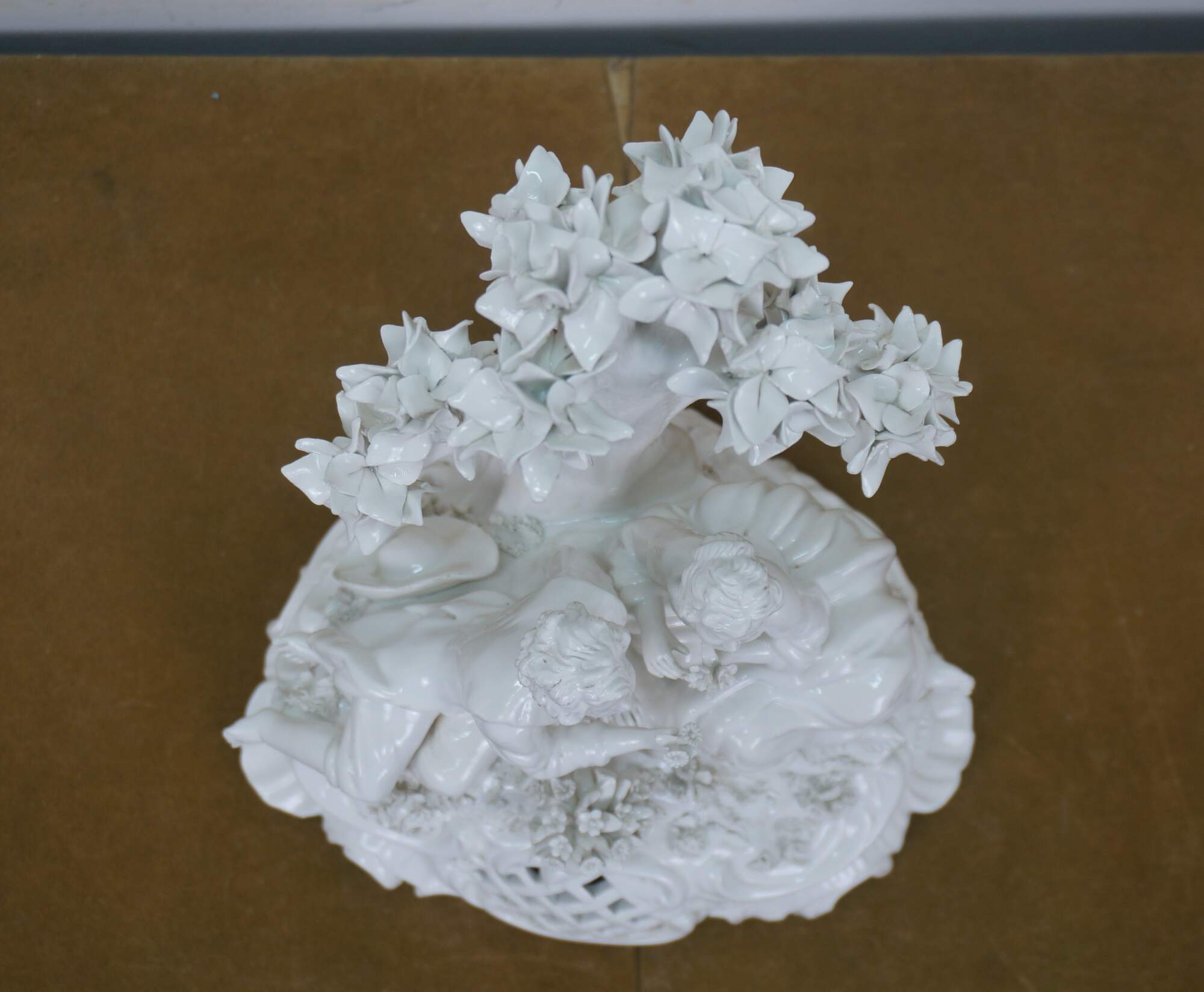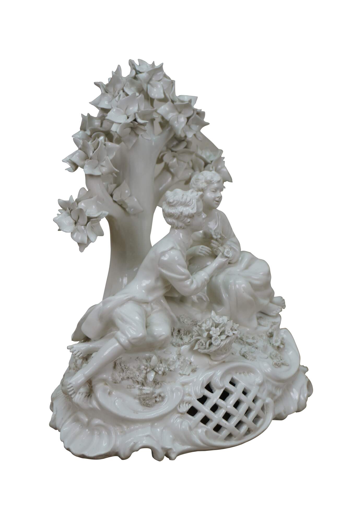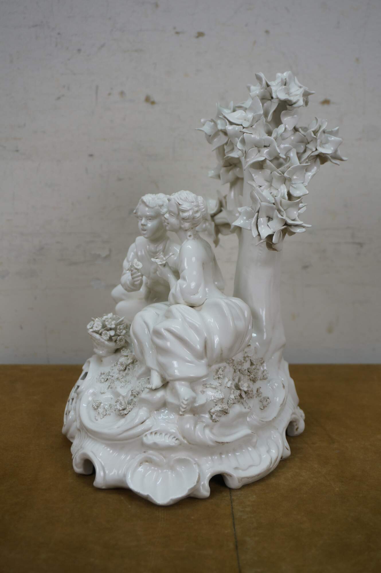 Vintage Italian Capodimonte Blanc de Chine Victorian courting couple art nouveau style figurine featuring two lovers under a tree, picking flowers for their basket / bouquet.