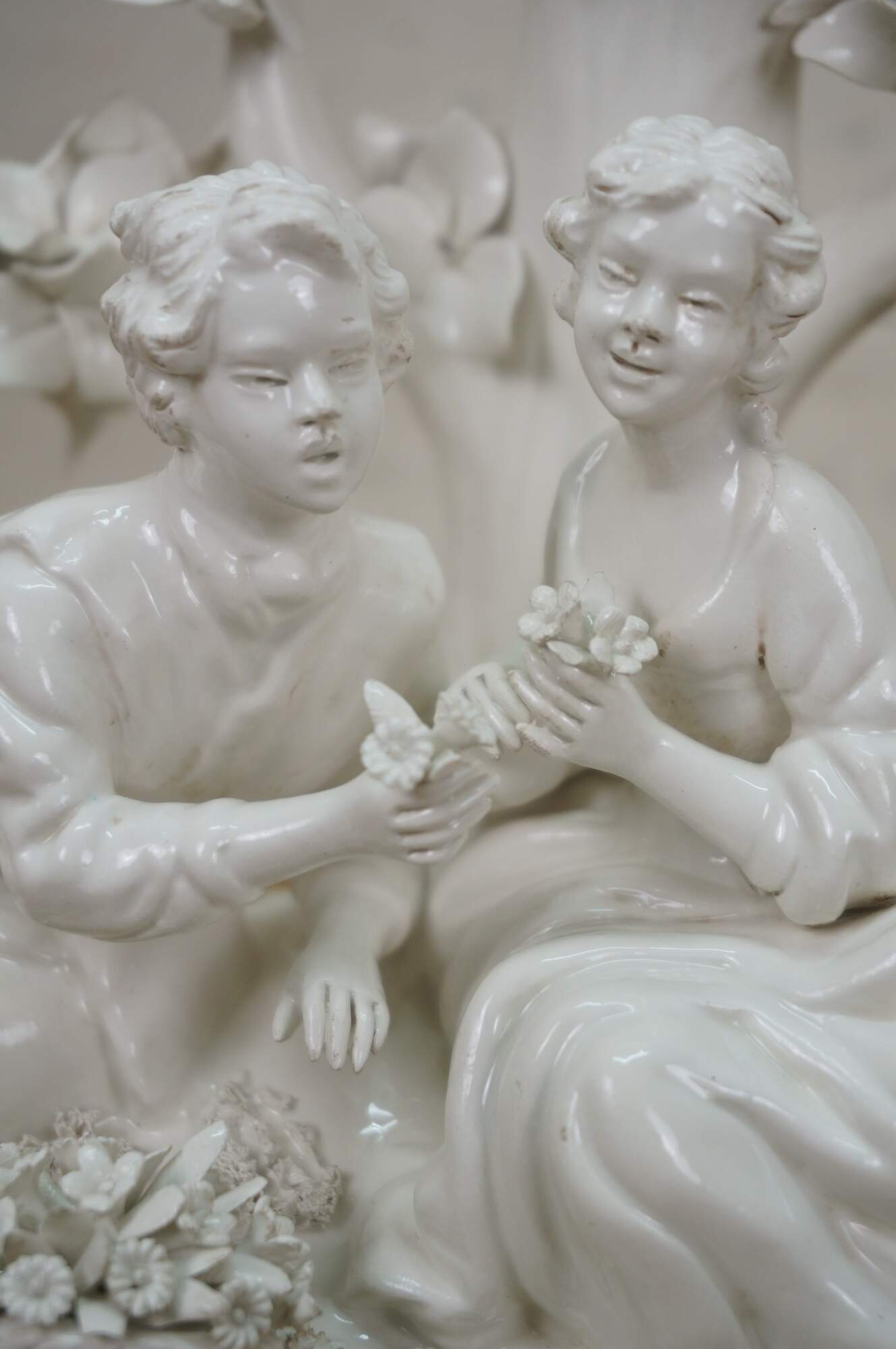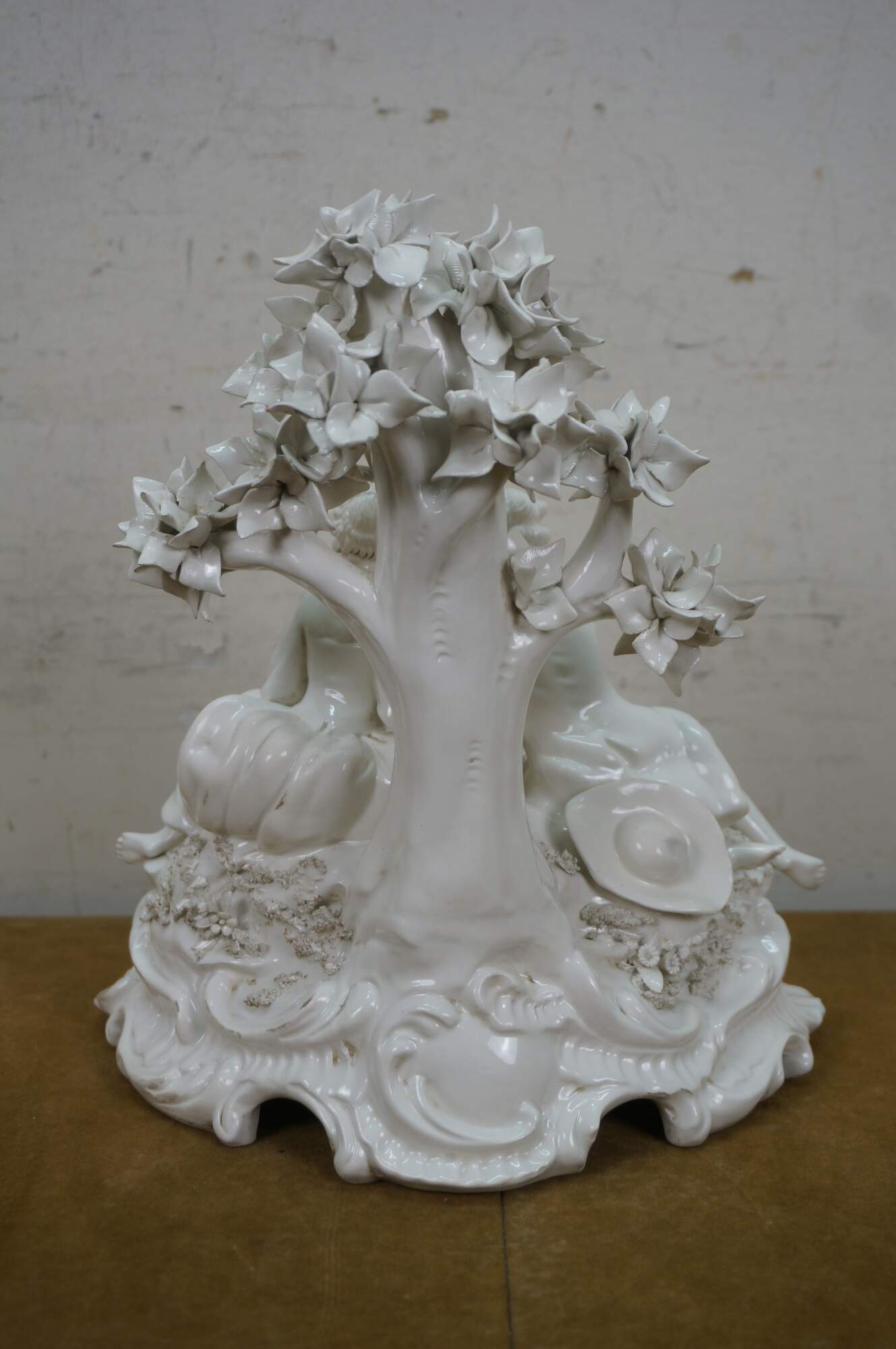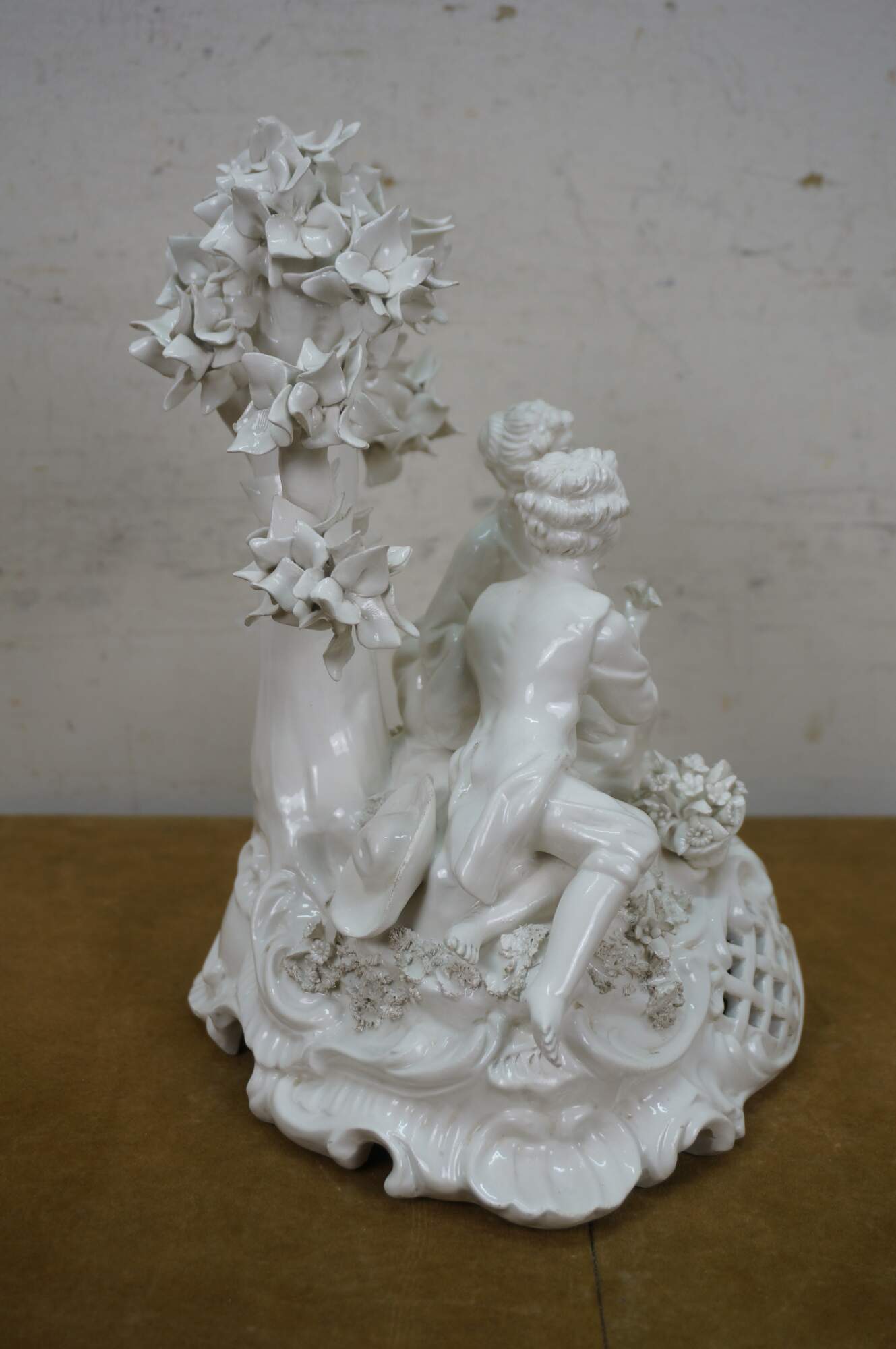 Vintage Italian Capodimonte Blanc de Chine Victorian courting couple art nouveau style figurine featuring two lovers under a tree, picking flowers for their basket / bouquet.