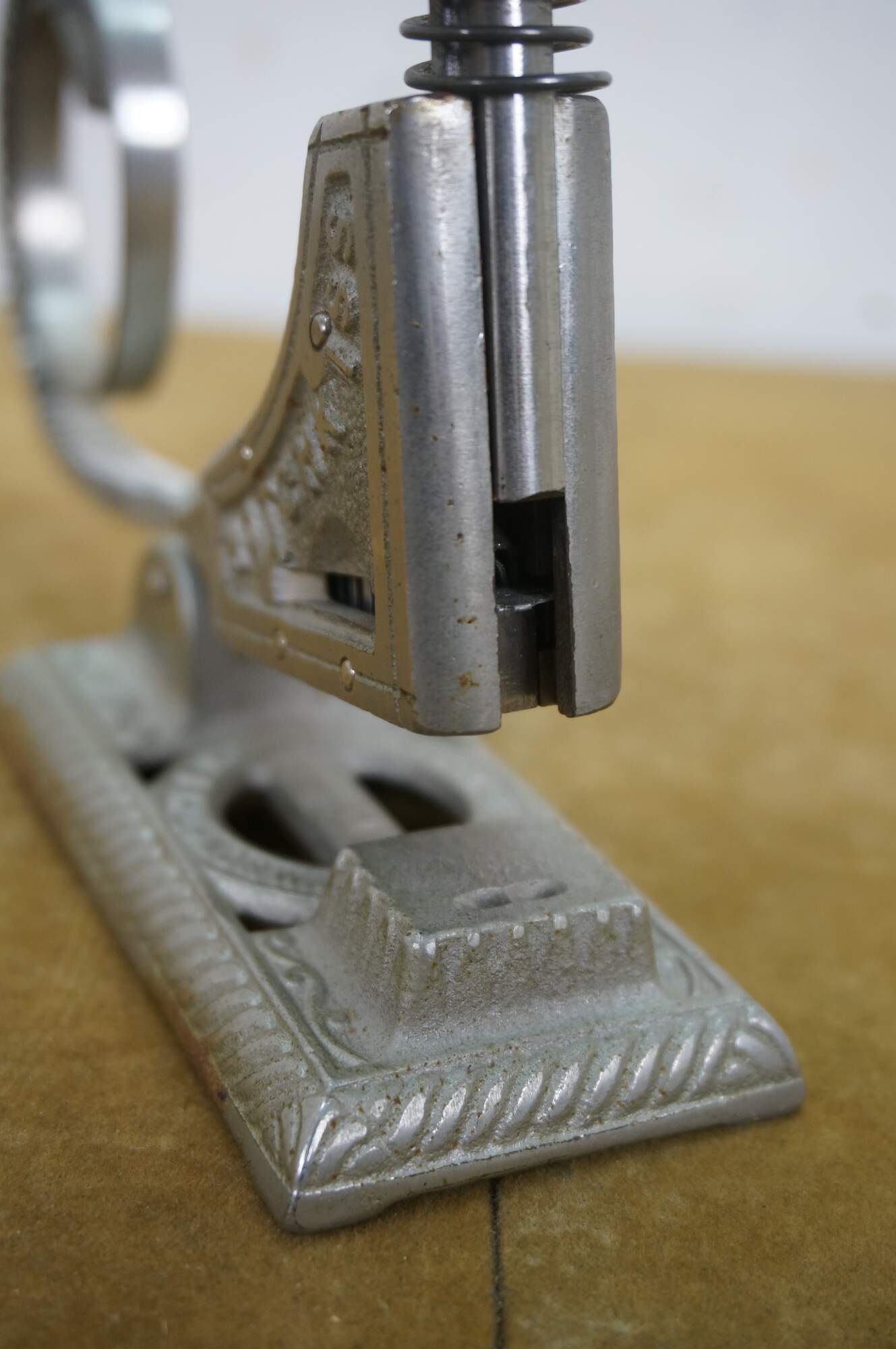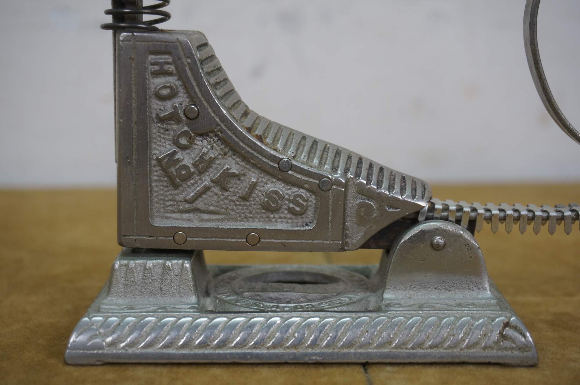 Rare antique circa 1898 NCR National Cash Register Hotchkiss No. 1 stapler/ paper fastener, made of nickel-plated cast iron. Made by the EH Hotchkiss Company of Norwalk, Connecticut. Still has some staples left on the track.