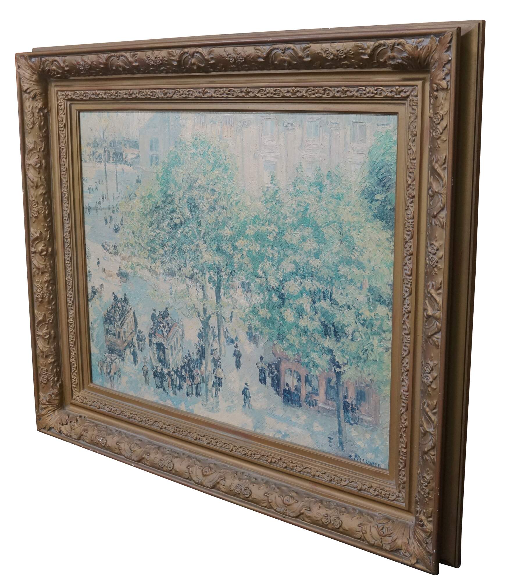 Place du Théâtre-Français, Spring Painting by Camille Pissarro was made in 1898. An impressionist landscape / cityscape showcasing bustling Paris. This beautiful reproduction is an Artagraph Edition of the State Hermitage Museum Collection. No. 299 of 300. Circa 1991. Signed lower right. Ornately framed with gold finish.