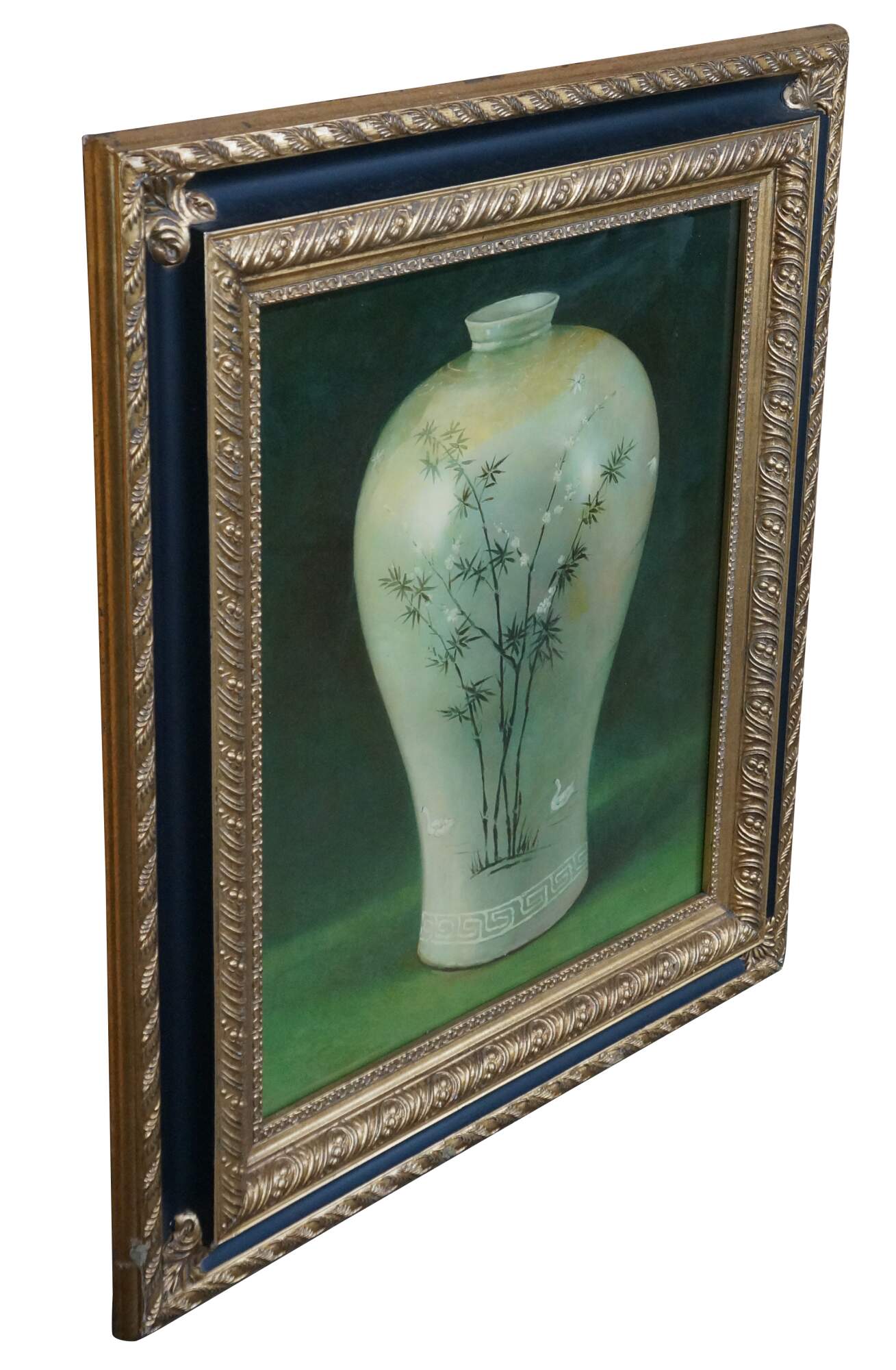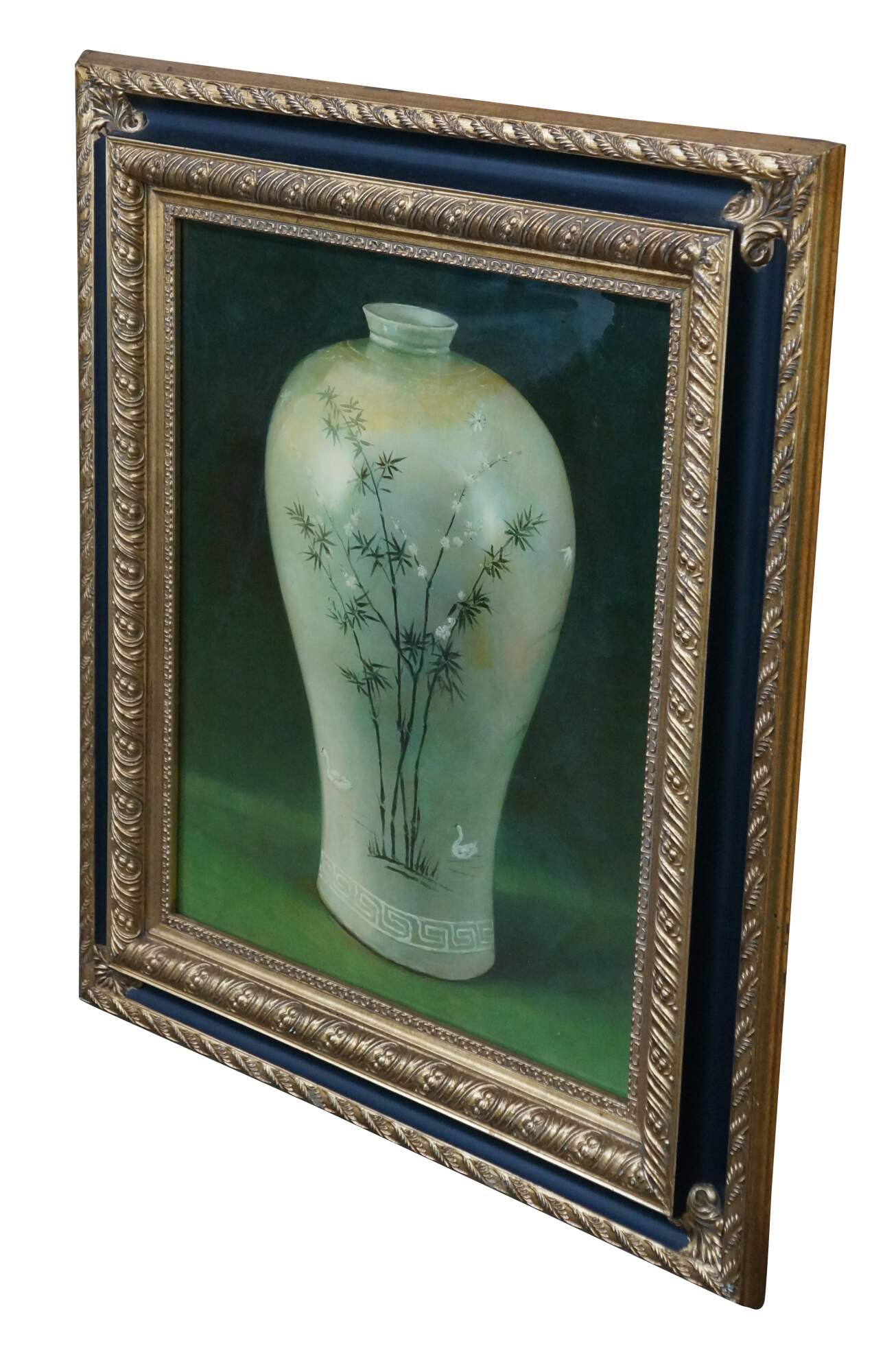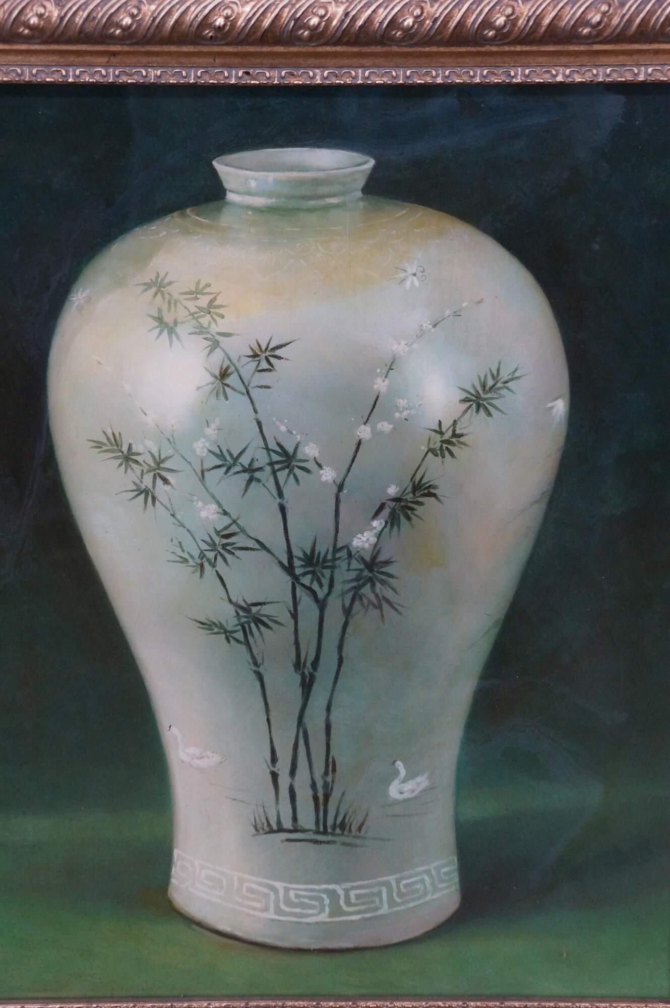 20th-century oil painting of a chinoiserie vase on canvas. The painting depicts a traditional urn or vase with plum branches, swans, and a Greek key design along the base. The canvas is framed in black and gold.