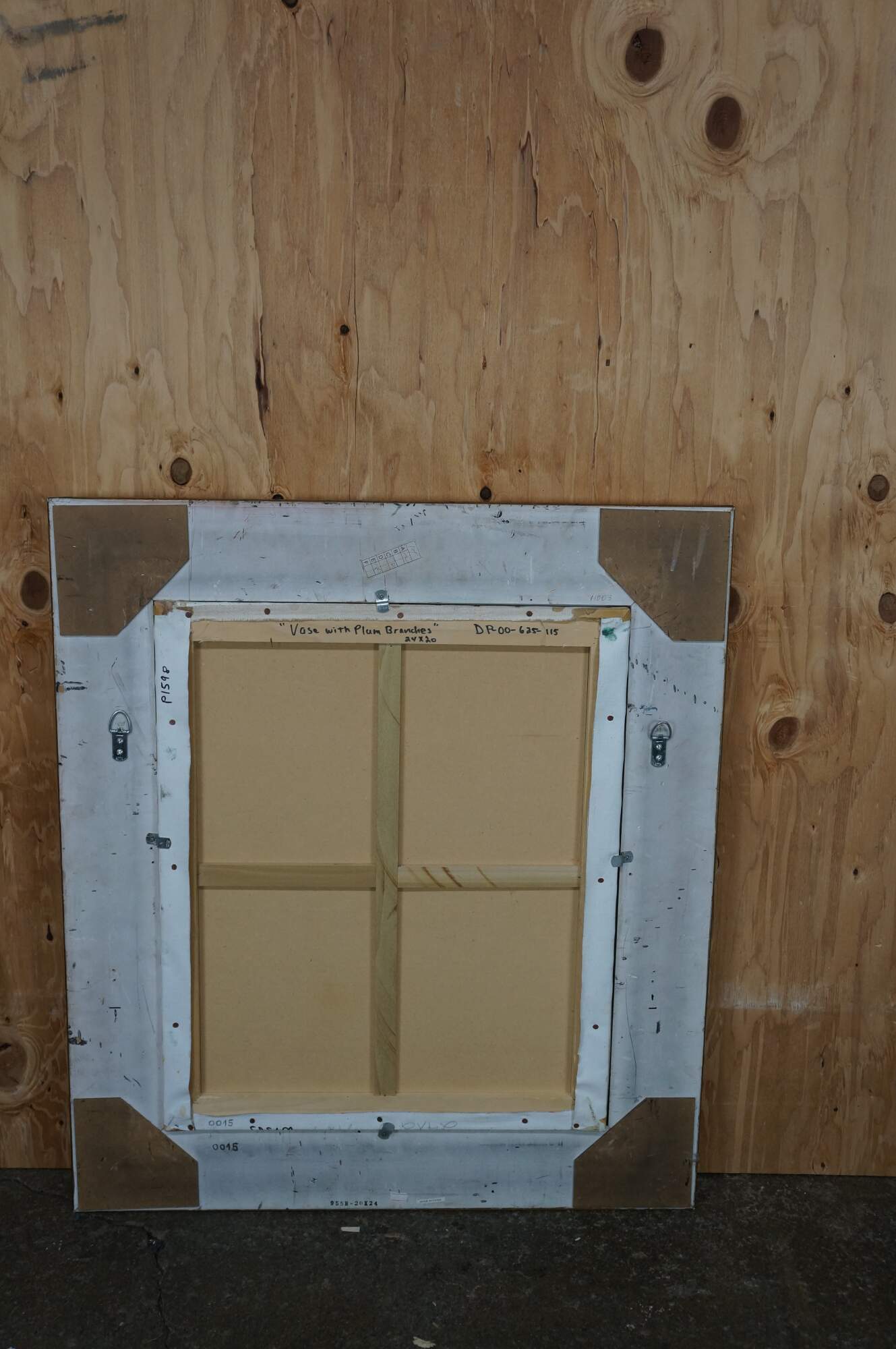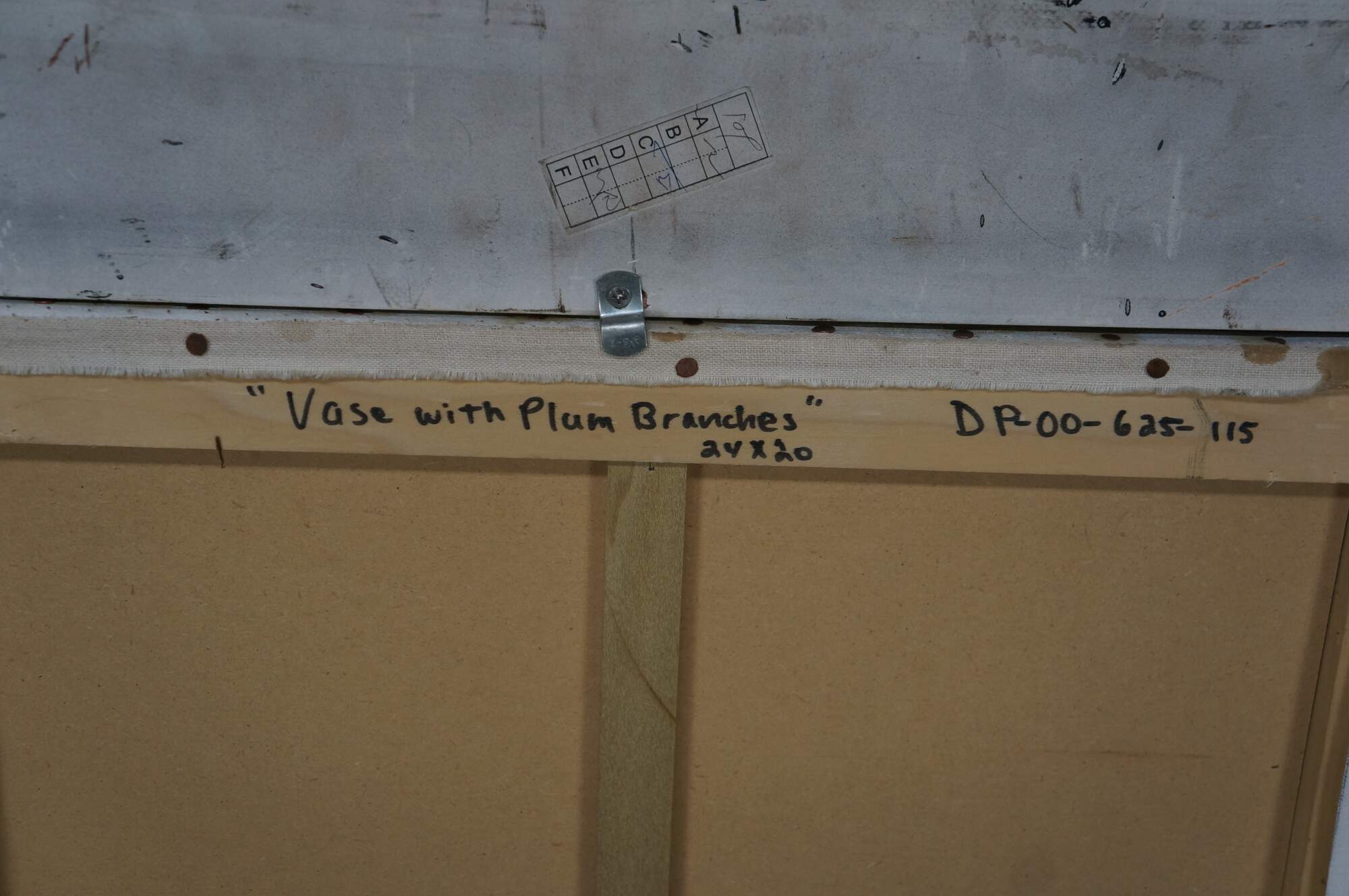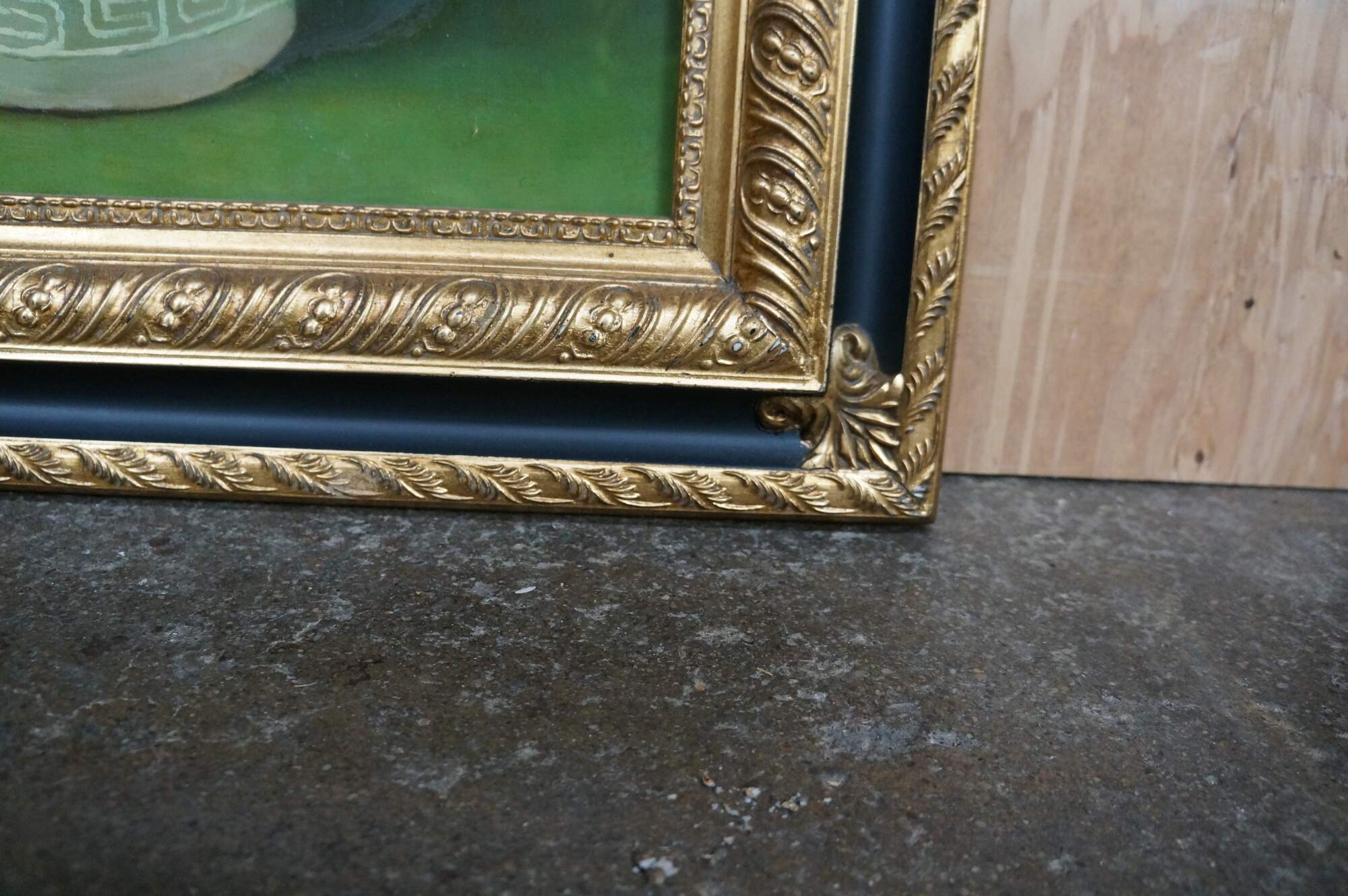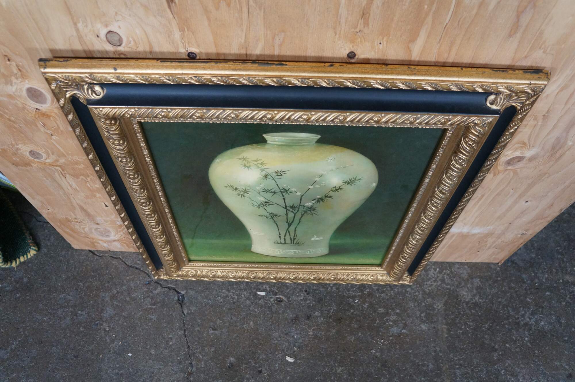 20th-century oil painting of a chinoiserie vase on canvas. The painting depicts a traditional urn or vase with plum branches, swans, and a Greek key design along the base. The canvas is framed in black and gold.