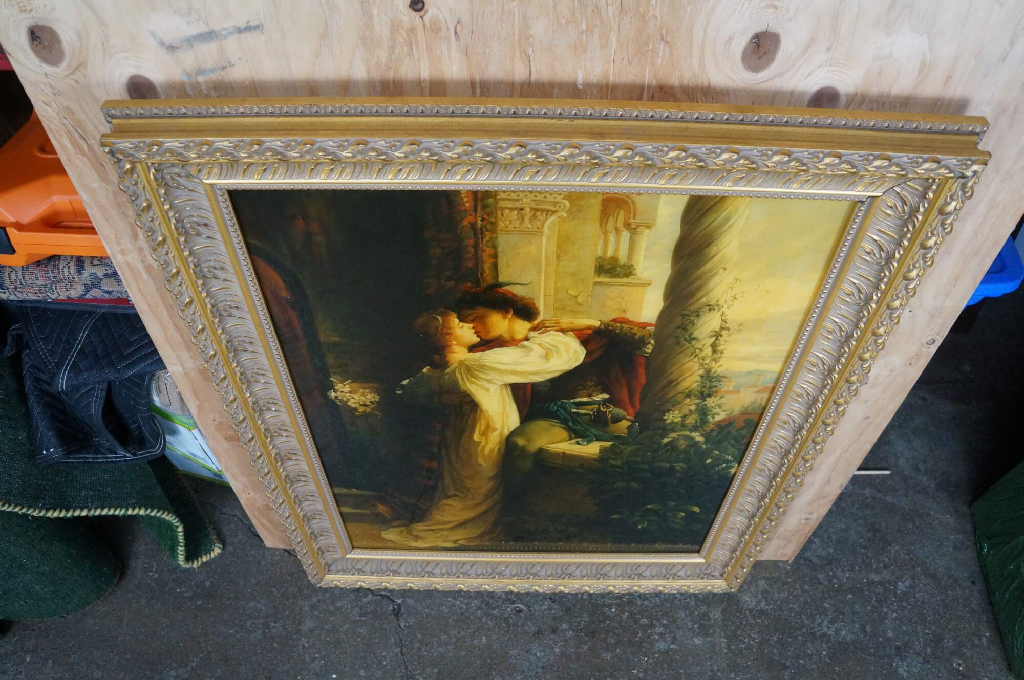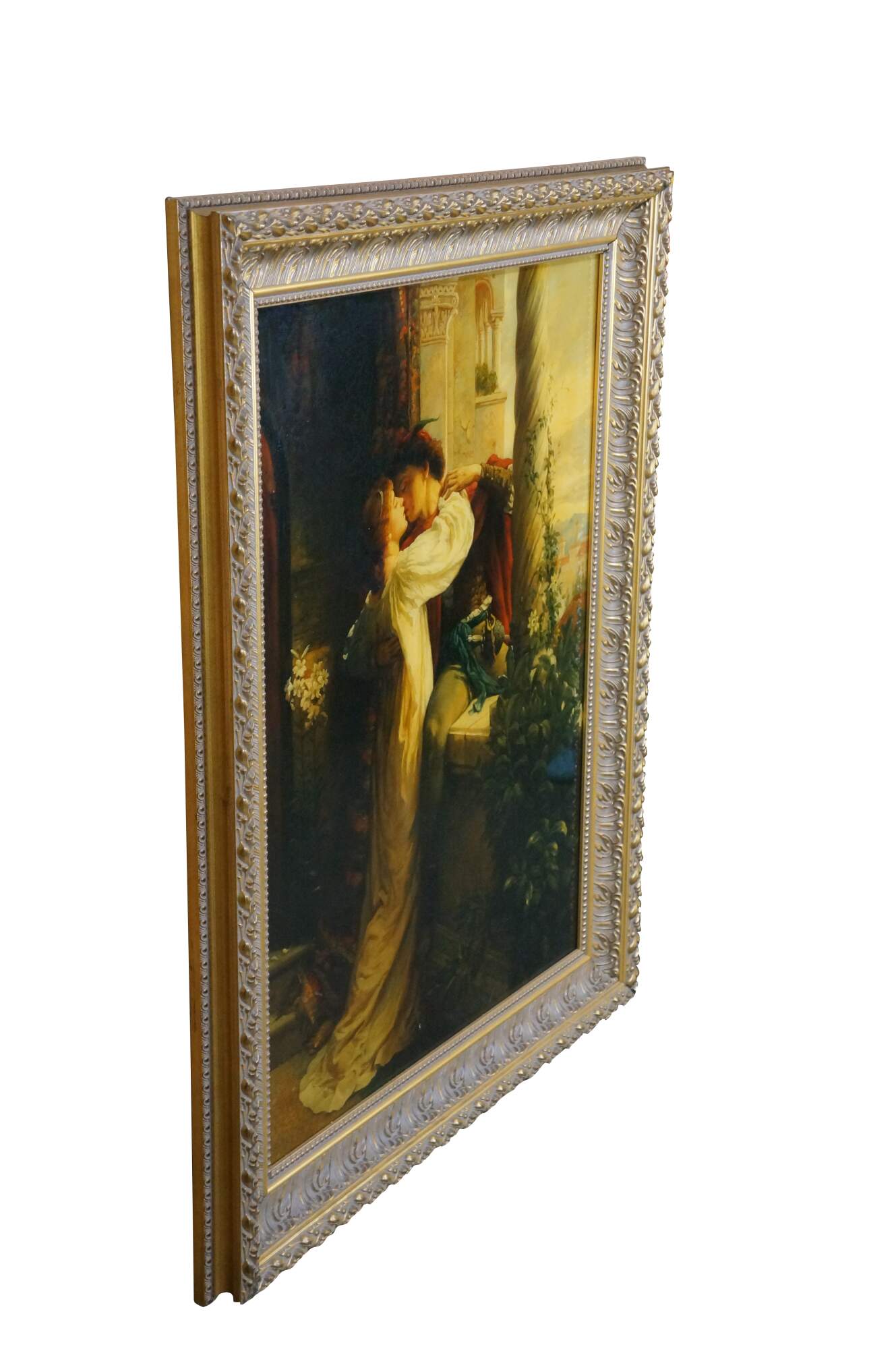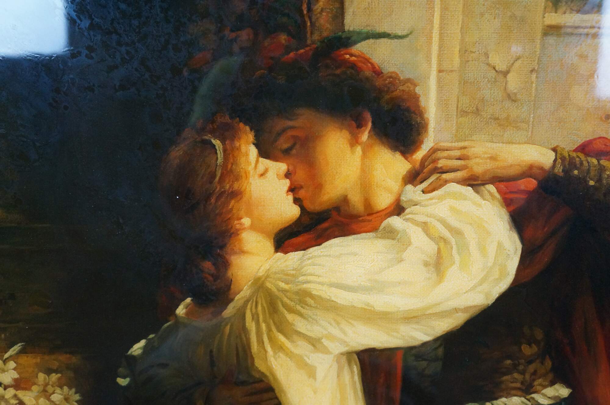 Romeo & Juliet Portrait after Frank Dicksee, circa last quarter 20th century. The original was painted in 1884. The canvas is epoxy coated to enhance color and ornately framed with a gold finish.