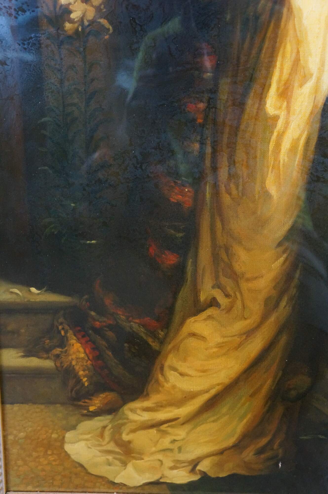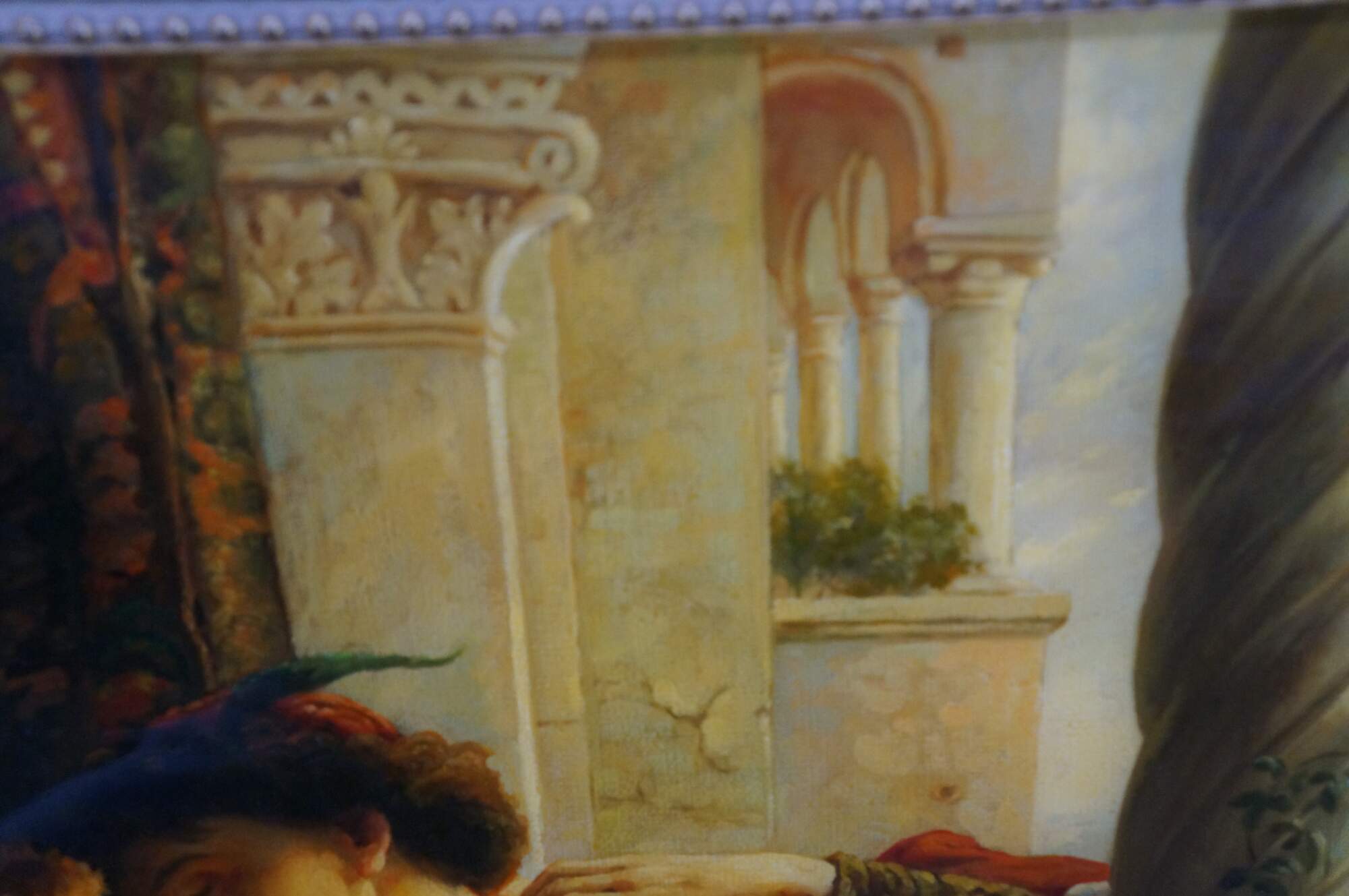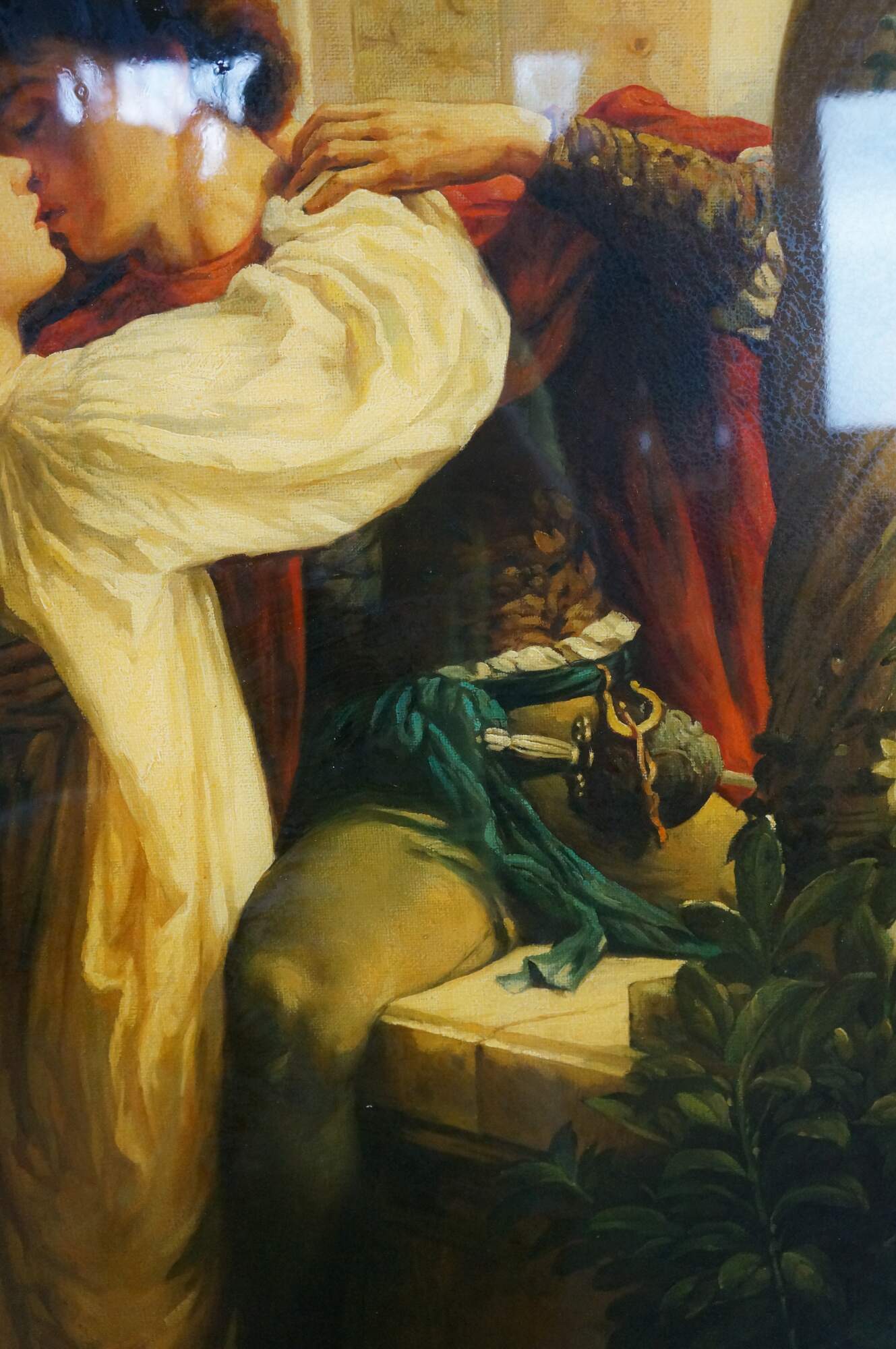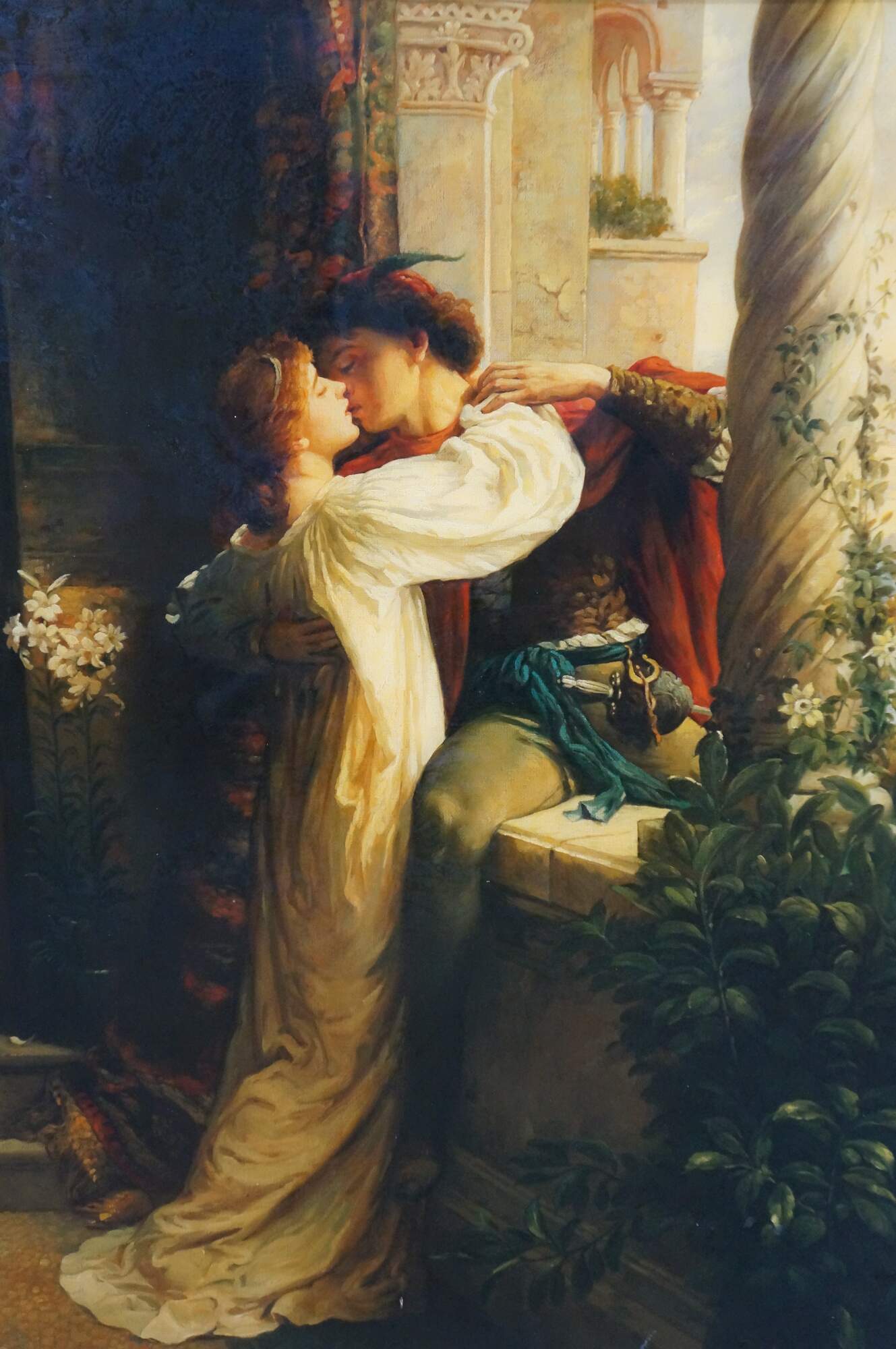 Romeo & Juliet Portrait after Frank Dicksee, circa last quarter 20th century. The original was painted in 1884. The canvas is epoxy coated to enhance color and ornately framed with a gold finish.