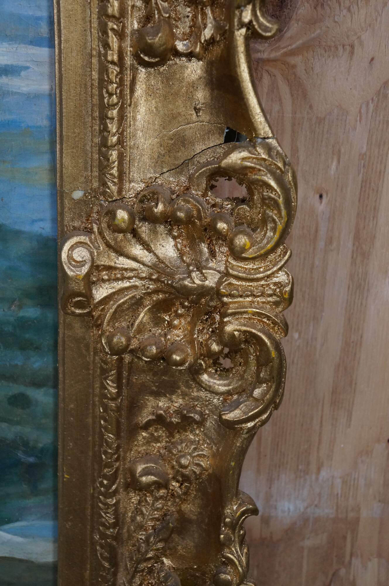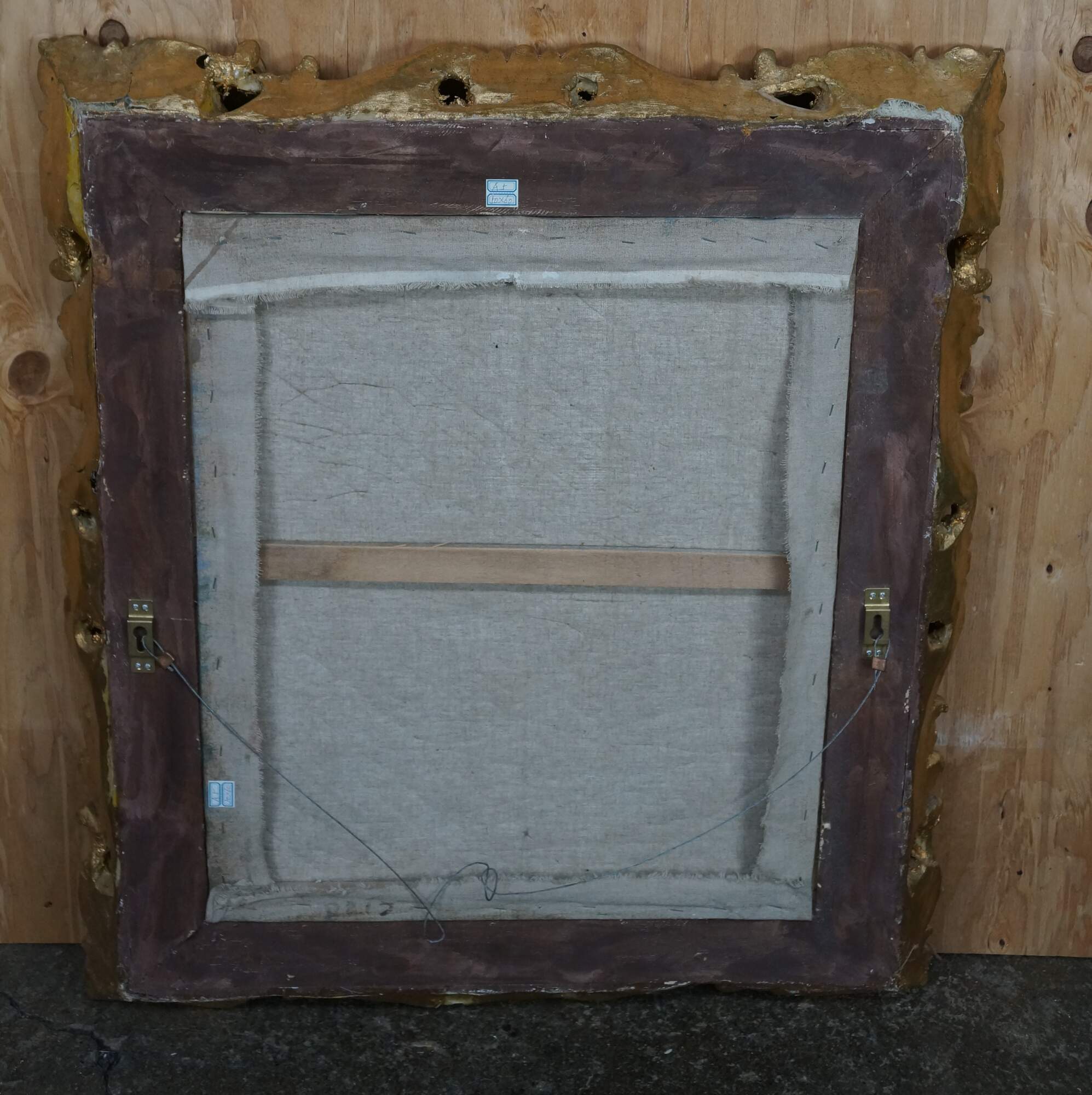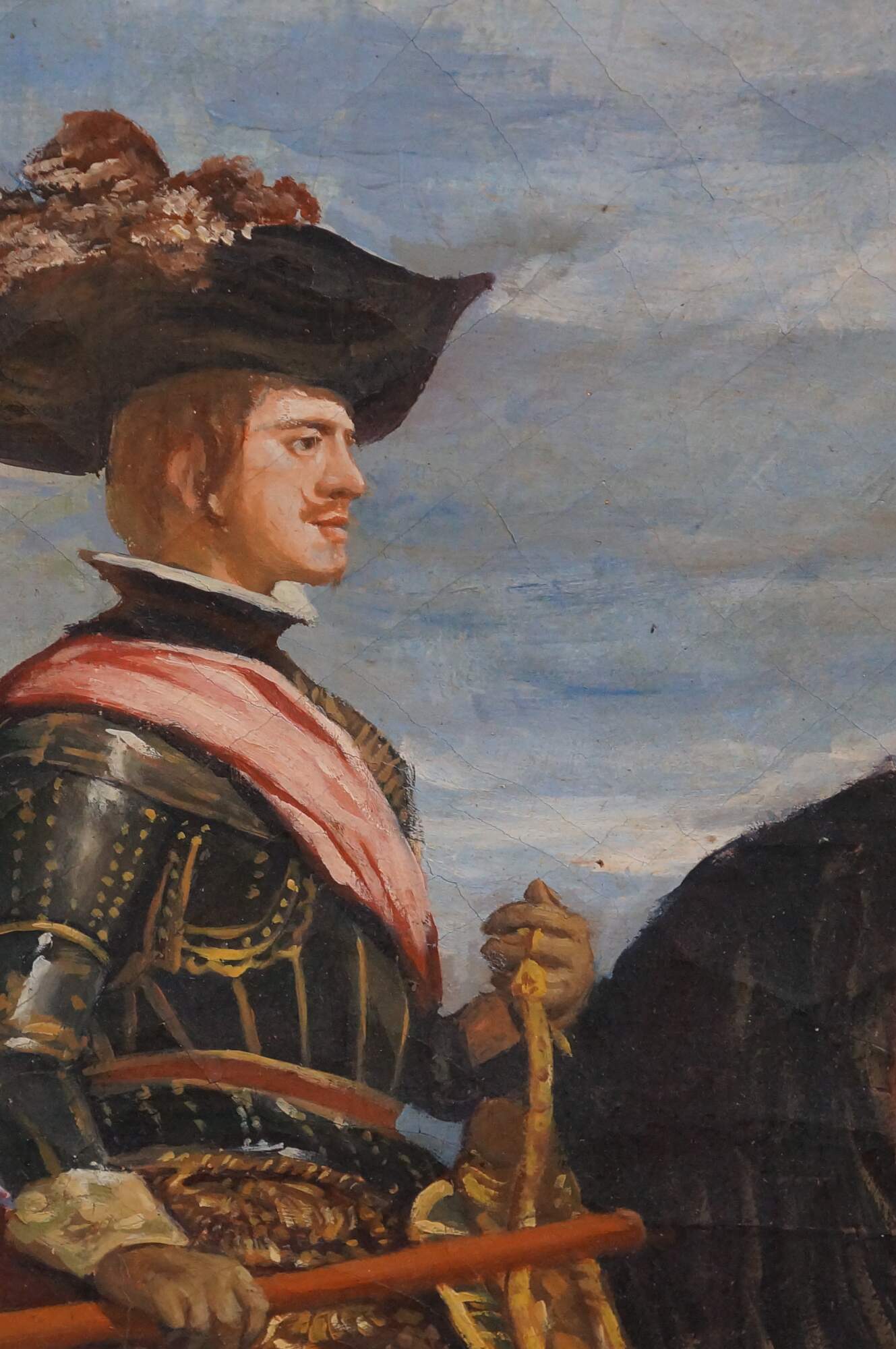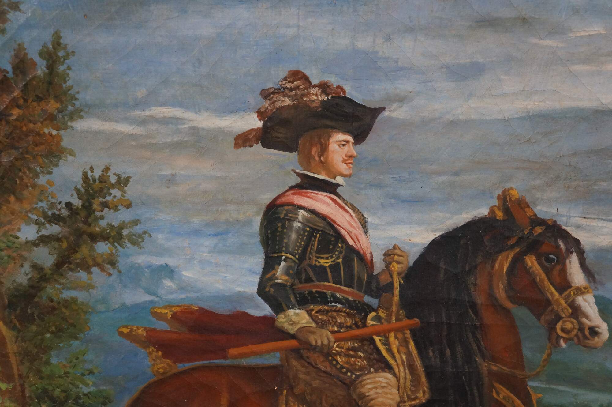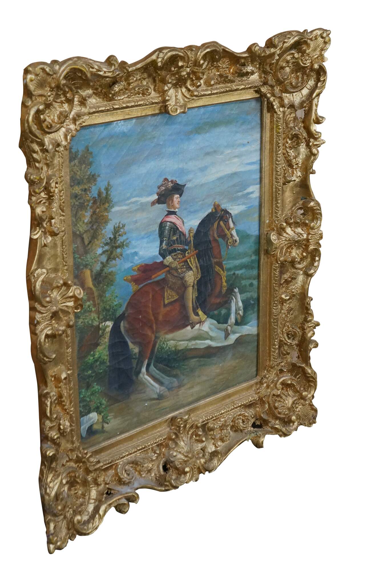 The painting features King Philip IV on his horse in stride. He is seated in armoir and appears to be holding a map in his hand. The oil painting is on canvas with natural craquelure and ornately framed with scalloping and gold finish.