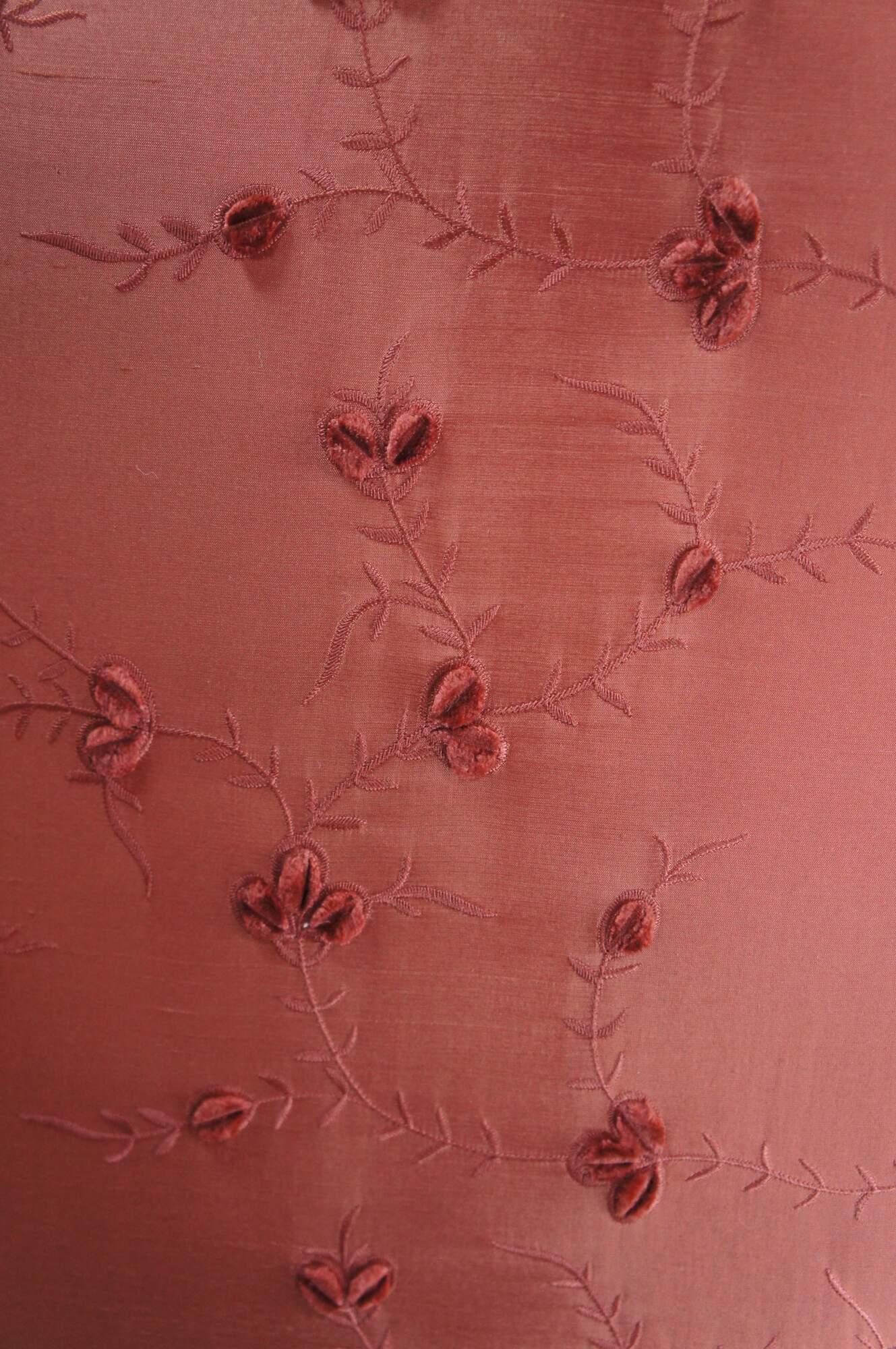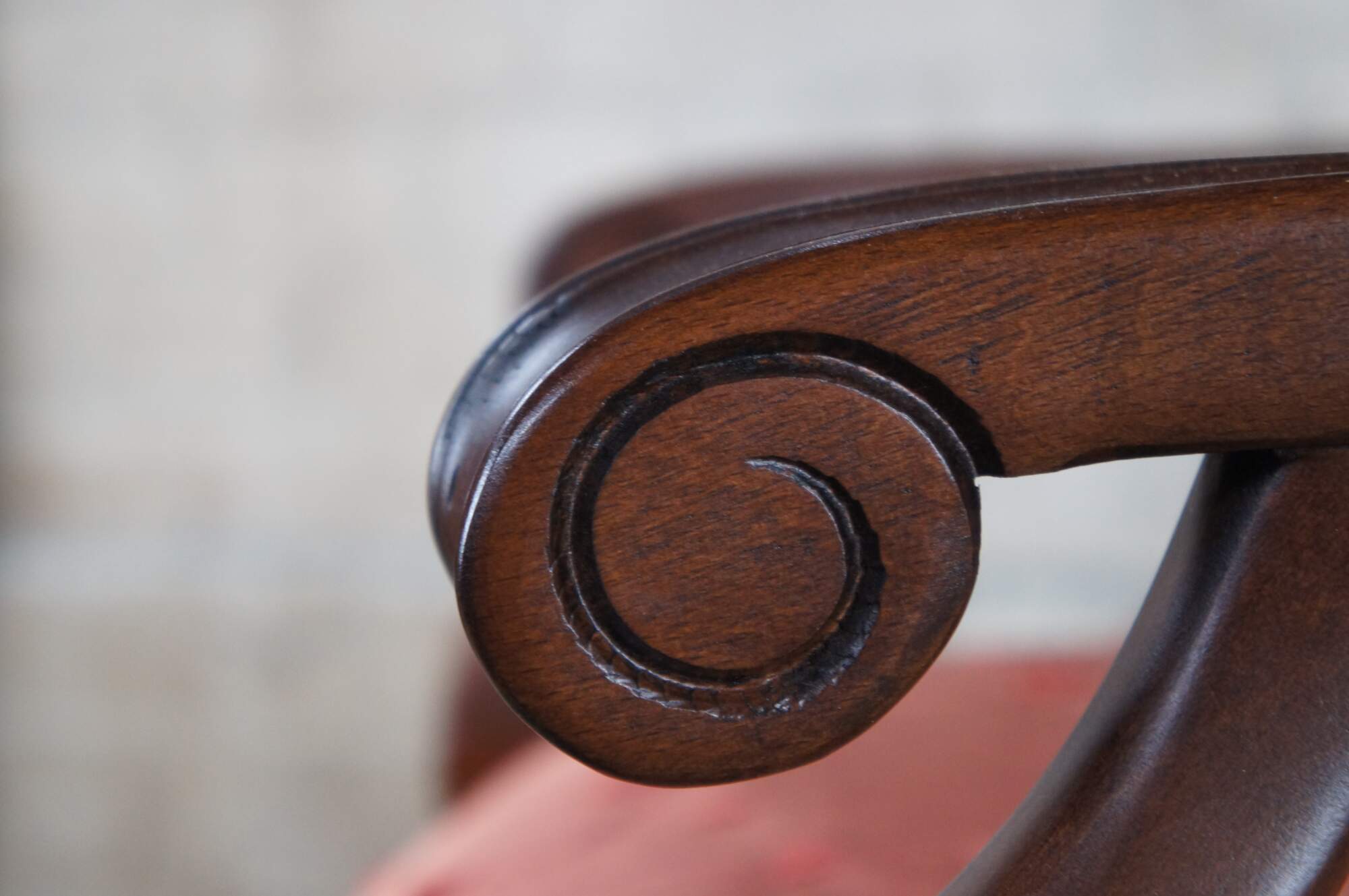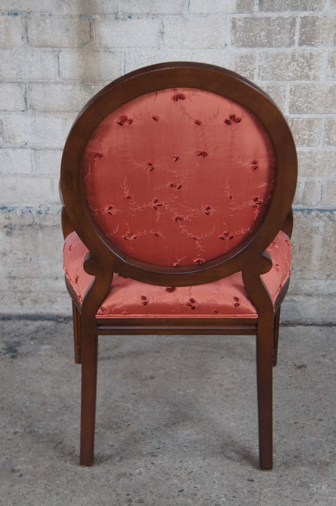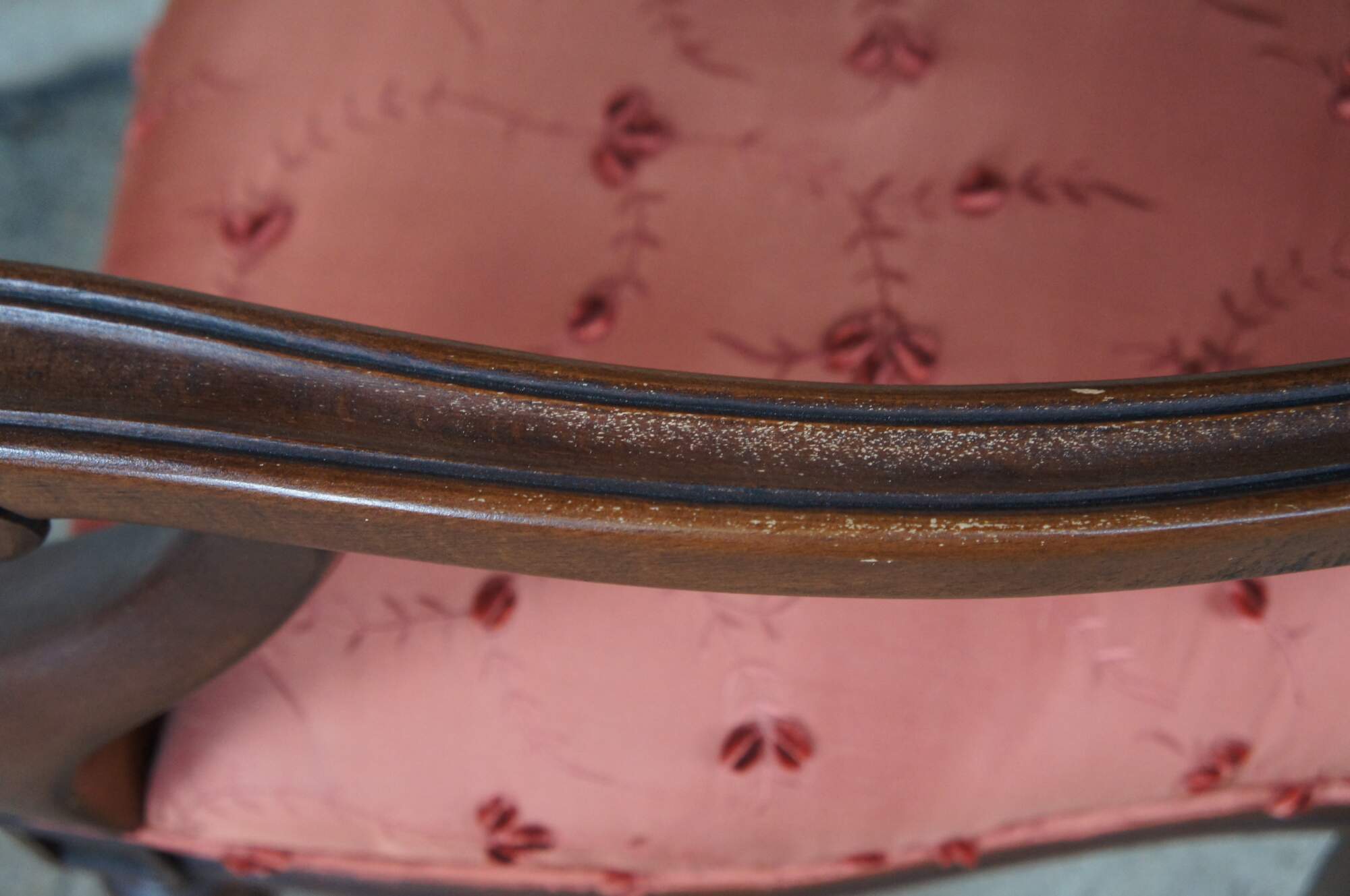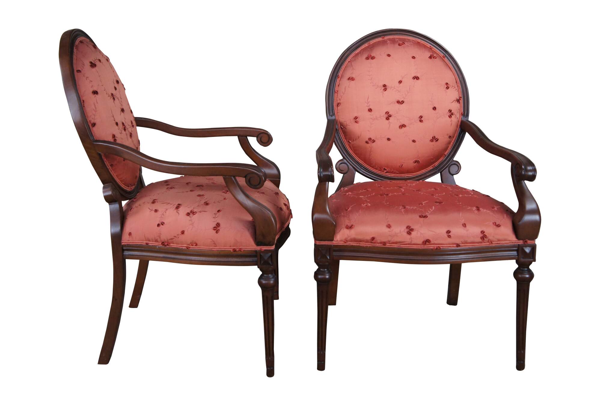 Two vintage Henredon Custom Folio Collection arm chairs. Made of mahogany featuring a round back with sloped arms, fluted legs and silk crewel raised floral upholstery.