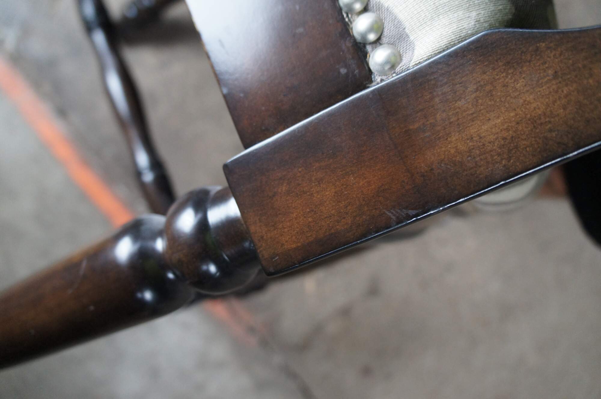 Set of six vintage Drexel Heritage oversized dining chairs featuring a contemporary fabric of interlocking geometric shapes accented with nailhead trim. The set includes two sloped armchairs and four side charis, all finished in dark walnut with turned legs and H stretchers.