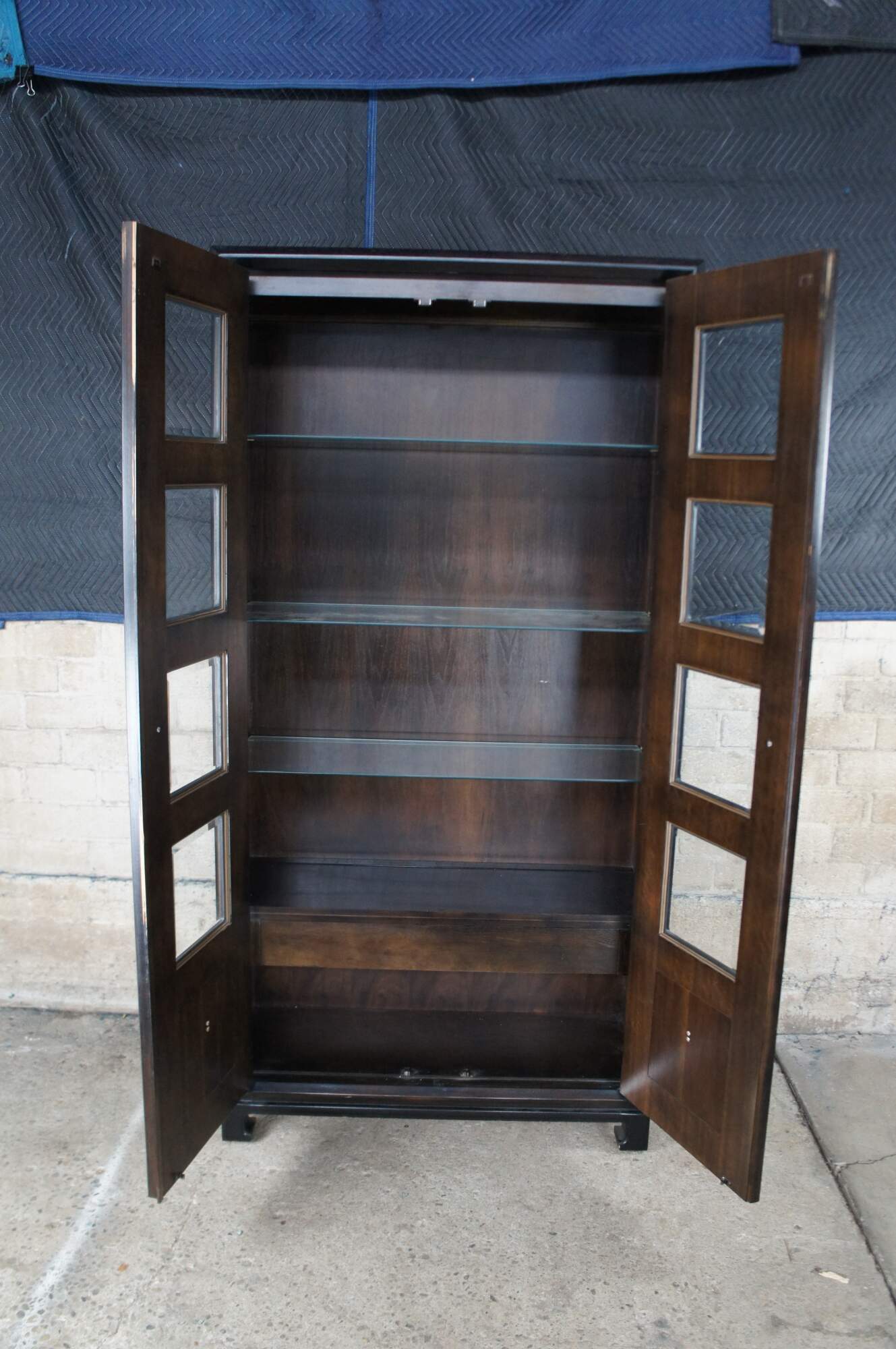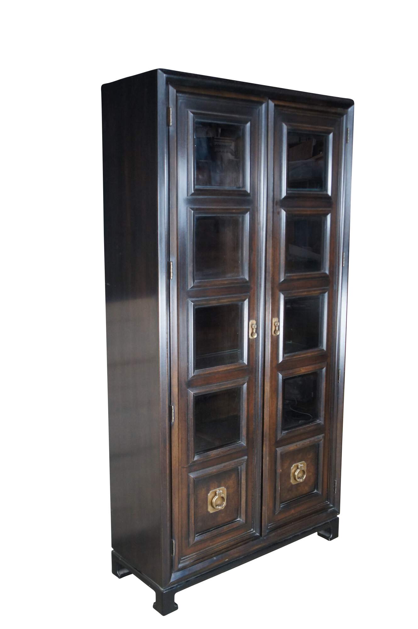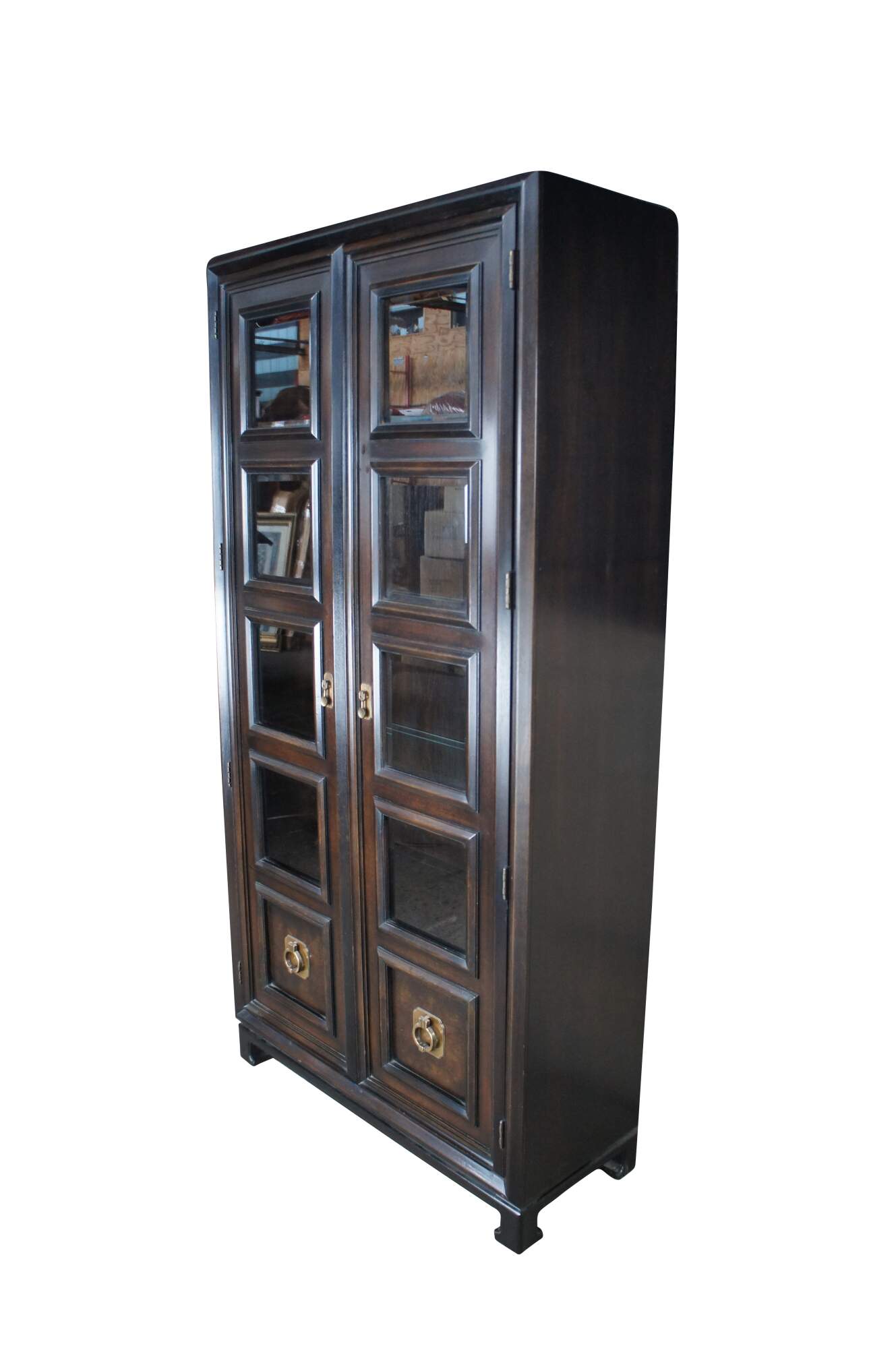 Vintage 1971 Thomasville Furniture bookcase / china cabinet / curio / showcase / drybar / hutch. Made of walnut featuring chinoiserie styling with beveled glass and burl walnut paneled doors - accented with brass ring knocker style hardware. The cabinet doors open to three illuminated shelves with plate grooves and one lower divided silverware drawer. 6529-410.