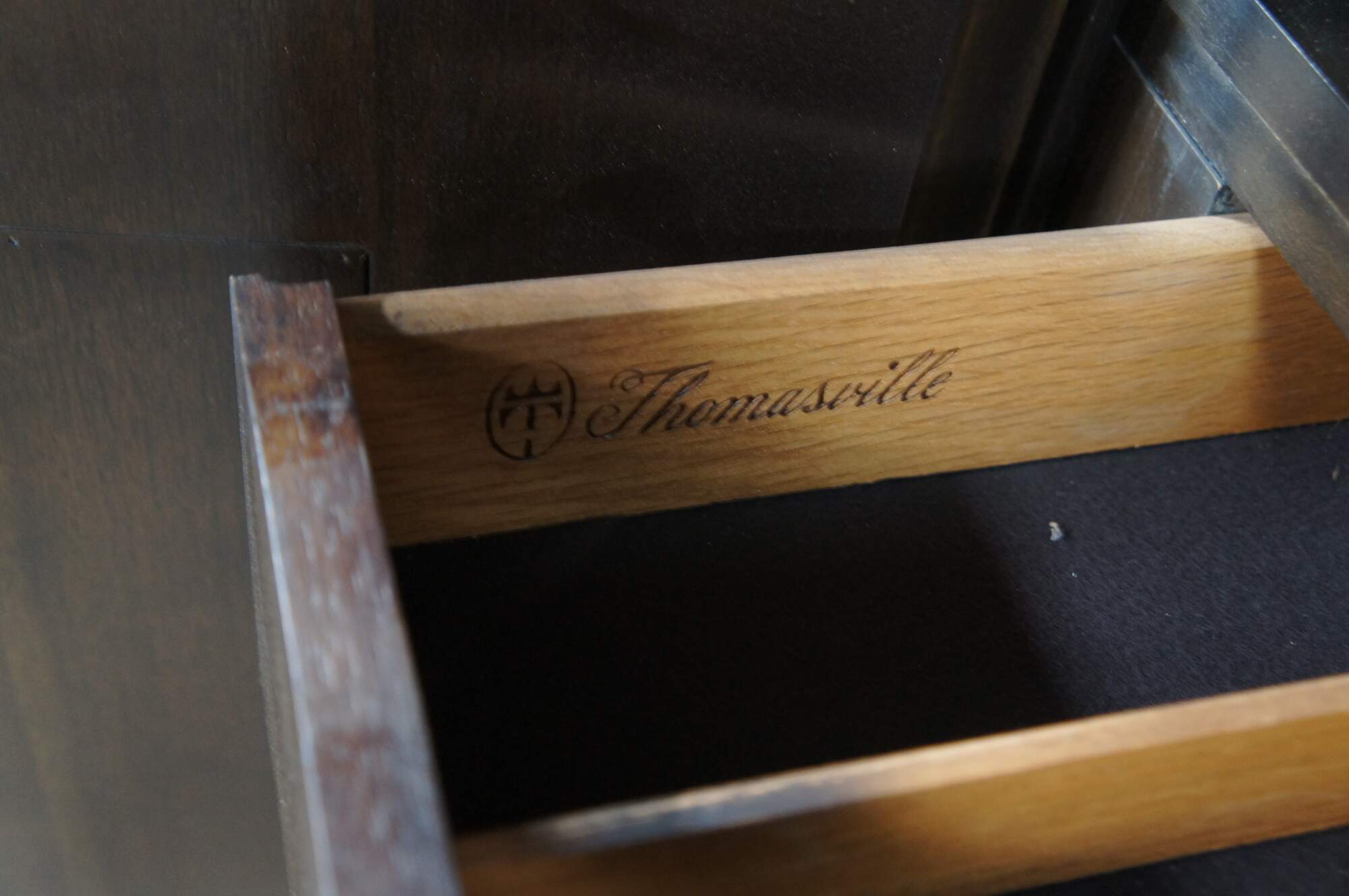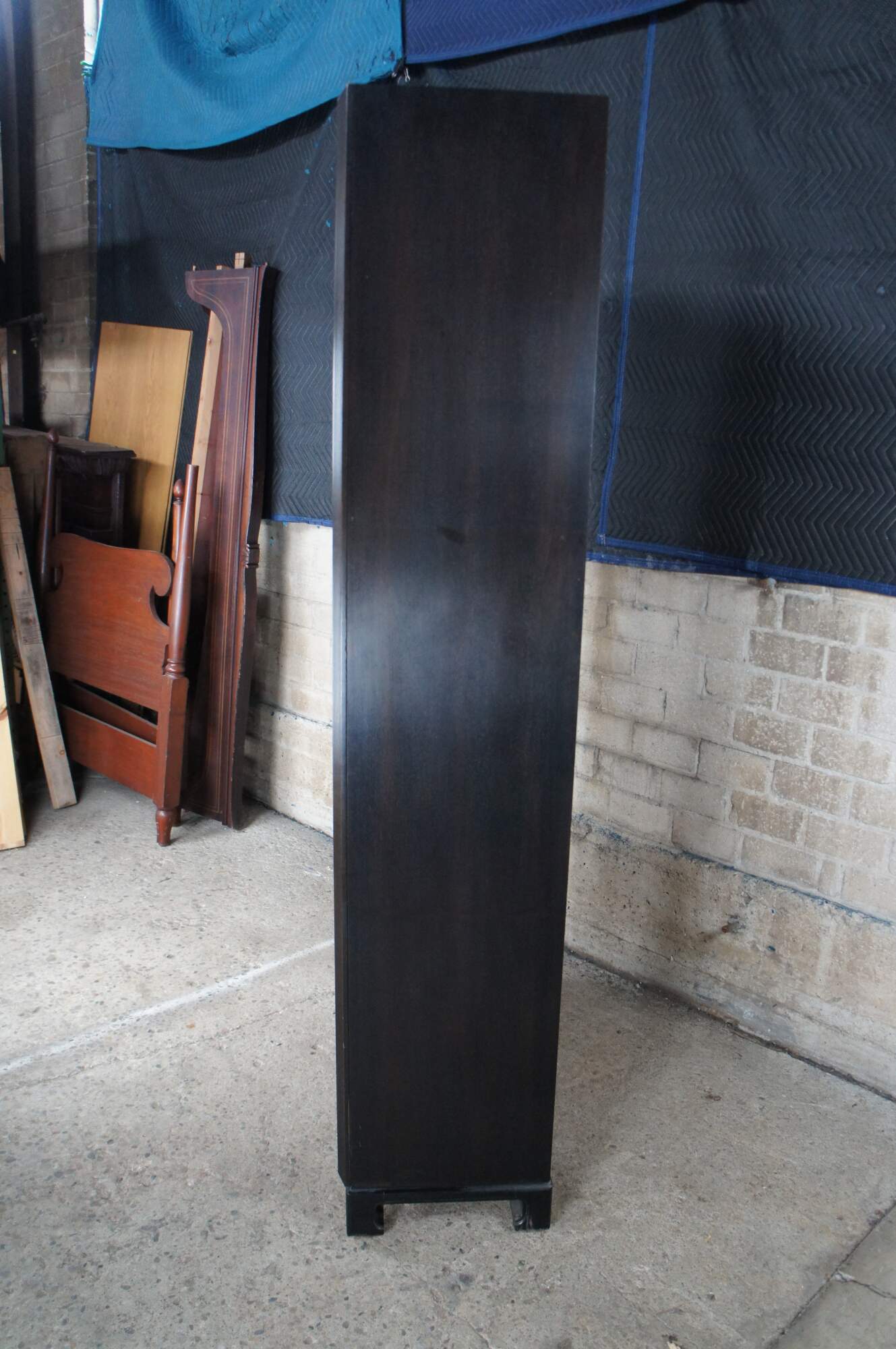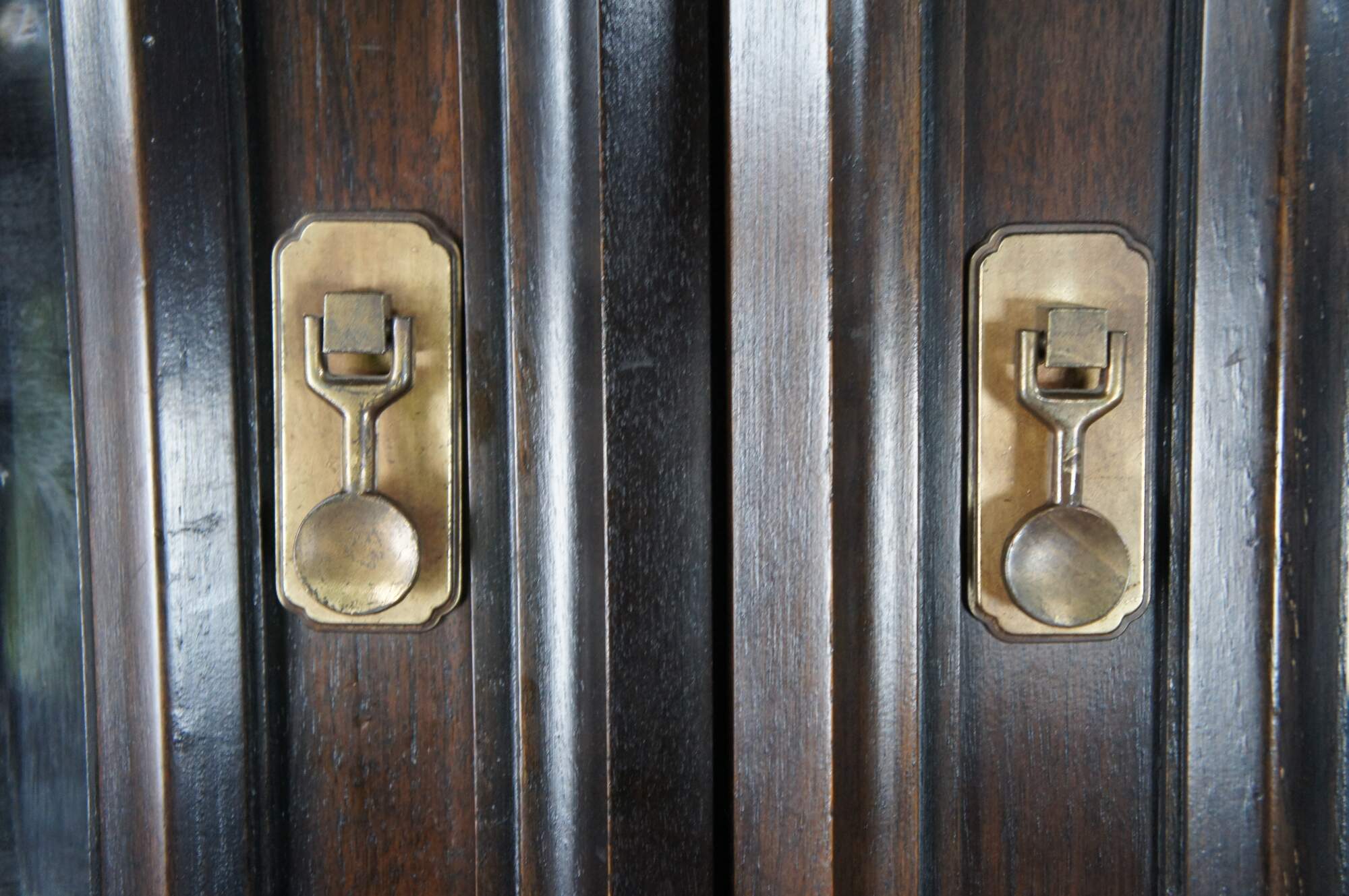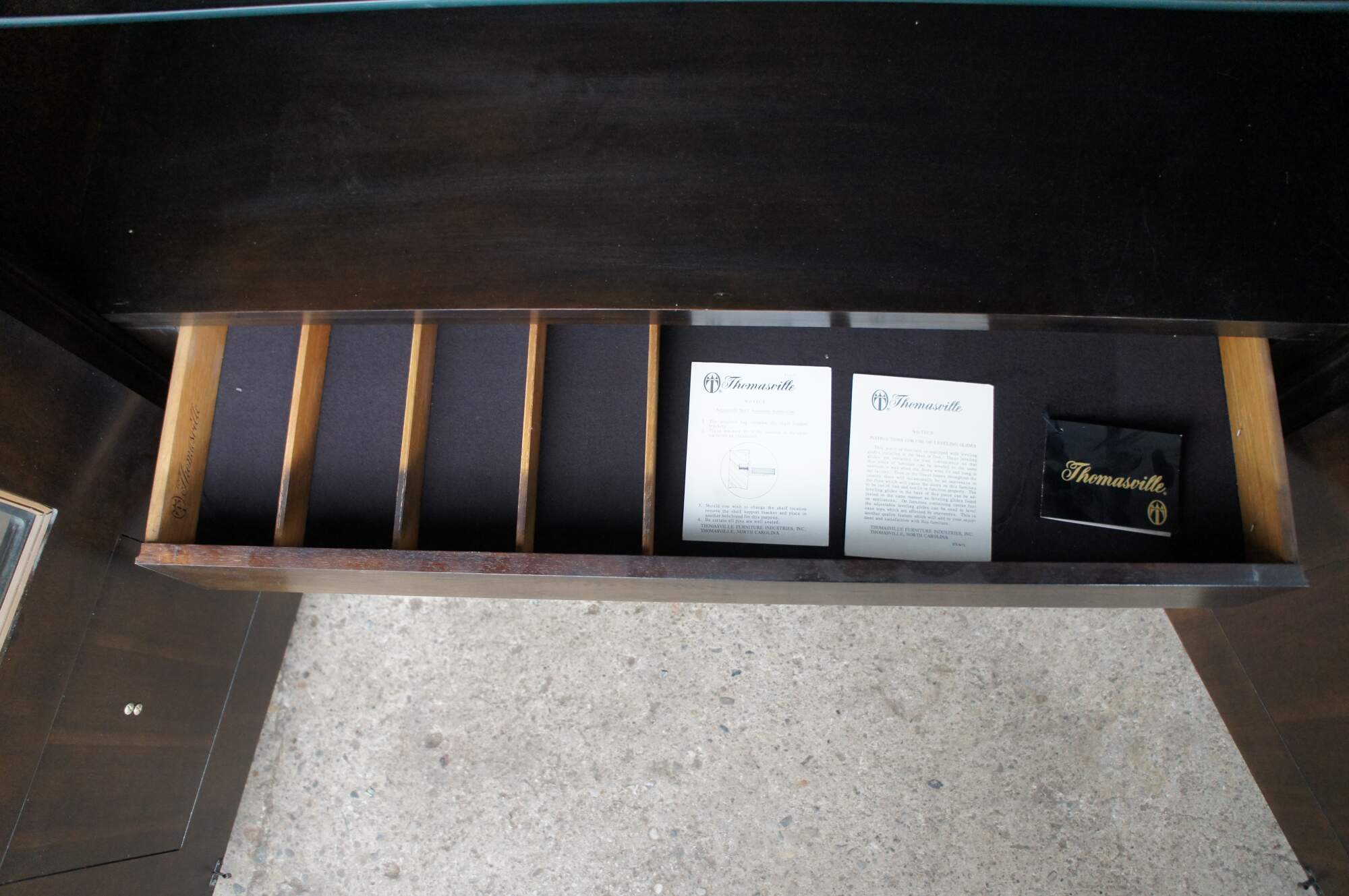 Vintage 1971 Thomasville Furniture bookcase / china cabinet / curio / showcase / drybar / hutch. Made of walnut featuring chinoiserie styling with beveled glass and burl walnut paneled doors - accented with brass ring knocker style hardware. The cabinet doors open to three illuminated shelves with plate grooves and one lower divided silverware drawer. 6529-410.