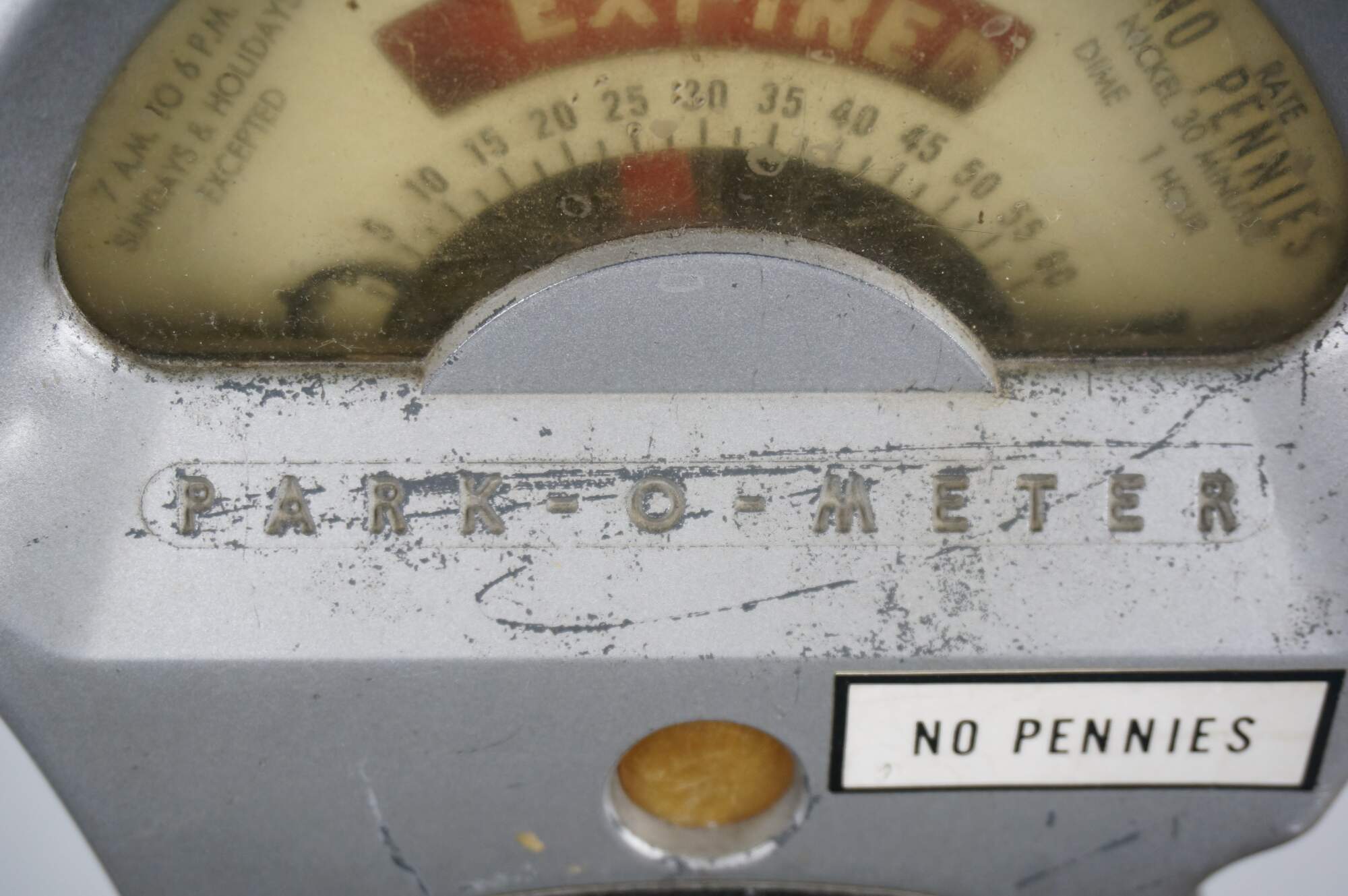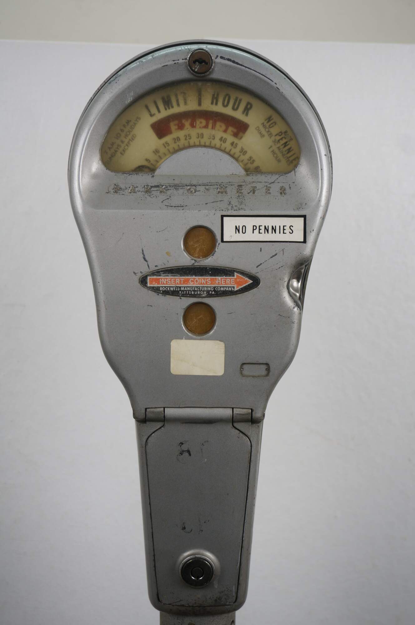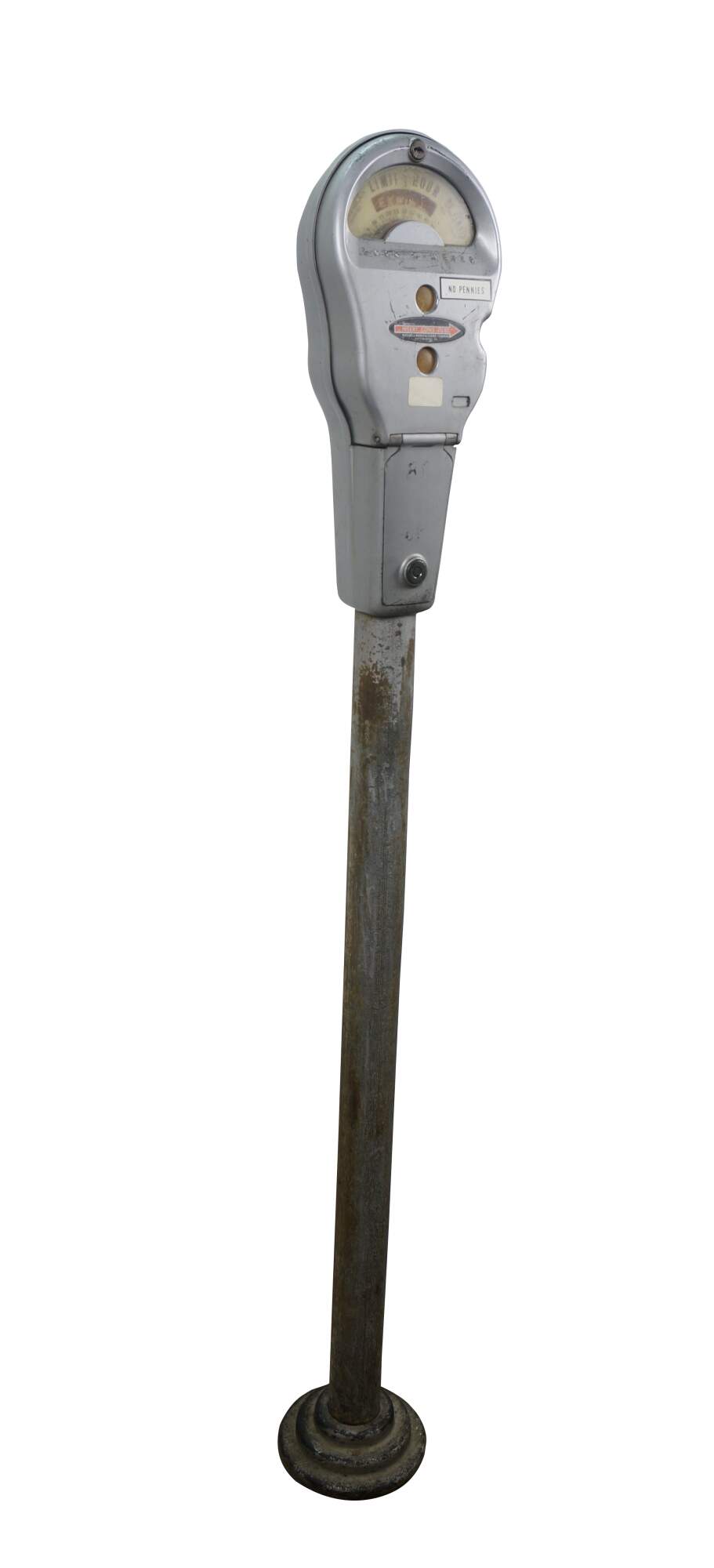 Mid to late 20th century Park-o-Meter coin operated, One Hour Limit parking meter. Silver painted guitar-shaped head mounted on original iron post and round base. Manufactured by the Rockwell Manufacturing Company, Pittsburgh, PA.