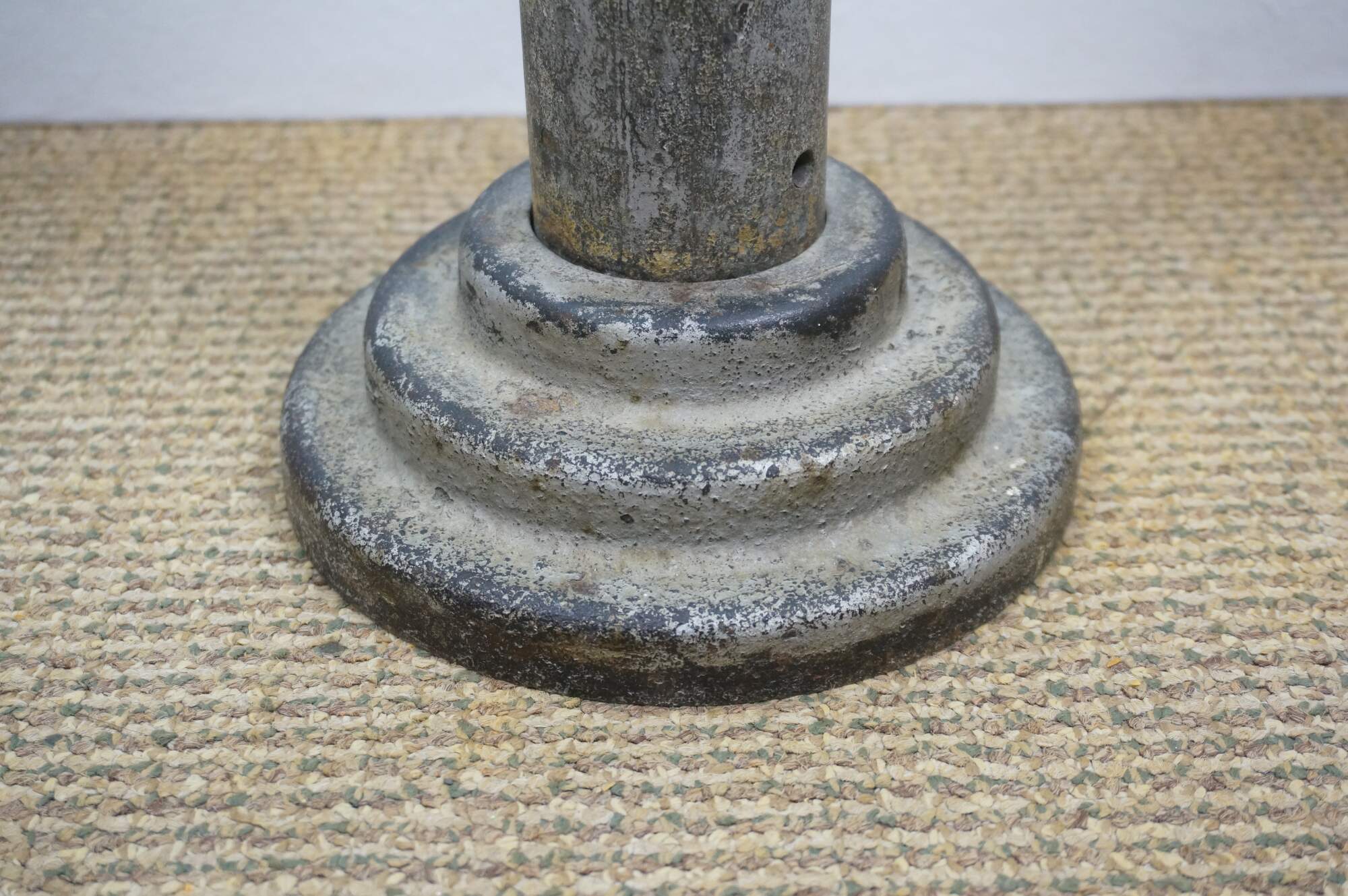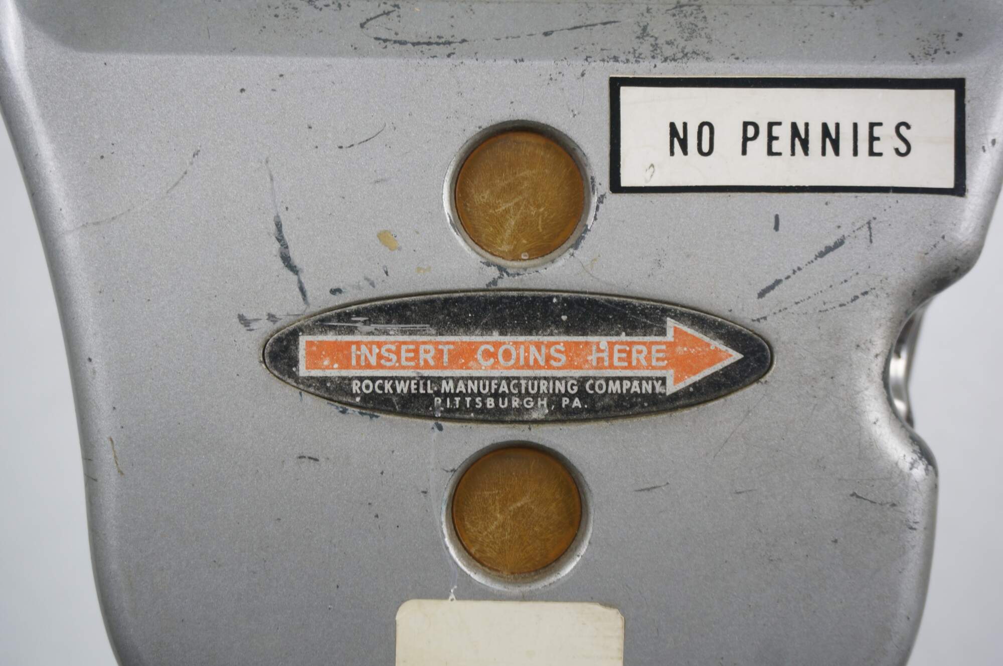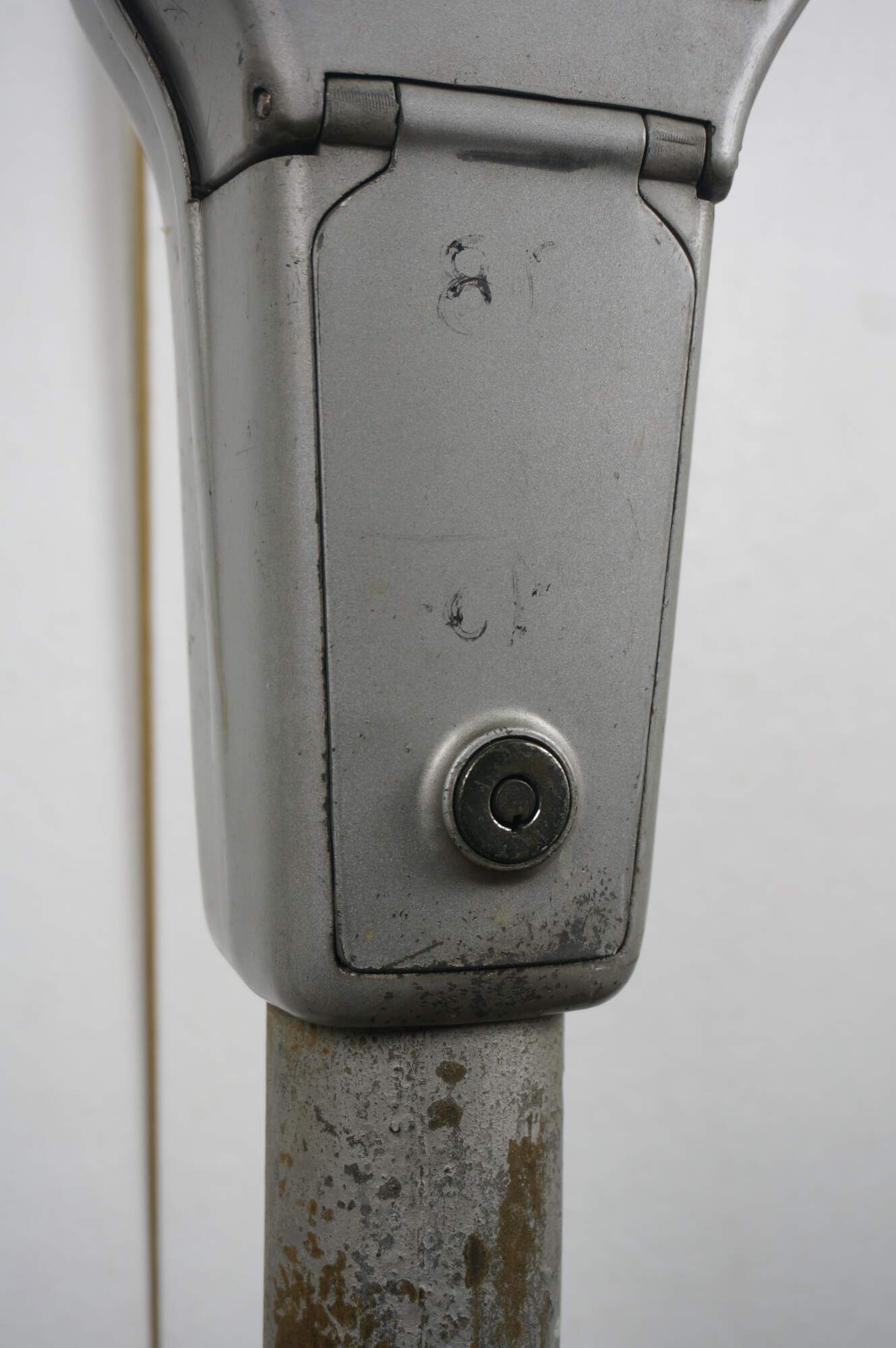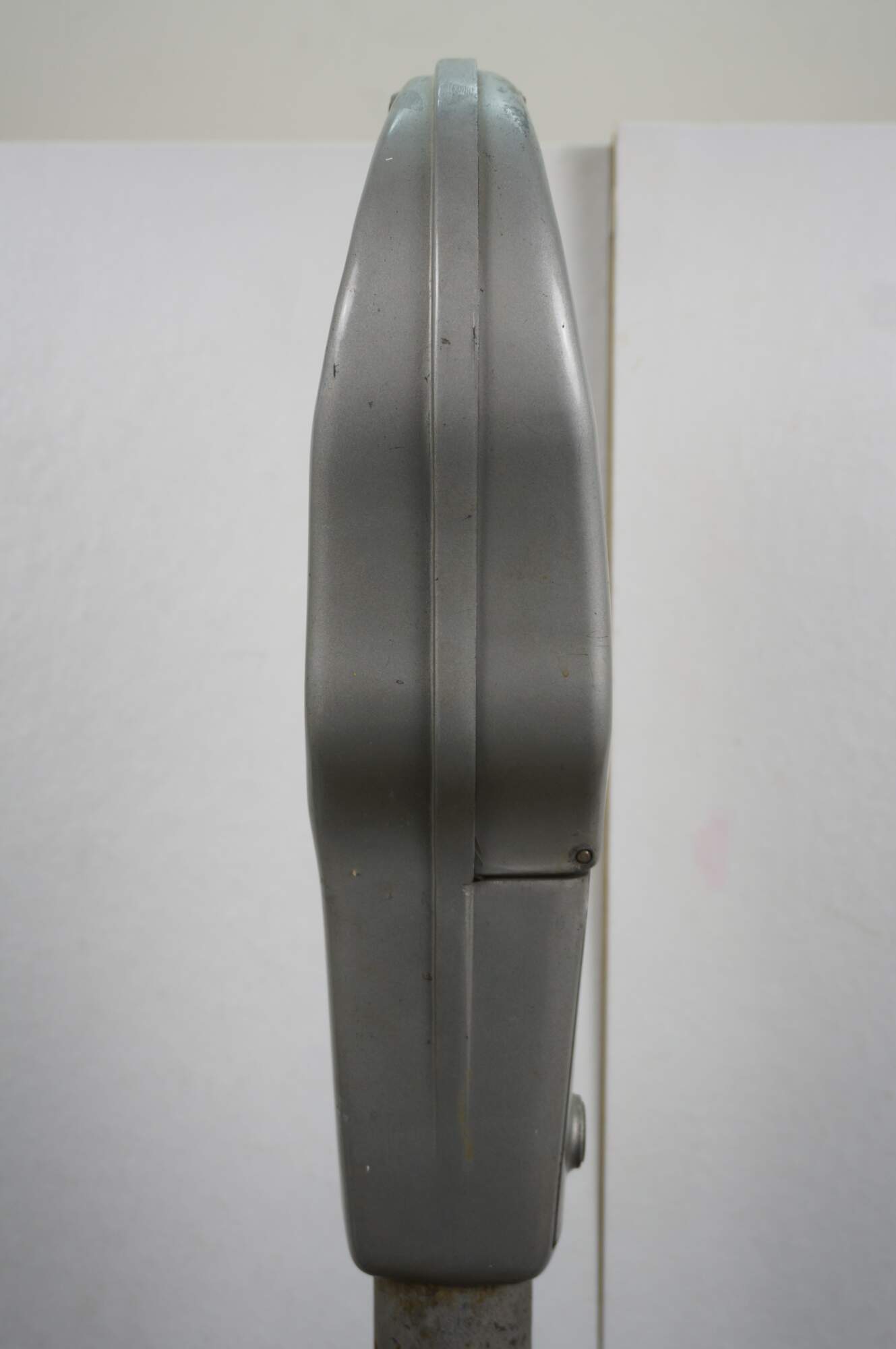 Mid to late 20th century Park-o-Meter coin operated, One Hour Limit parking meter. Silver painted guitar-shaped head mounted on original iron post and round base. Manufactured by the Rockwell Manufacturing Company, Pittsburgh, PA.