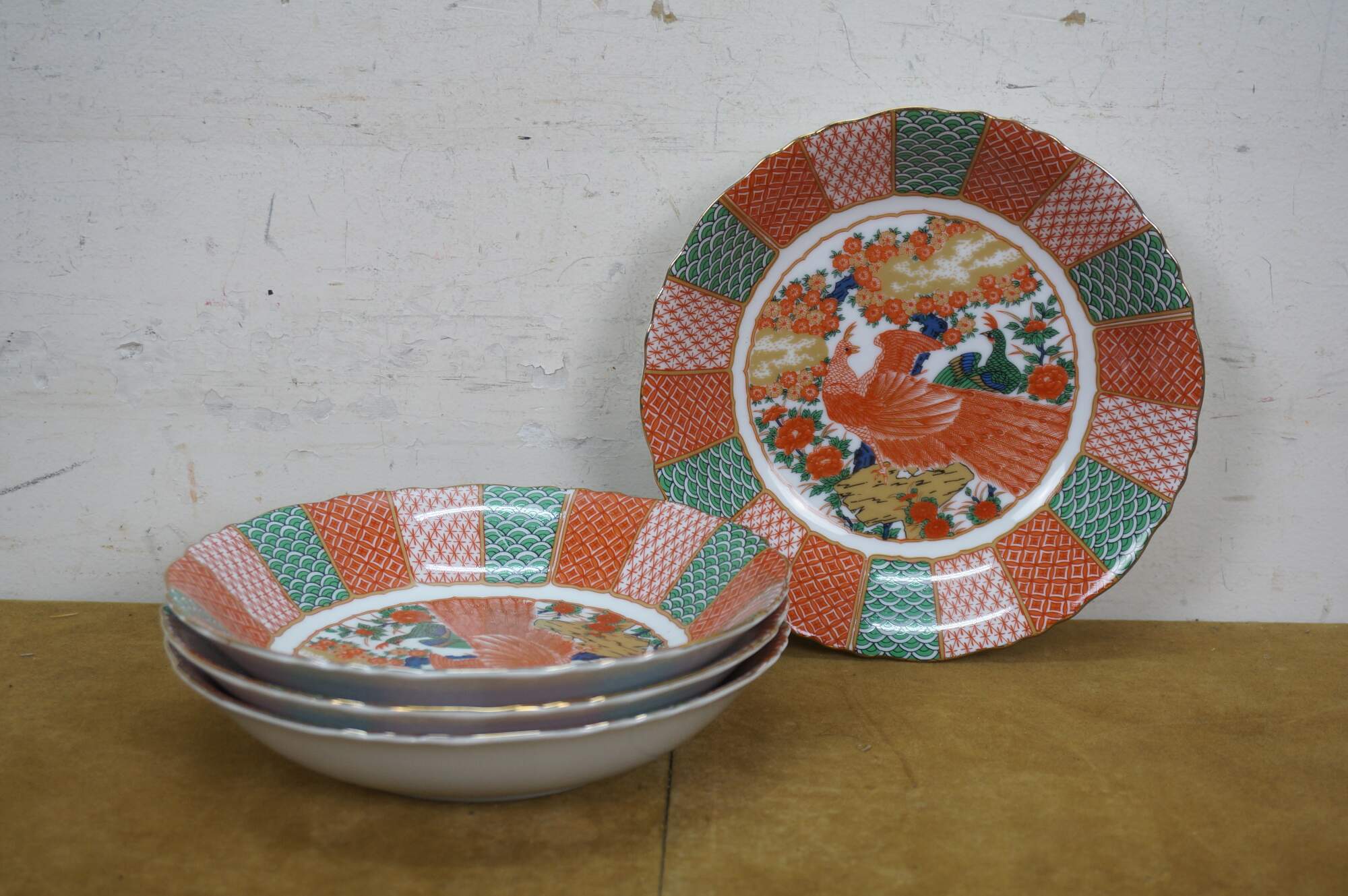 Late 20th century Arita Japan Imari porcelain dinnerware. White porcelain hand painted with a red-orange, green, gold and blue imari style design of a pair of peacocks under a flowering tree. Includes service for four: 4 Dinner Plates, 4 Soup Bowls, 4 Bread Plates, 4 Saucers, 4 Teacups.
