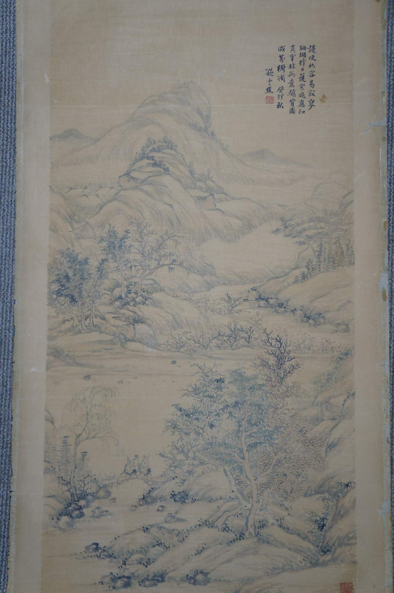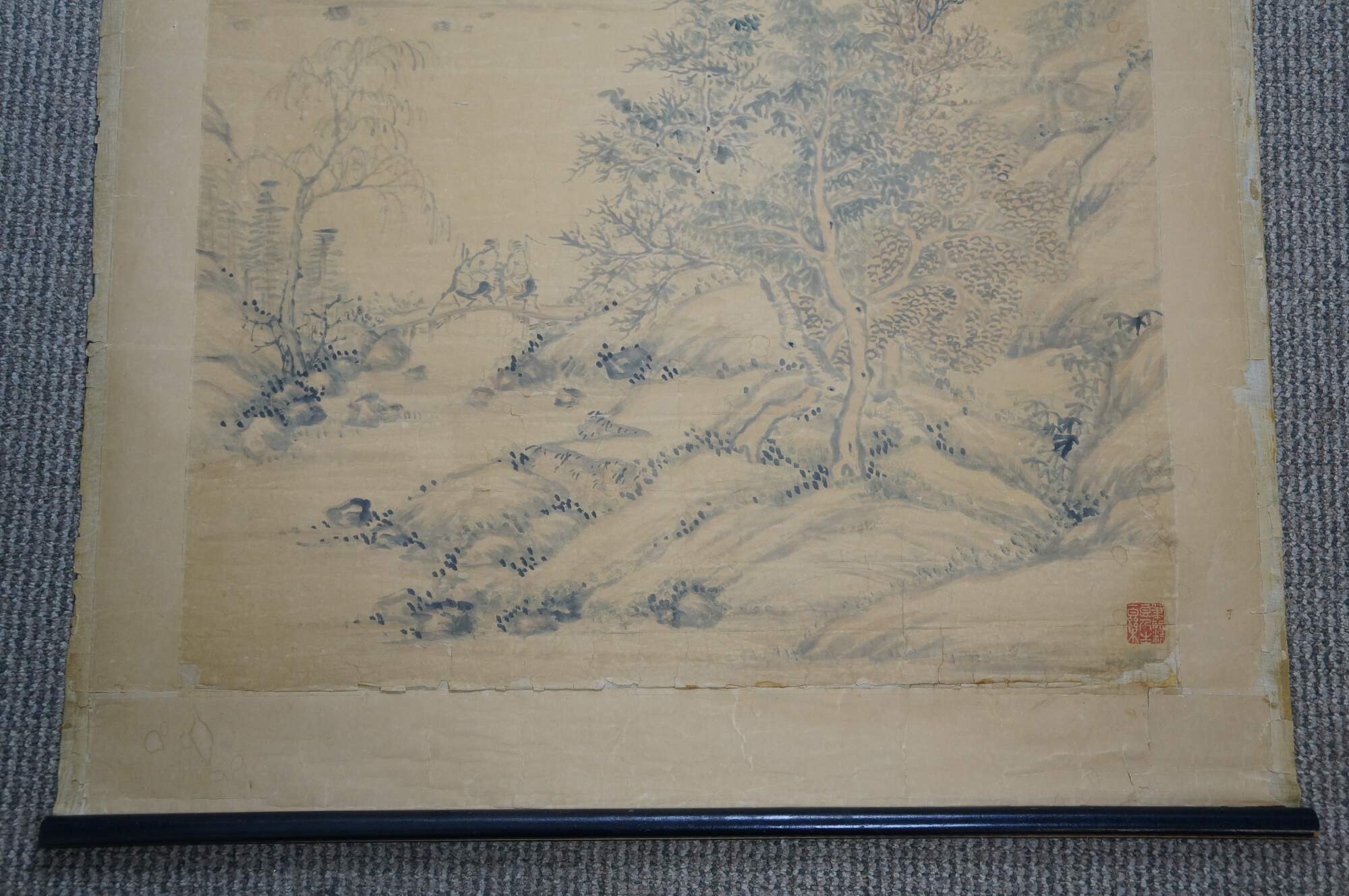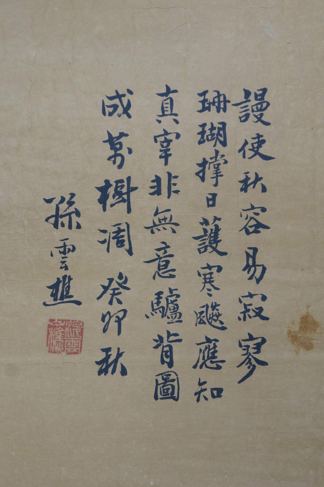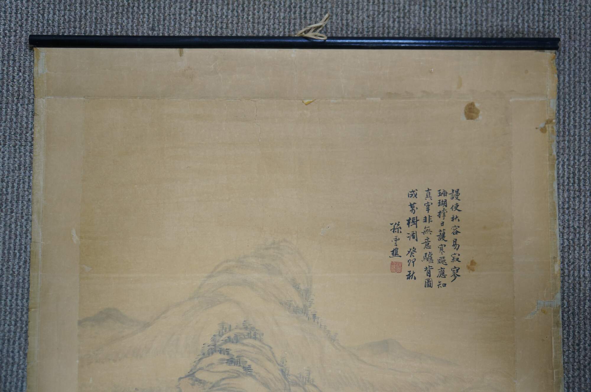 Mid to early century Chinese wall hanging scroll, painted with a pair of figures riding donkeys, crossing a bridge against a landscape of mountains and gnarled pines; by artist Sun Yunqiao. Sealed in the lower right corner. Paper on silk.