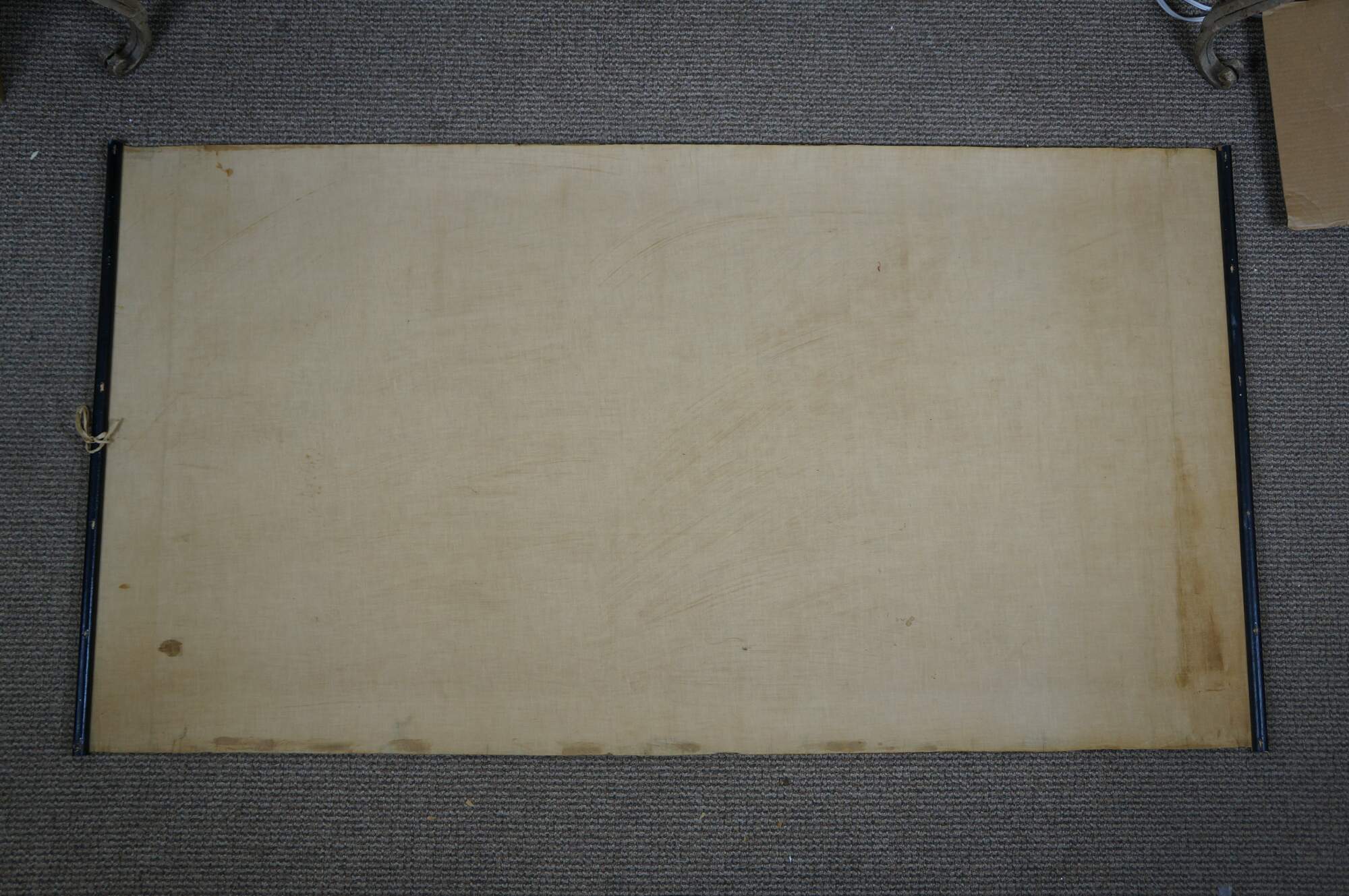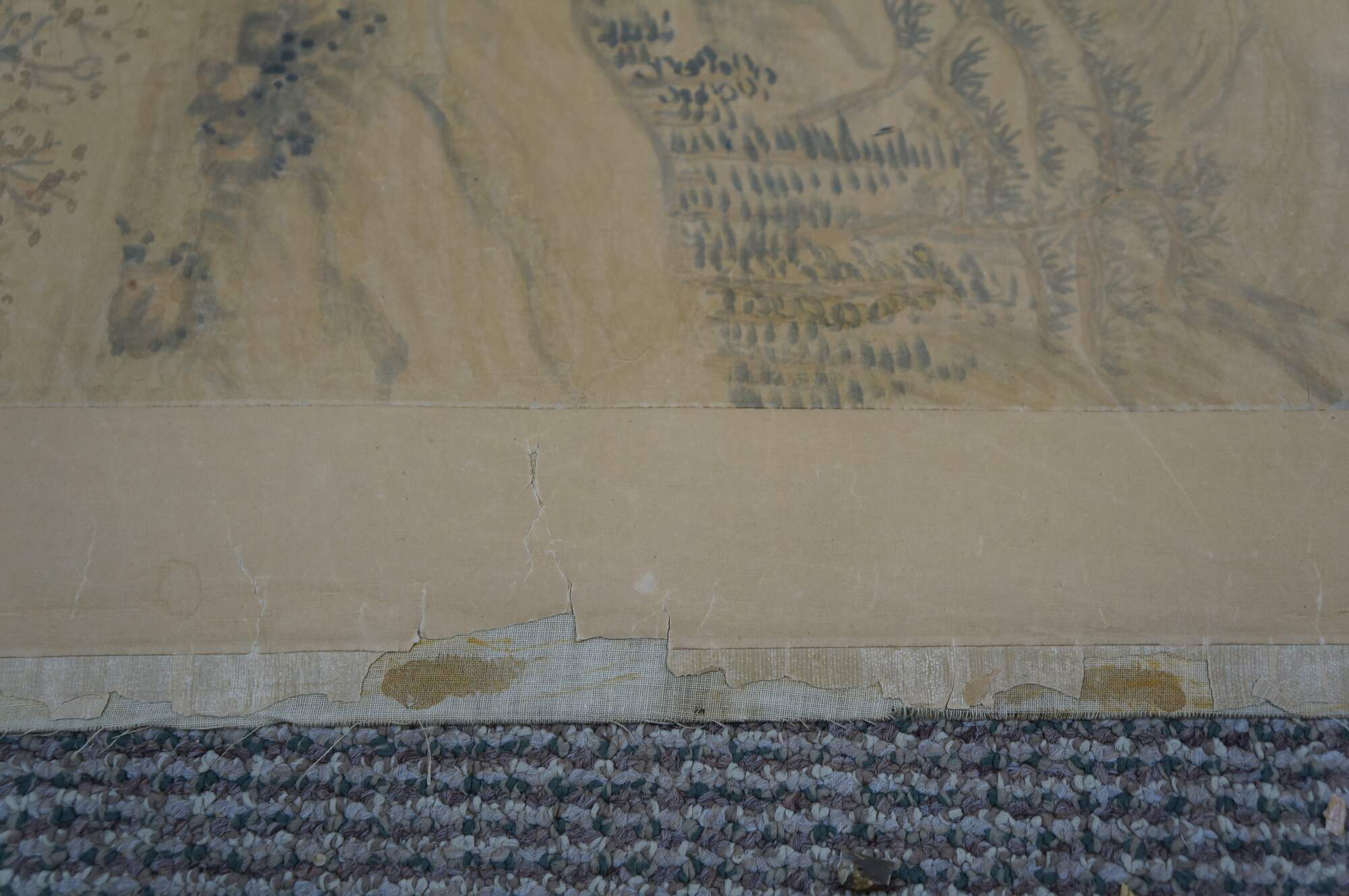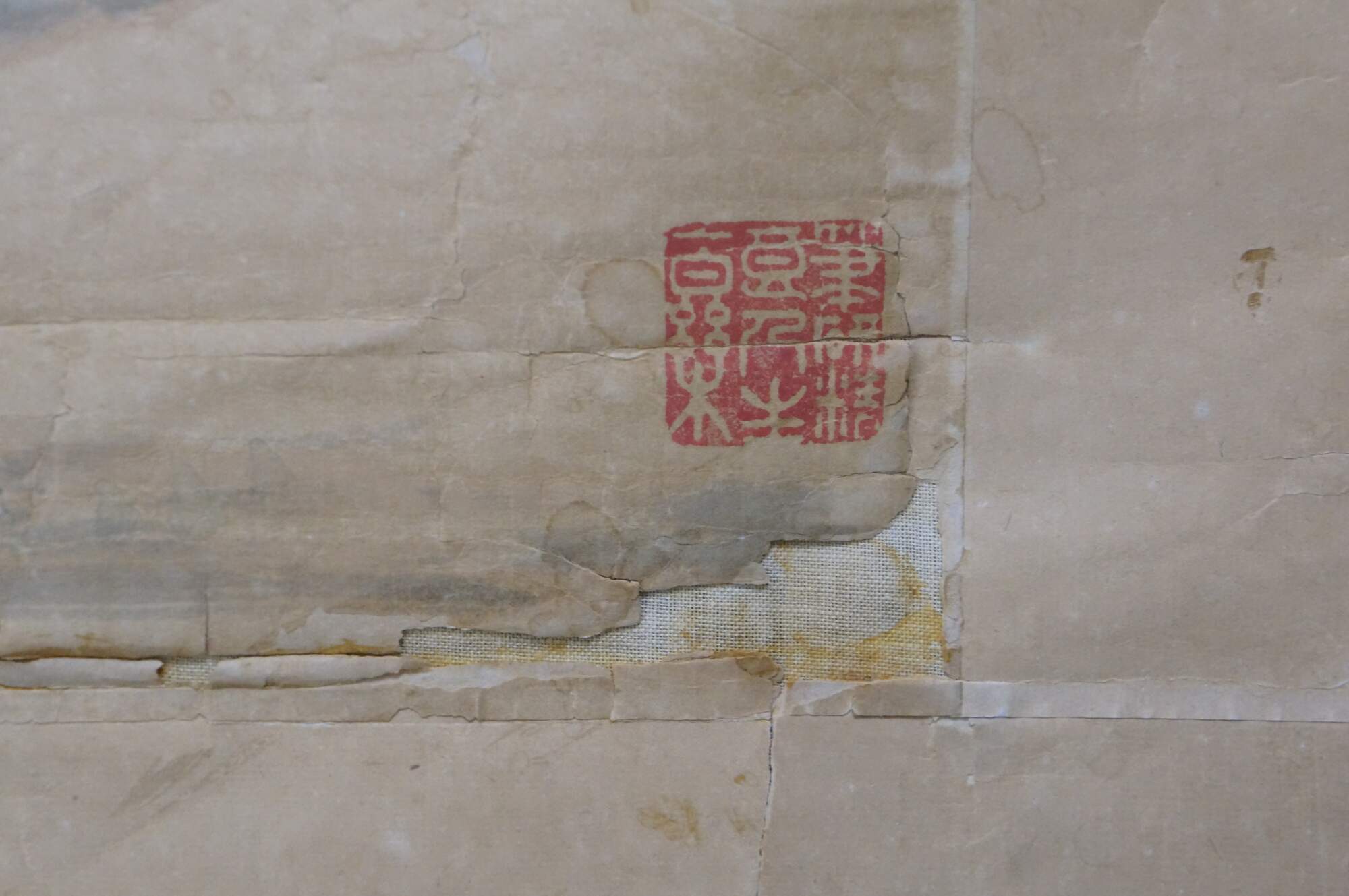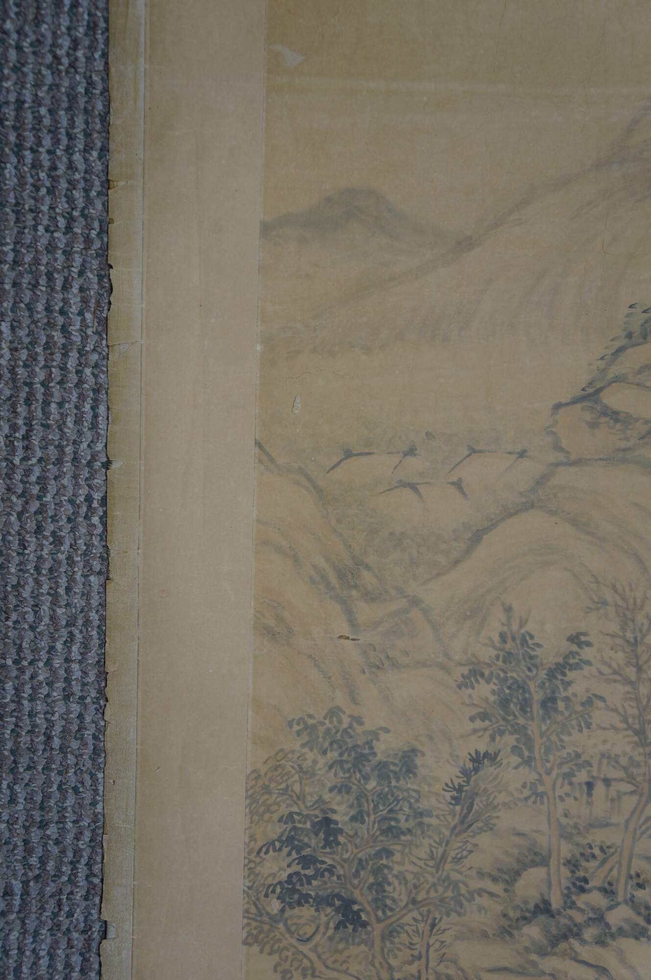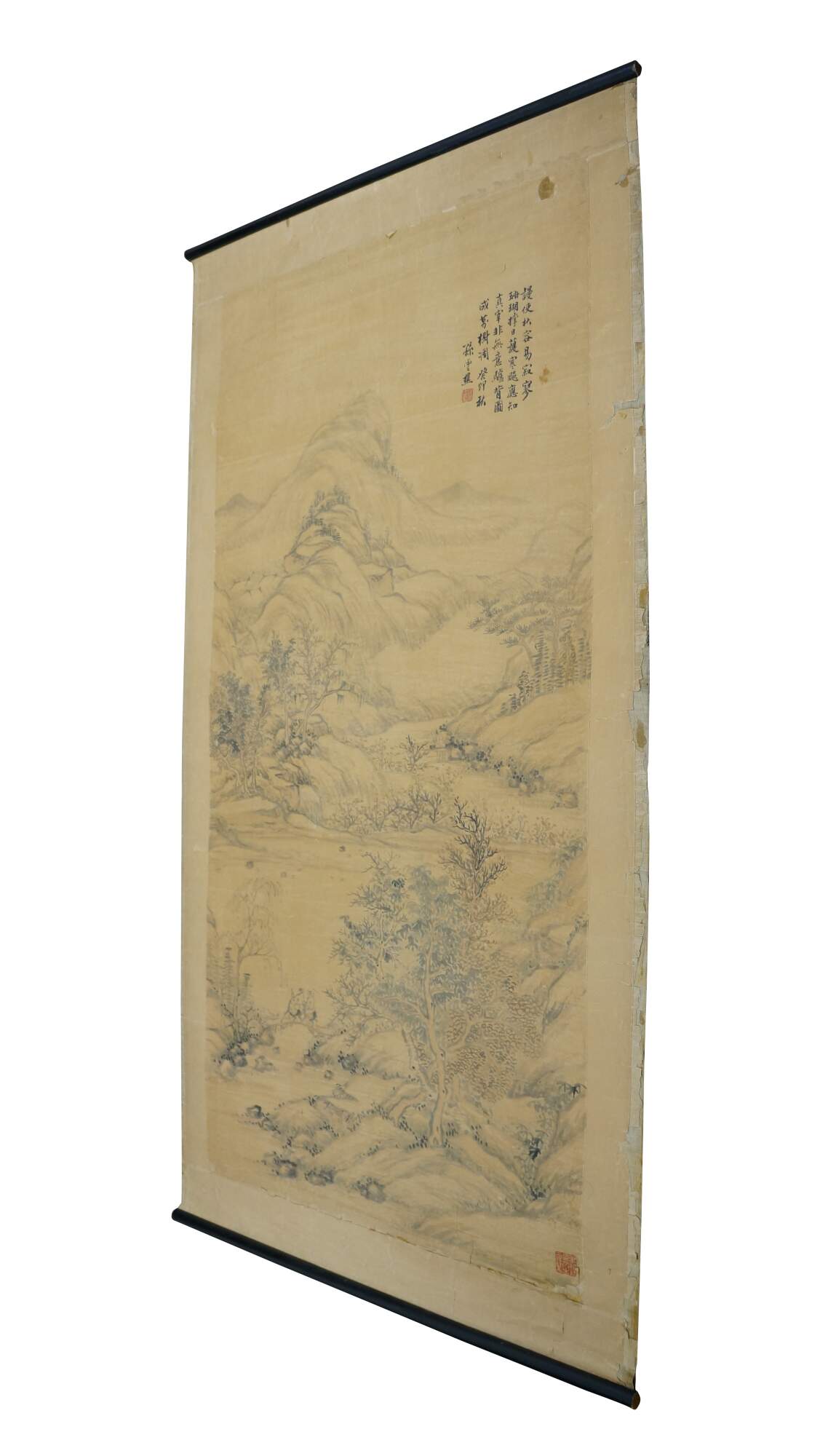 Mid to early century Chinese wall hanging scroll, painted with a pair of figures riding donkeys, crossing a bridge against a landscape of mountains and gnarled pines; by artist Sun Yunqiao. Sealed in the lower right corner. Paper on silk.