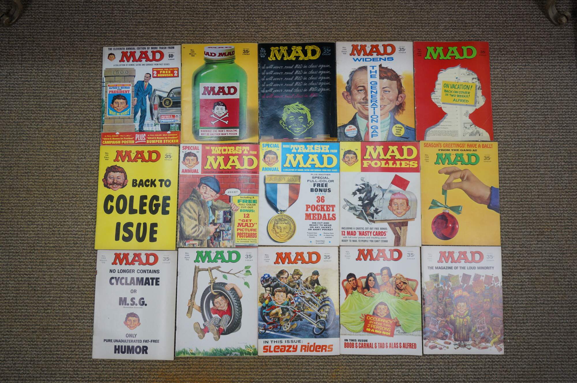 Lot of 155 assorted issues of MAD Magazine spanning from the 1960s-1990, plus one August 1971 issue of Cracked Magazine. Varous levels of wear from very good to some with covers coming off.