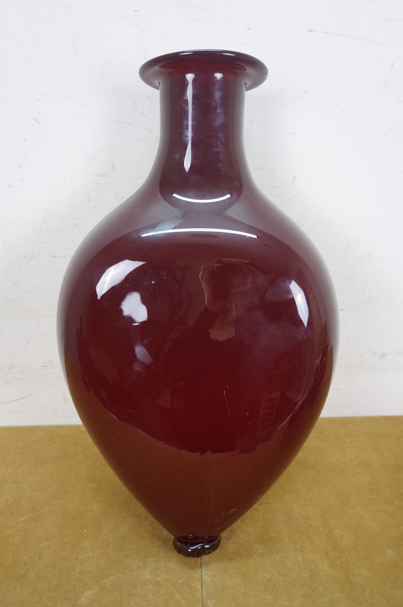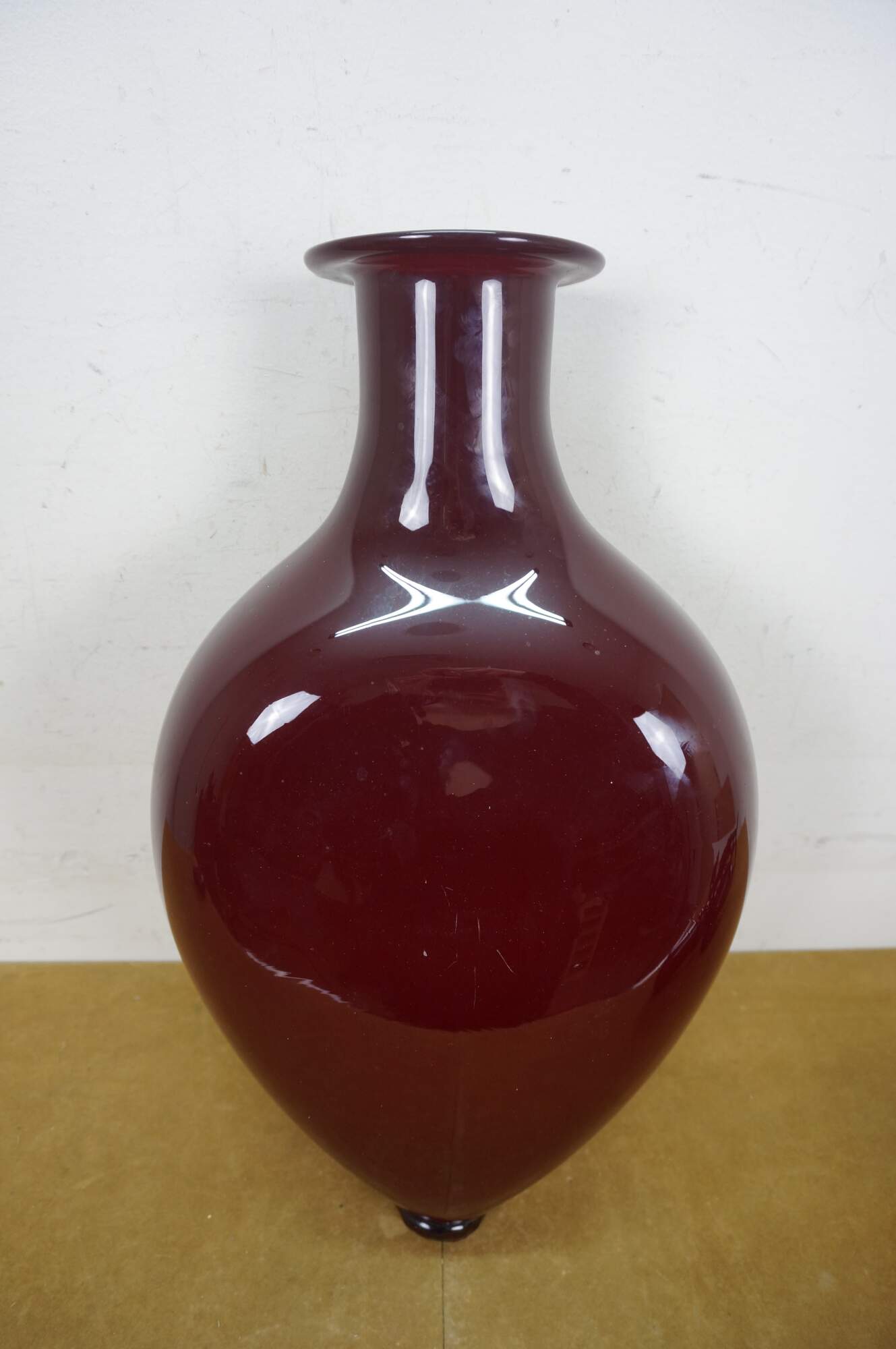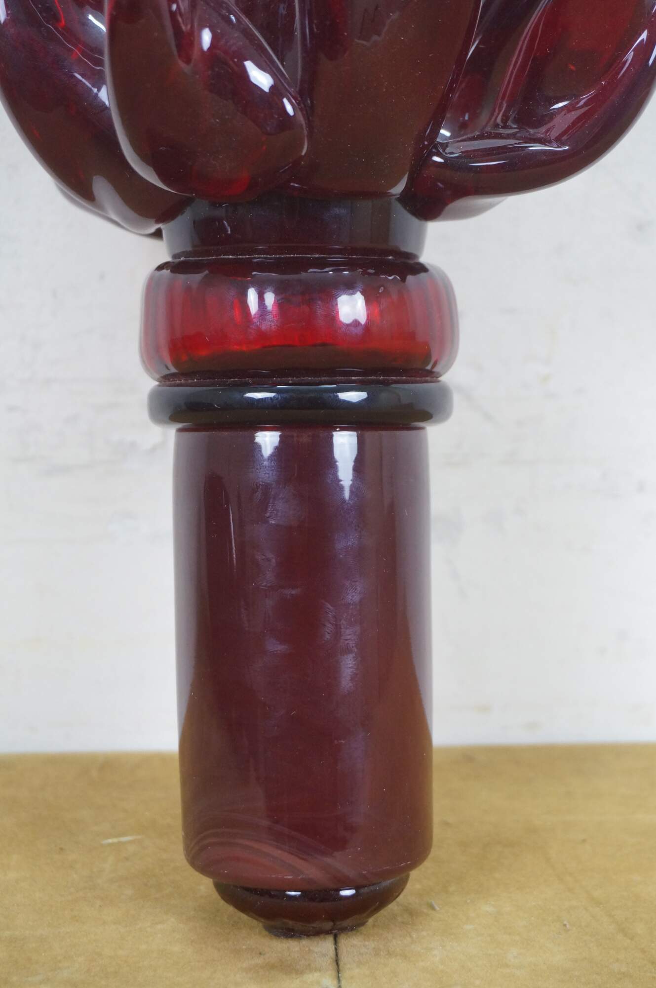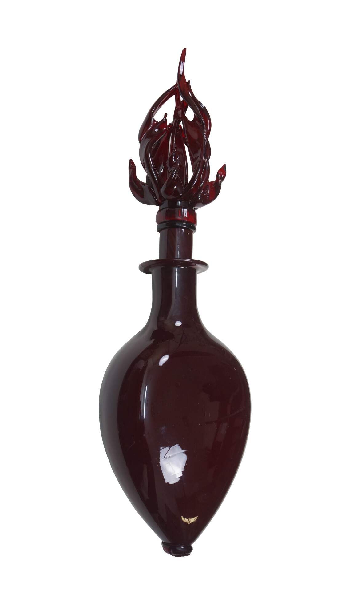Rare vintage Jonathan Christie 1990s oversized decanter / bottle. Crafted of thick hand-blown ruby-red art glass featuring a teardrop /heart-shaped bottle and stopper capped with a twisting flame. Resembles the Christian Sacred Heart of Jesus.
