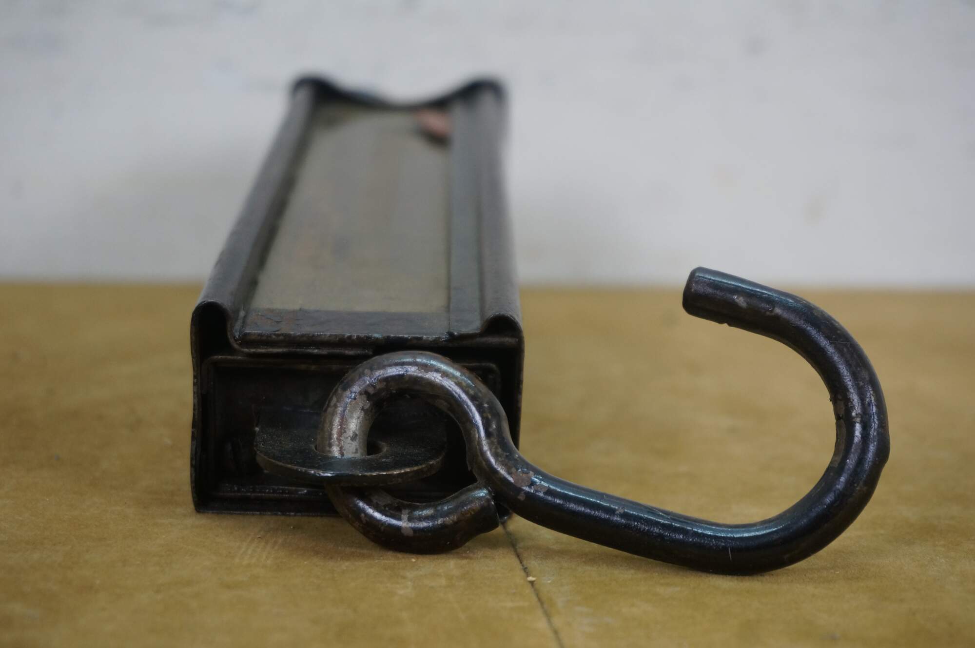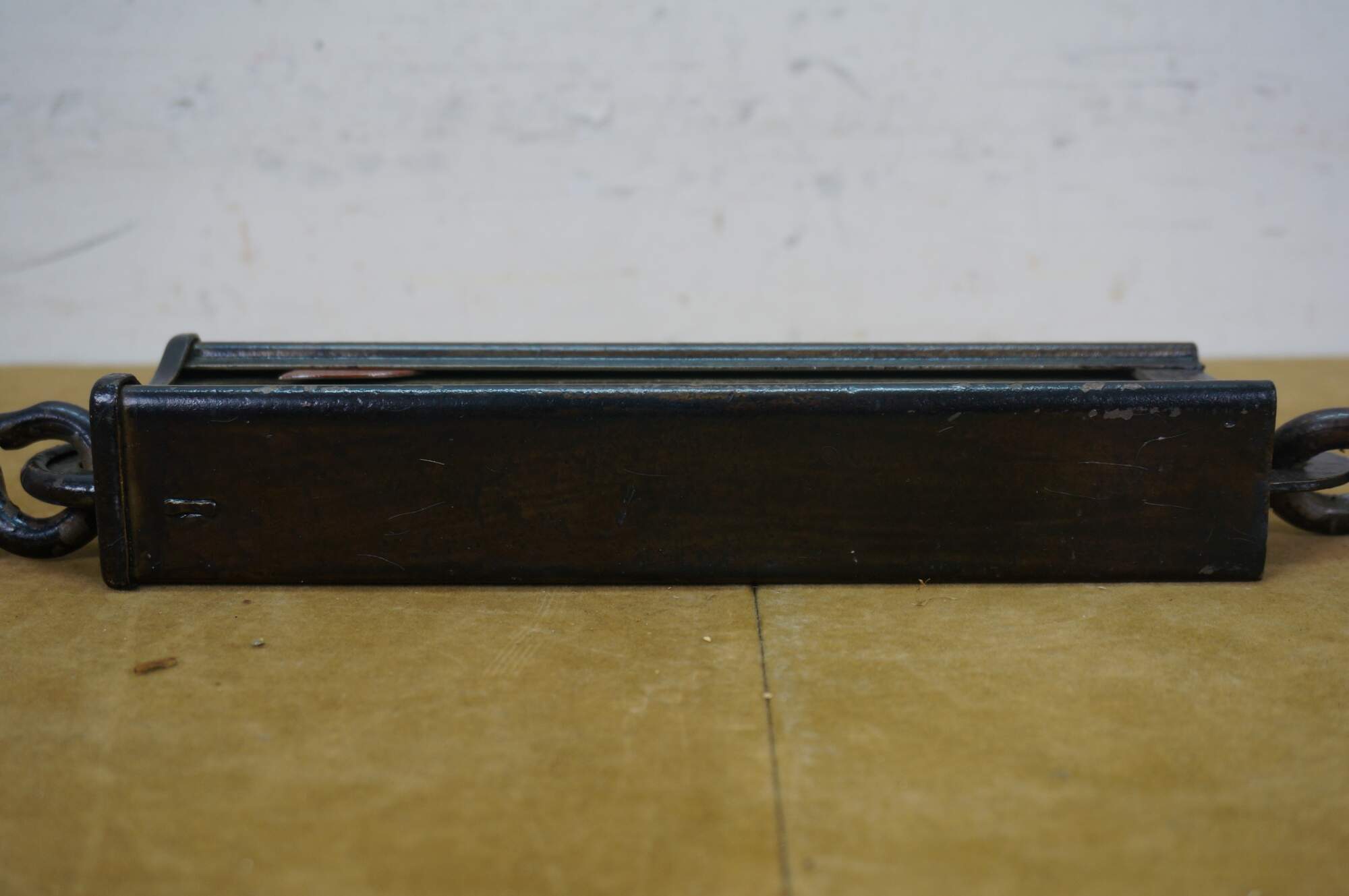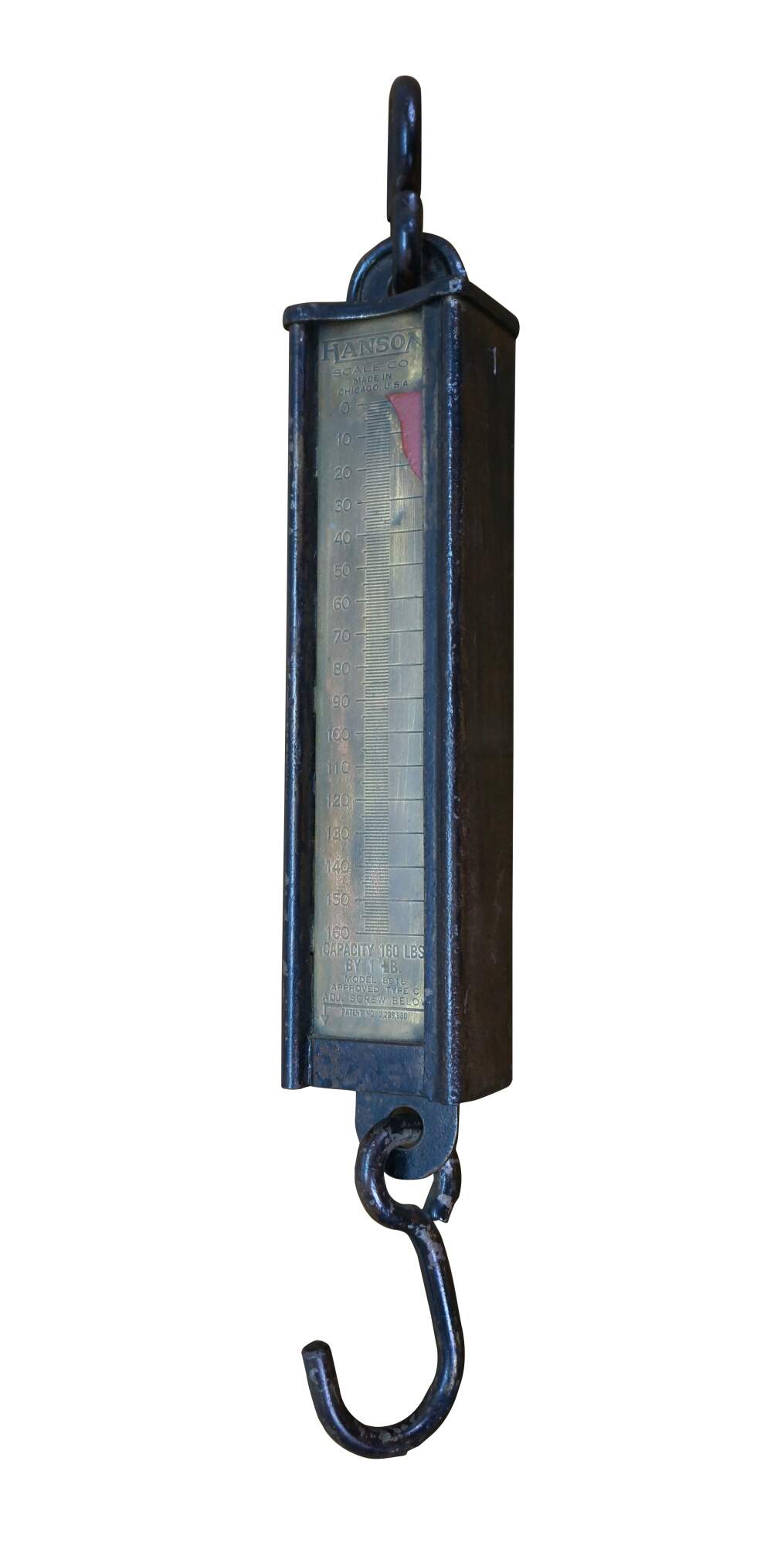 Early 20th century painted iron and brass Hanson Scale Company hanging scale. Made in Chicago, USA - Capacity 160 lbs by 1 lb - Model 8916 - Approved type C - Patent No 2,299,980.