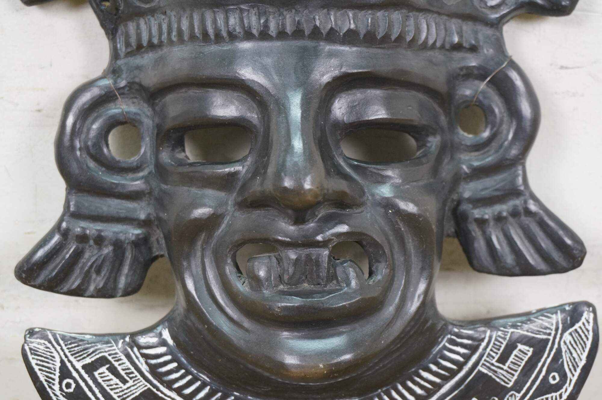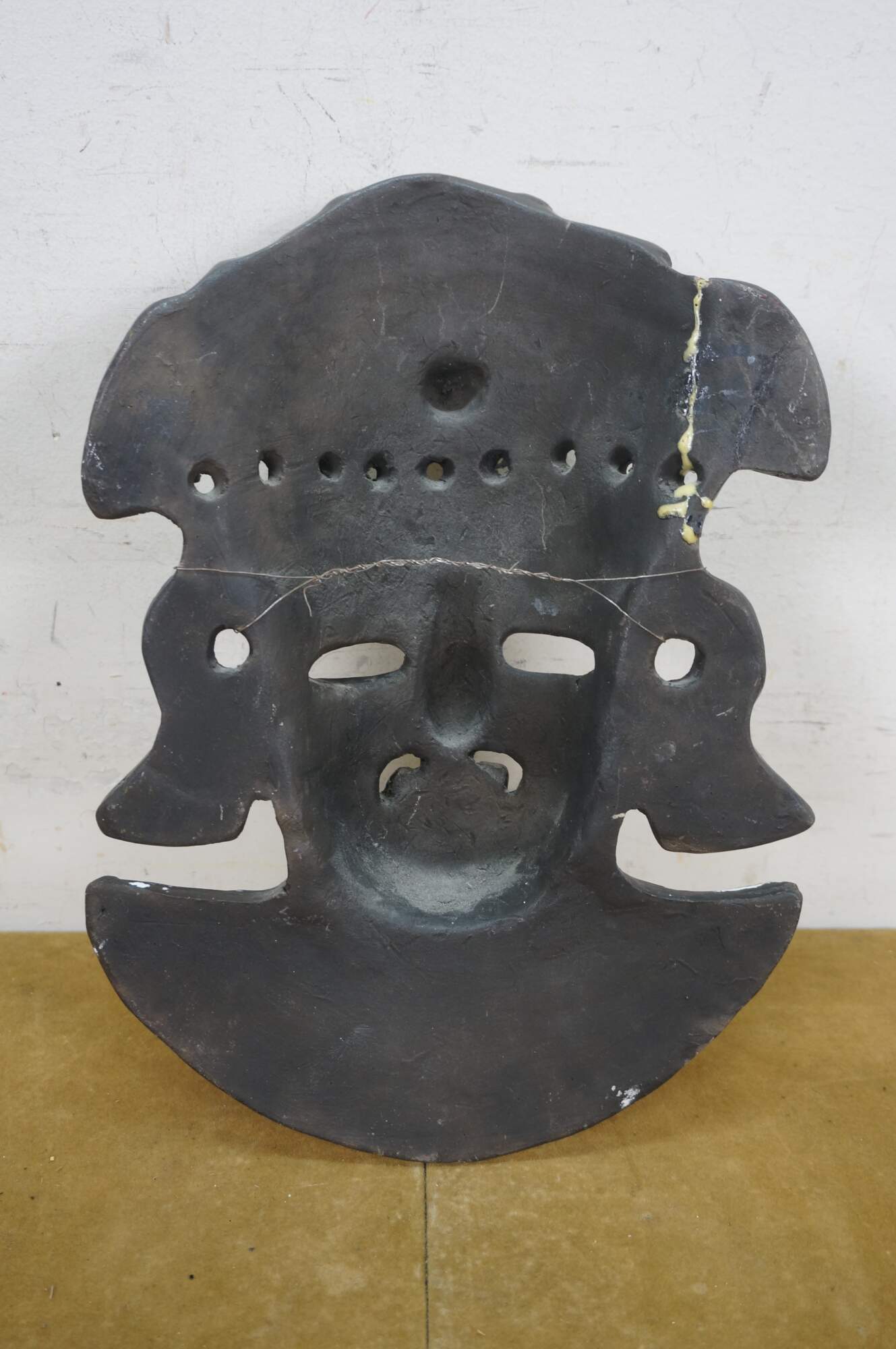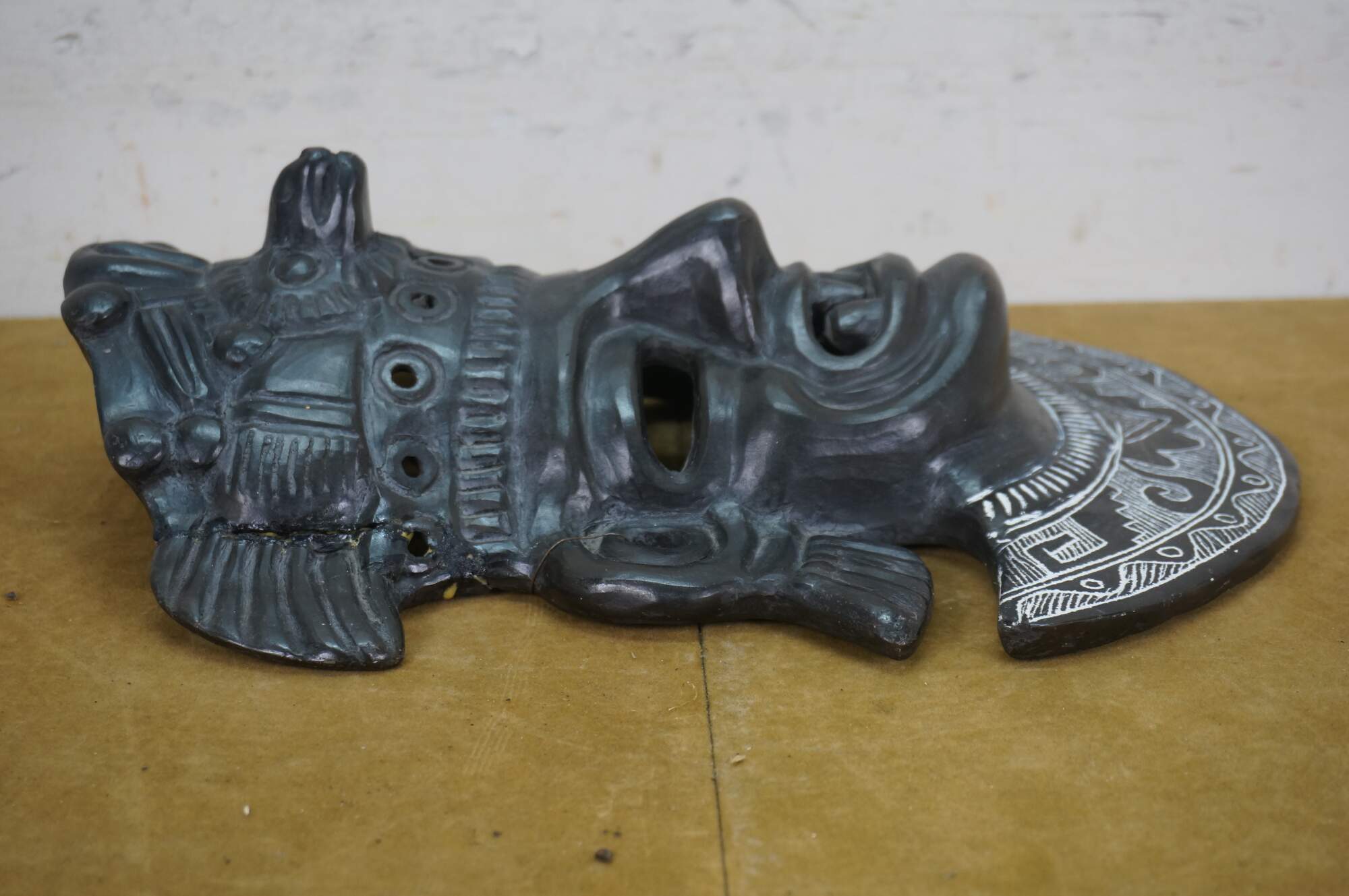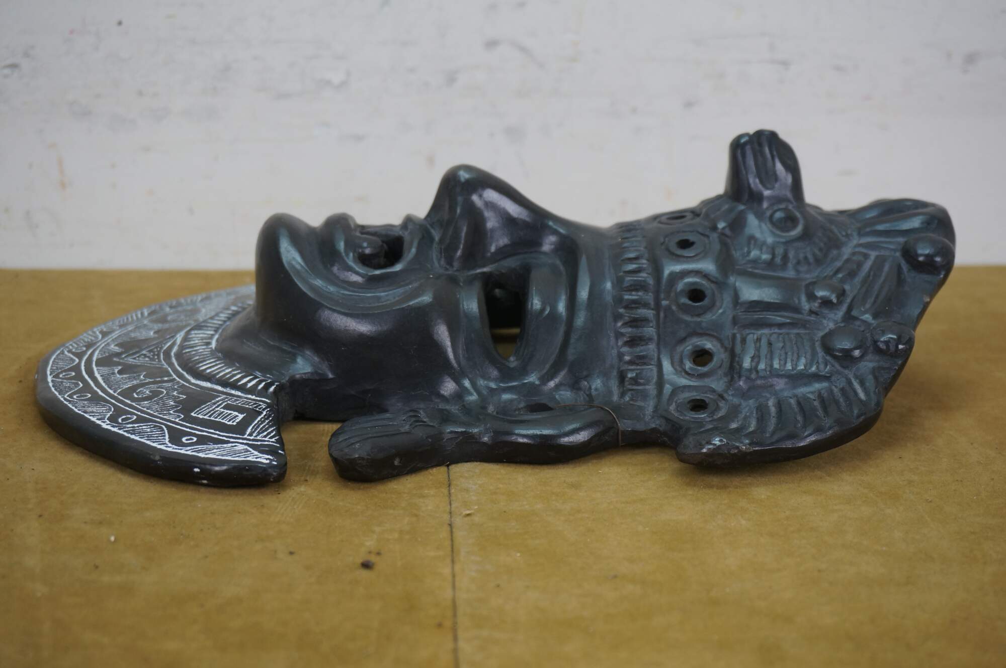 Circa mid-20th century barro negro / black clay Mexican folk art pottery Mayan / Aztec style wall hanging mask, with white painted details on the collar. Deity Cthulhu.