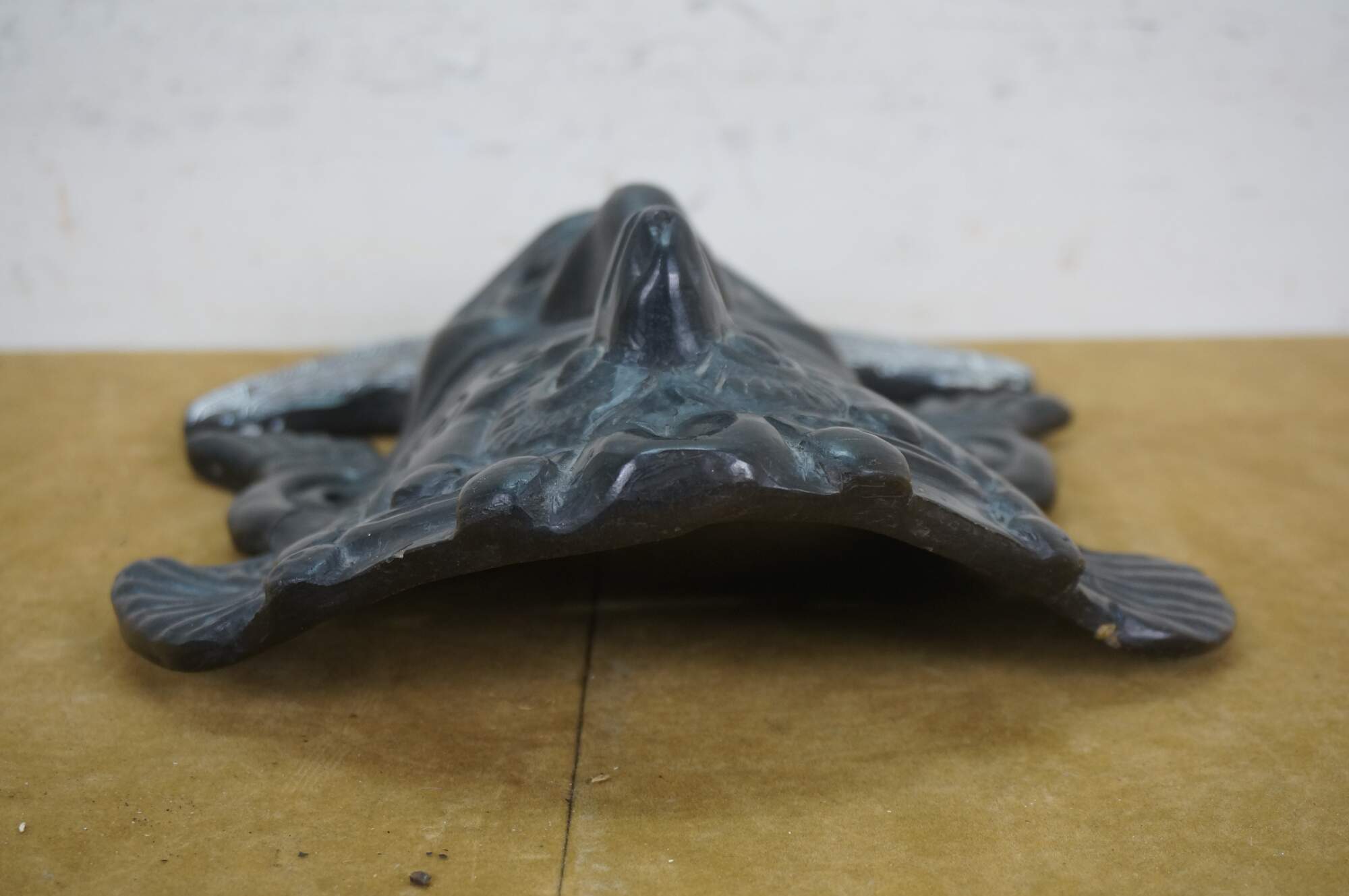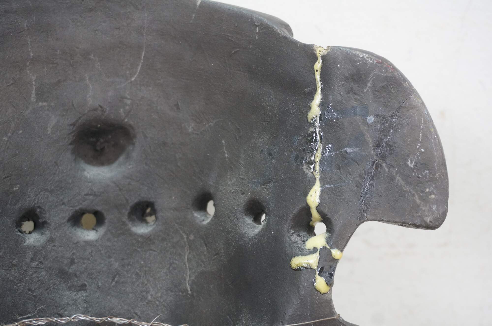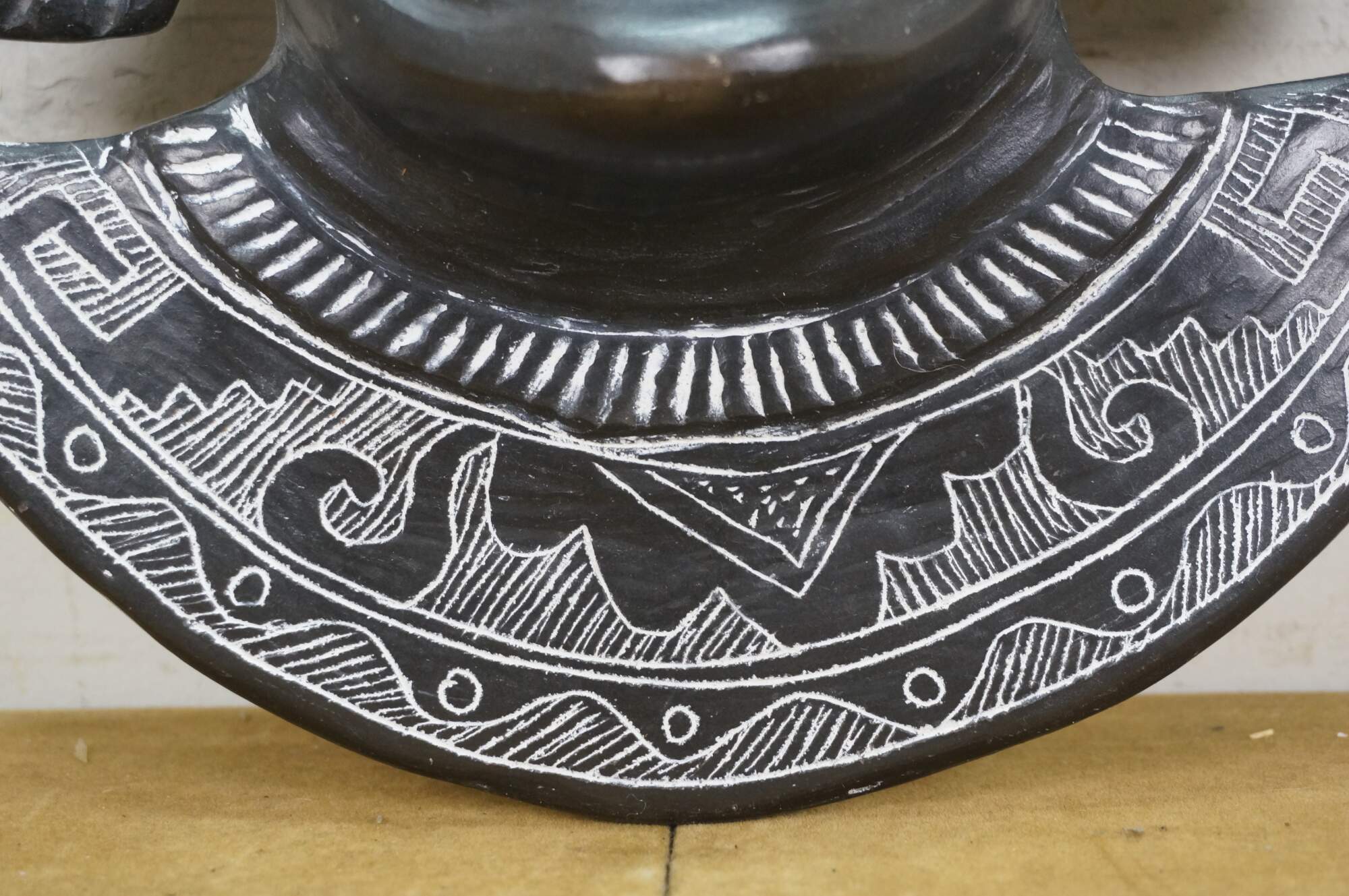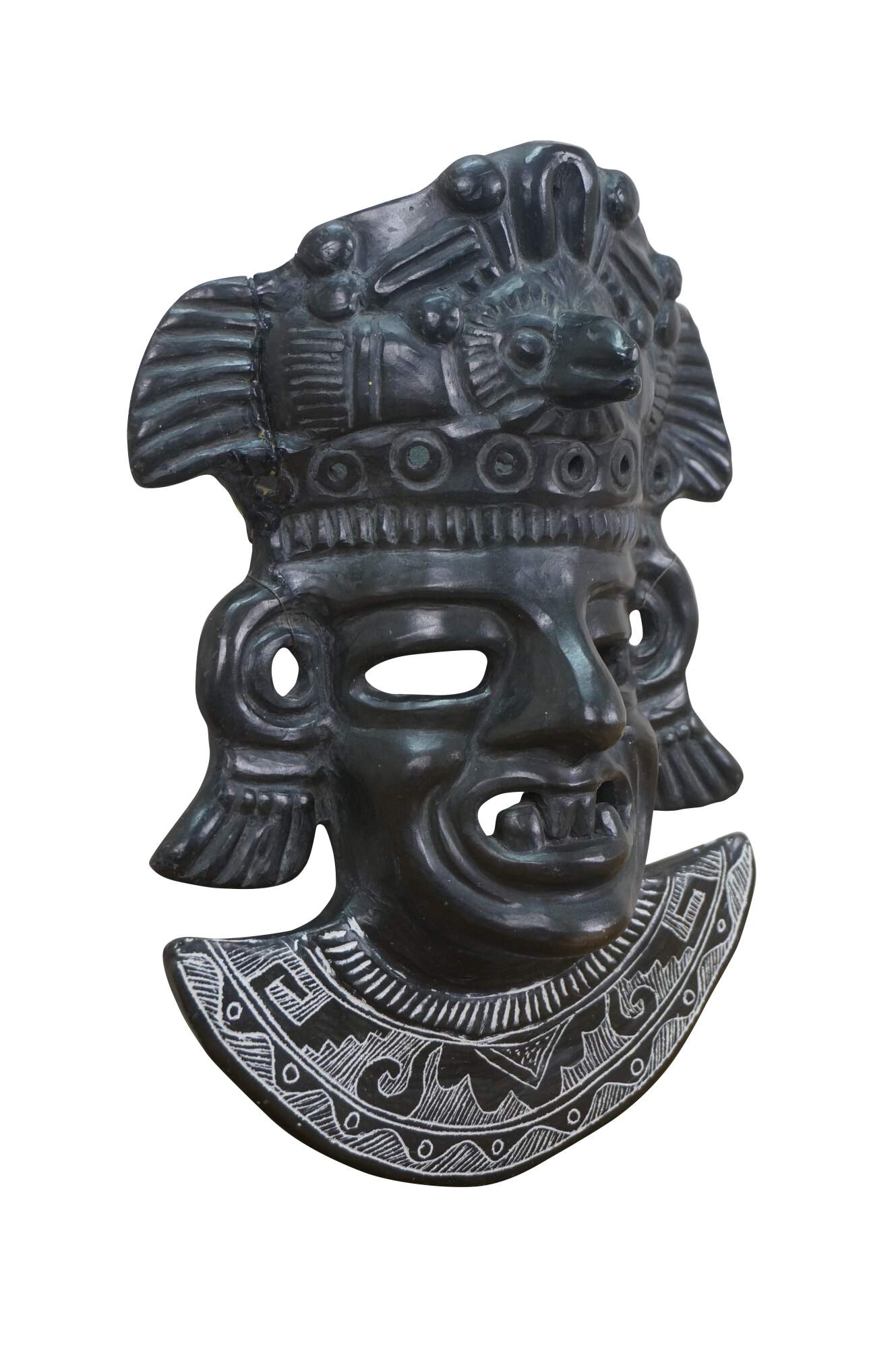 Circa mid-20th century barro negro / black clay Mexican folk art pottery Mayan / Aztec style wall hanging mask, with white painted details on the collar. Deity Cthulhu.