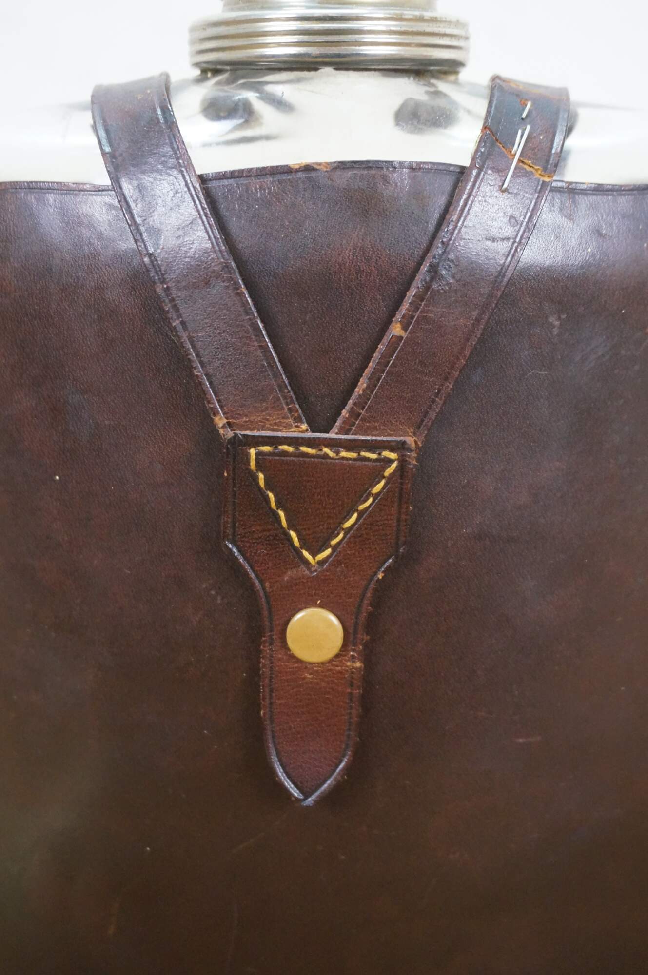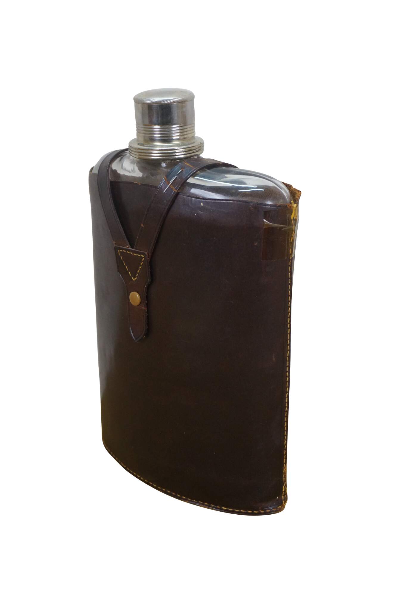 Circa mid-20th century oversized glass hip flask with silver plate screw cap and brown leather case. Purchased from the EH Crump Estate, accompanied by a business card from an antique store where it was likely purchased.