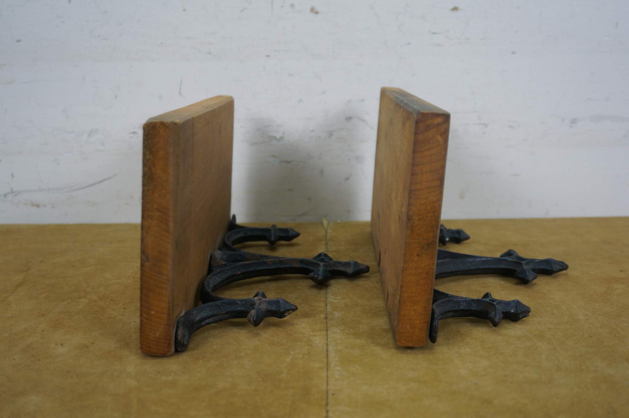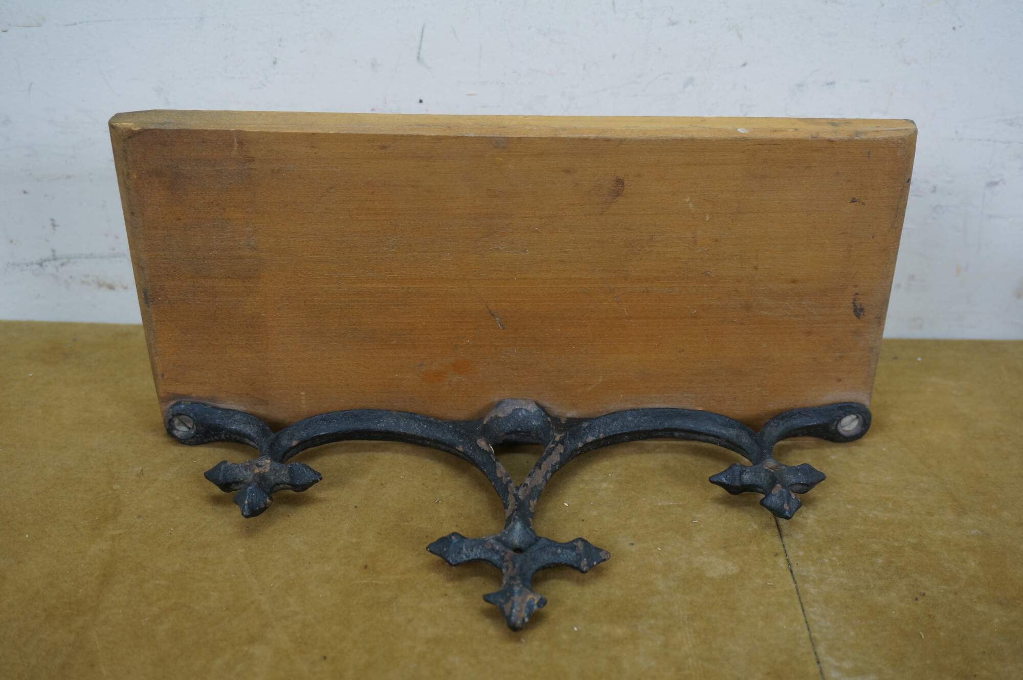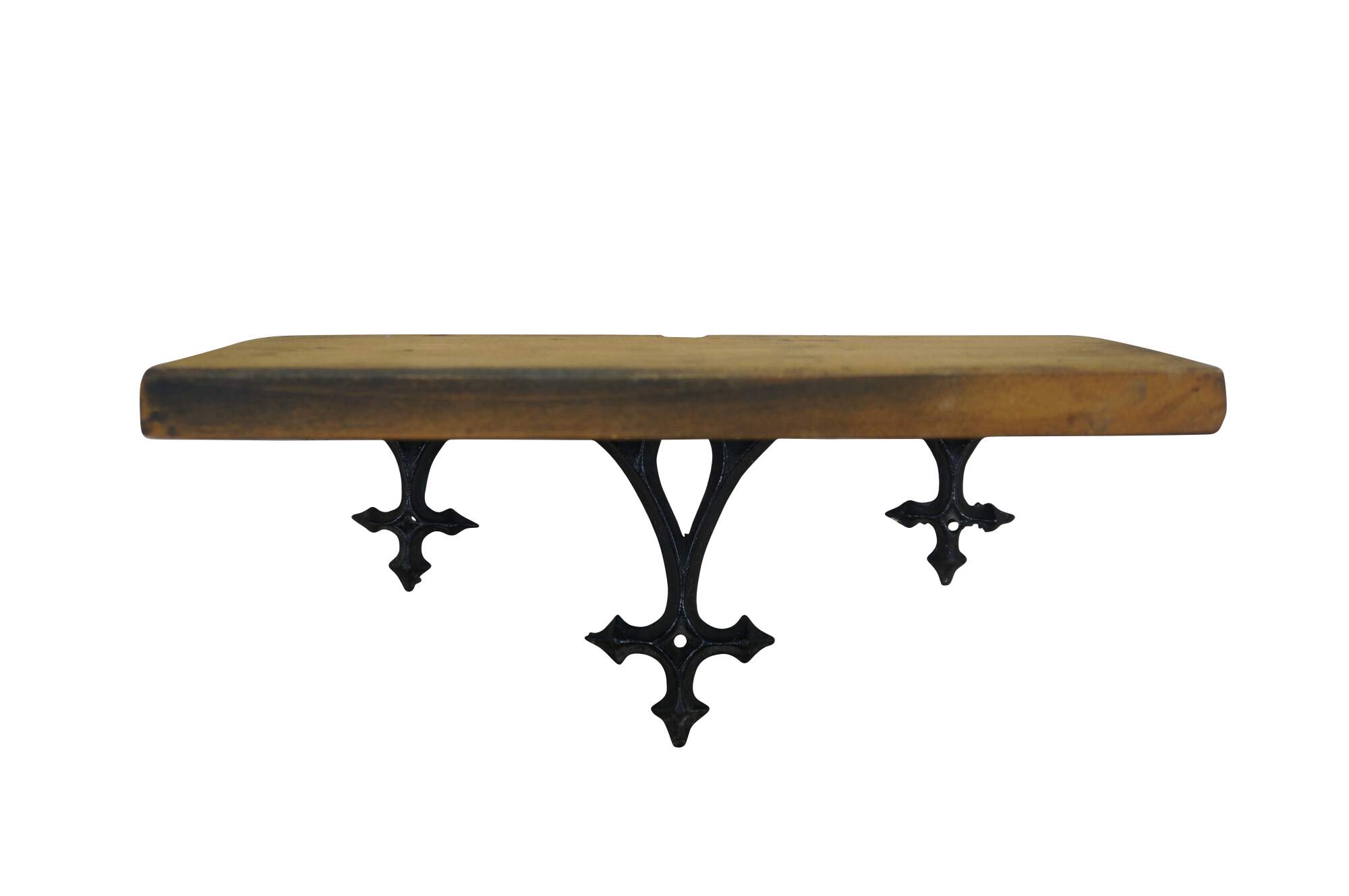 Pair of vintage 20th-century wall hanging shelves / sconces featuring hardwood tops and Spanish /Gothic-style cast iron brackets.