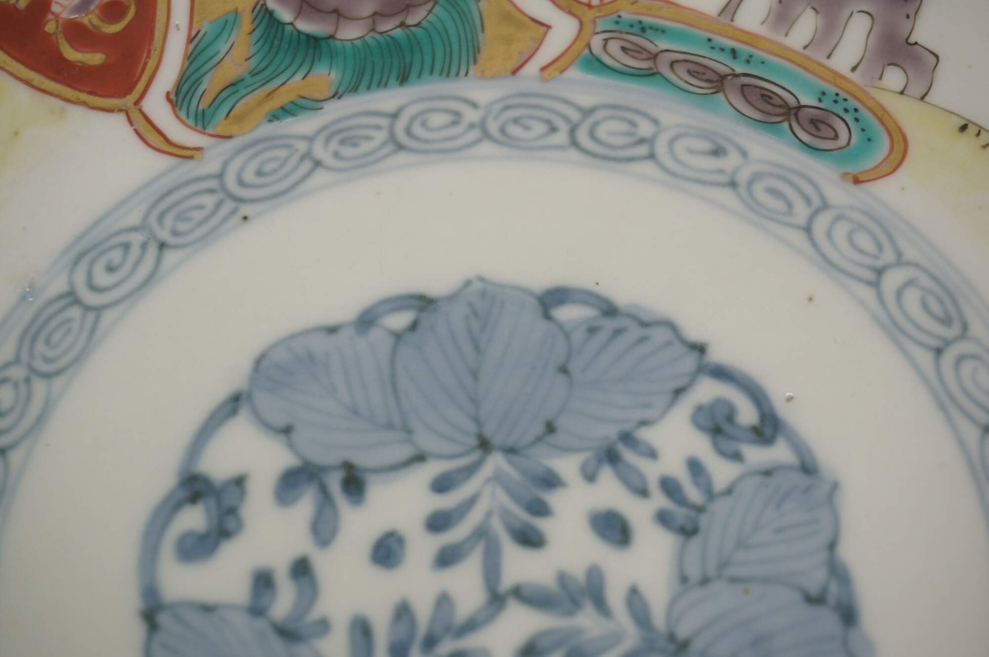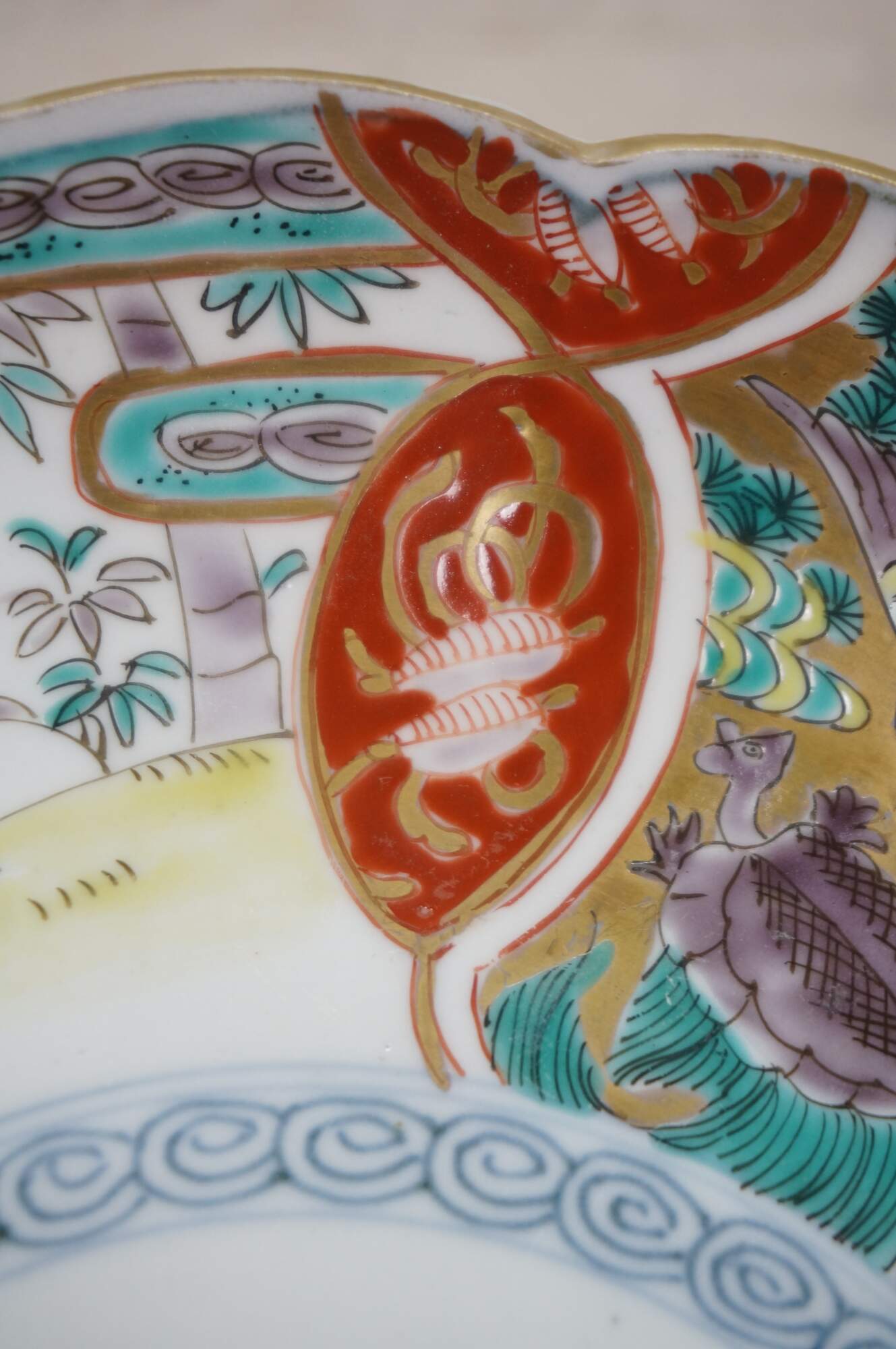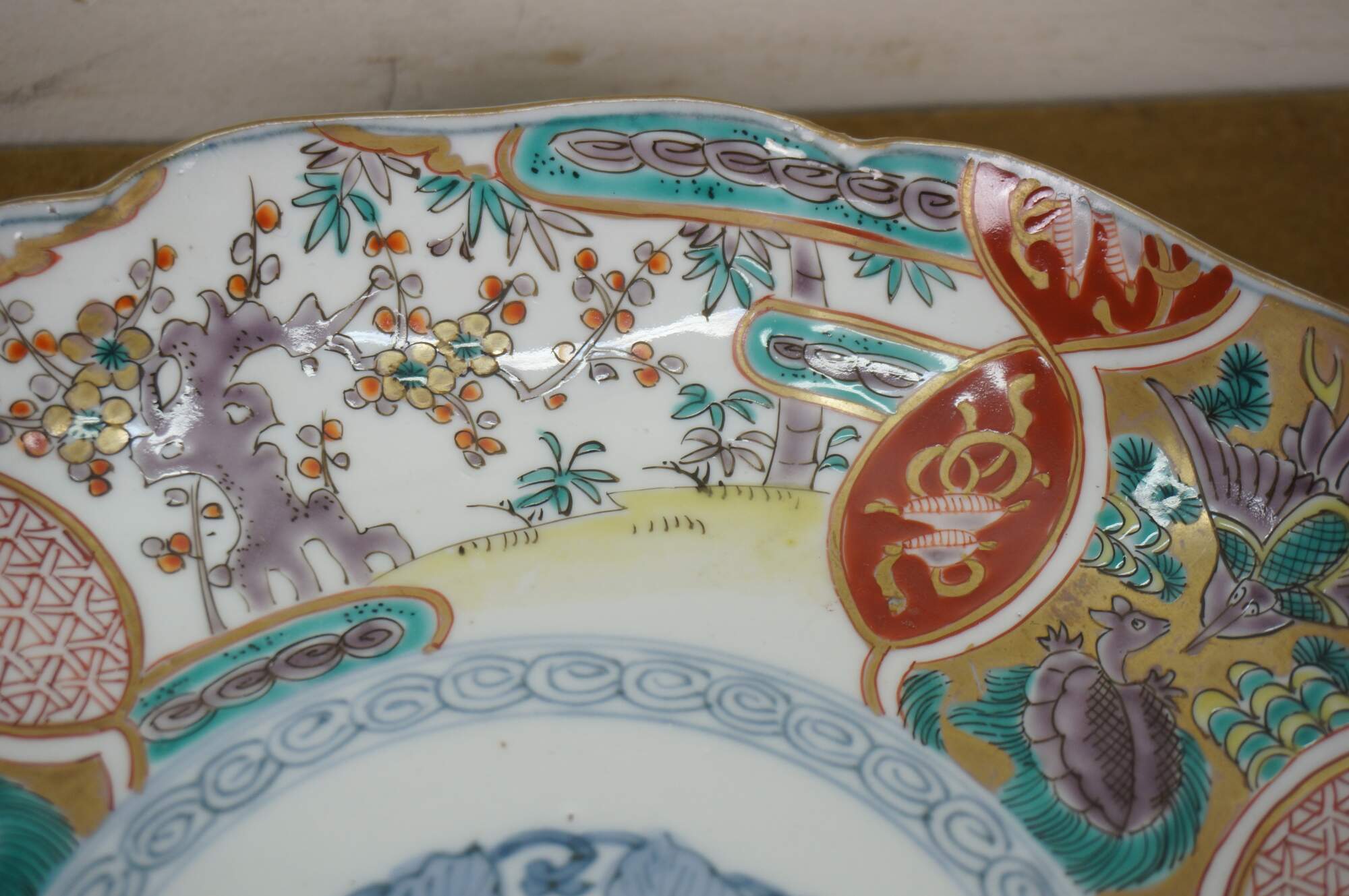 Antique Imari porcelain plate or shallow bowl with a lightly scalloped edge, decorated with a blue medallion at the center surrounded by panels of teal and purple turtles, birds, and fish, patterned red lozenges, and flowering trees.