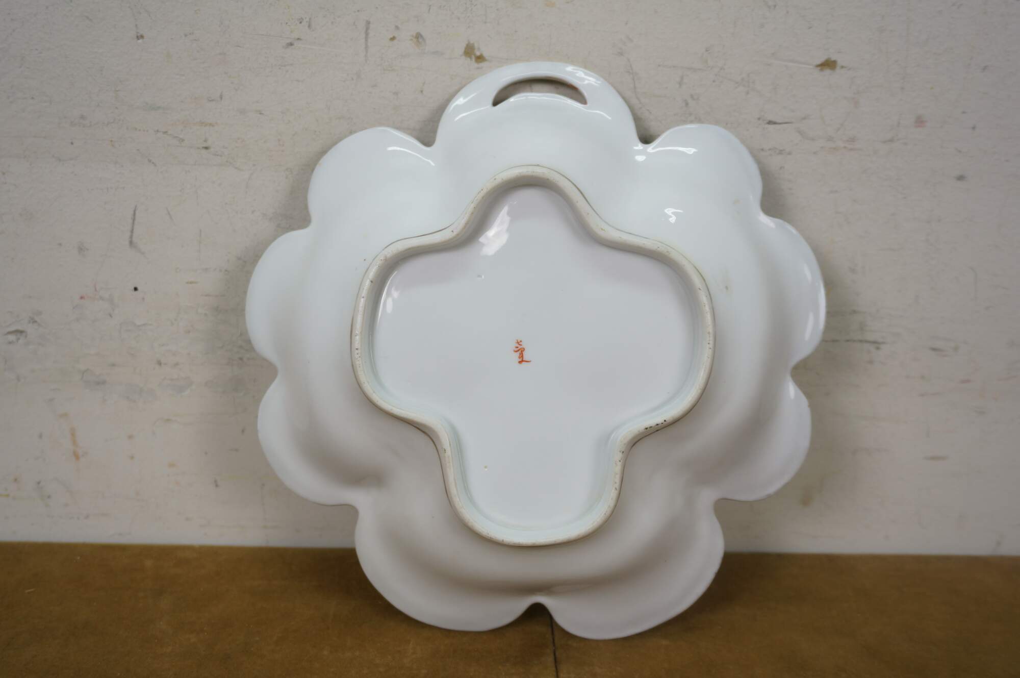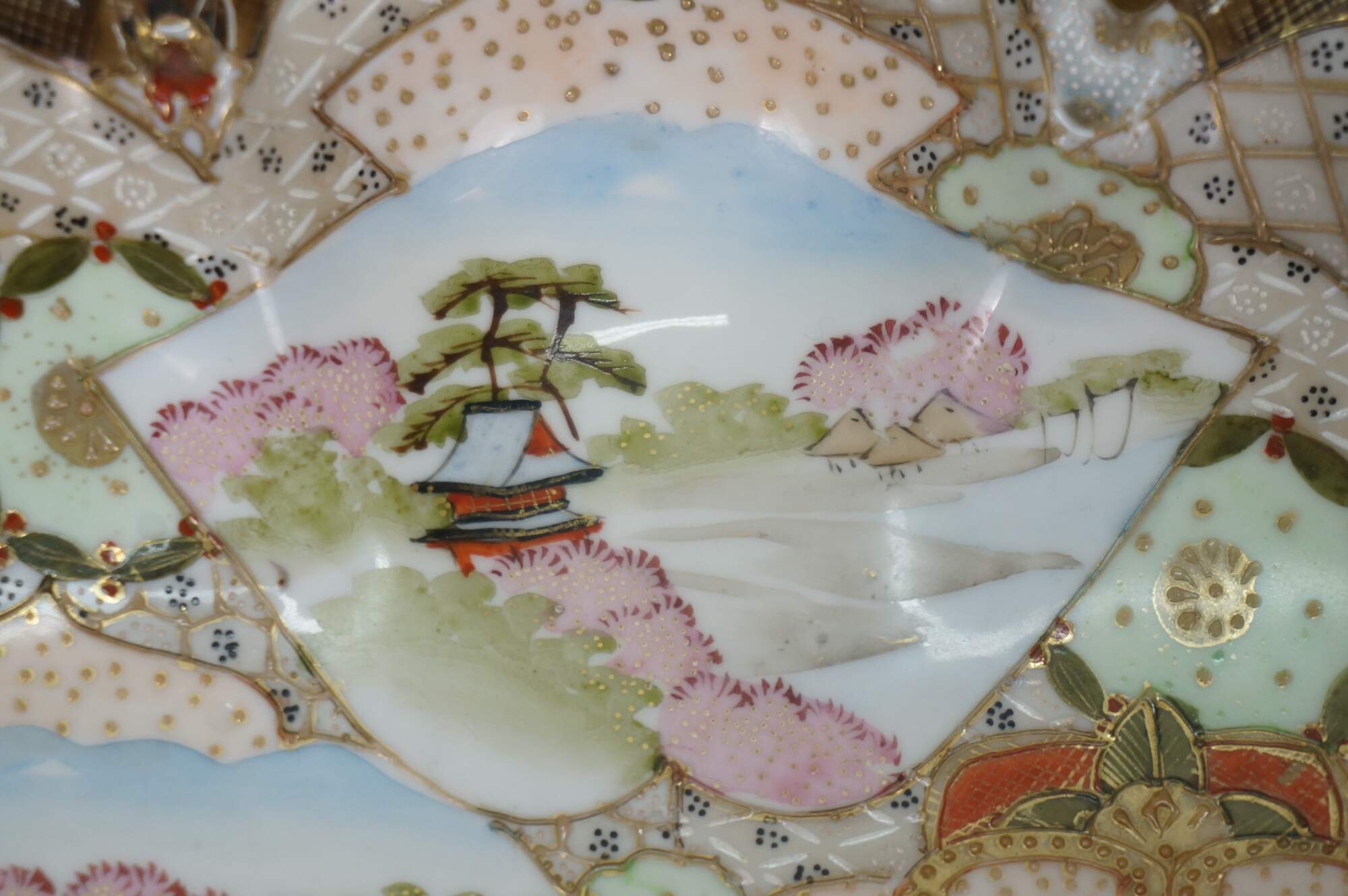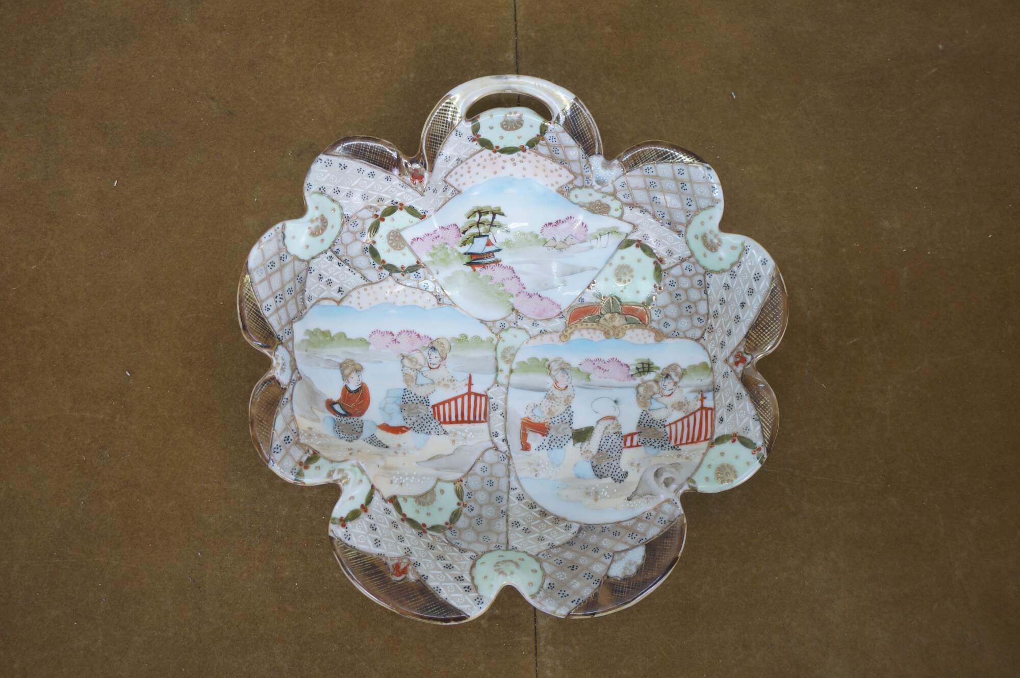 Early to mid-20th century Japanese satsuma style hand-painted porcelain serving dish/ bowl. Nine-petaled flower shape with pierced handle on one side. Hand-painted with patterns in beige and mint green surrounding small pagoda landscapes and scenes with geisha figures.