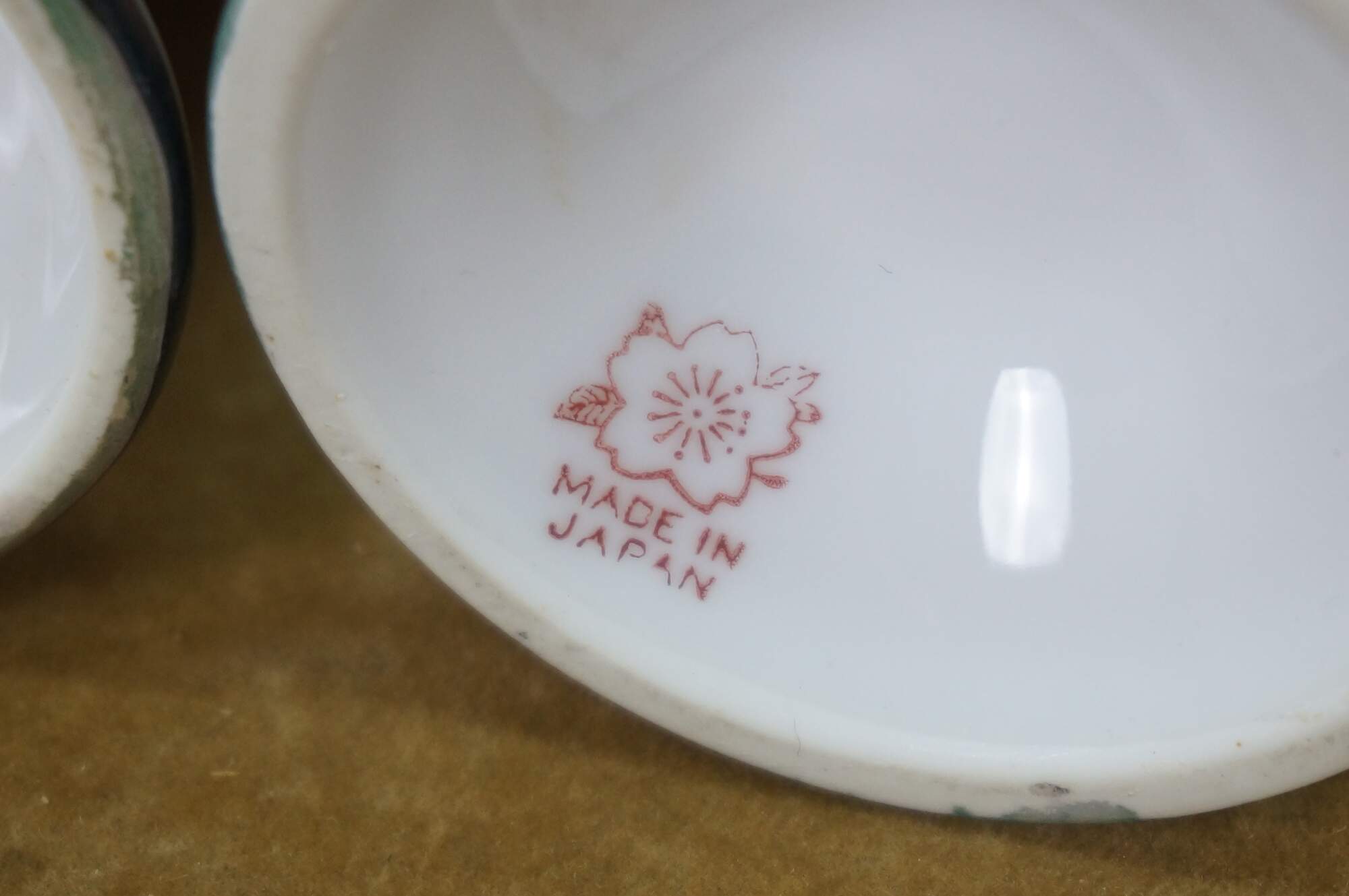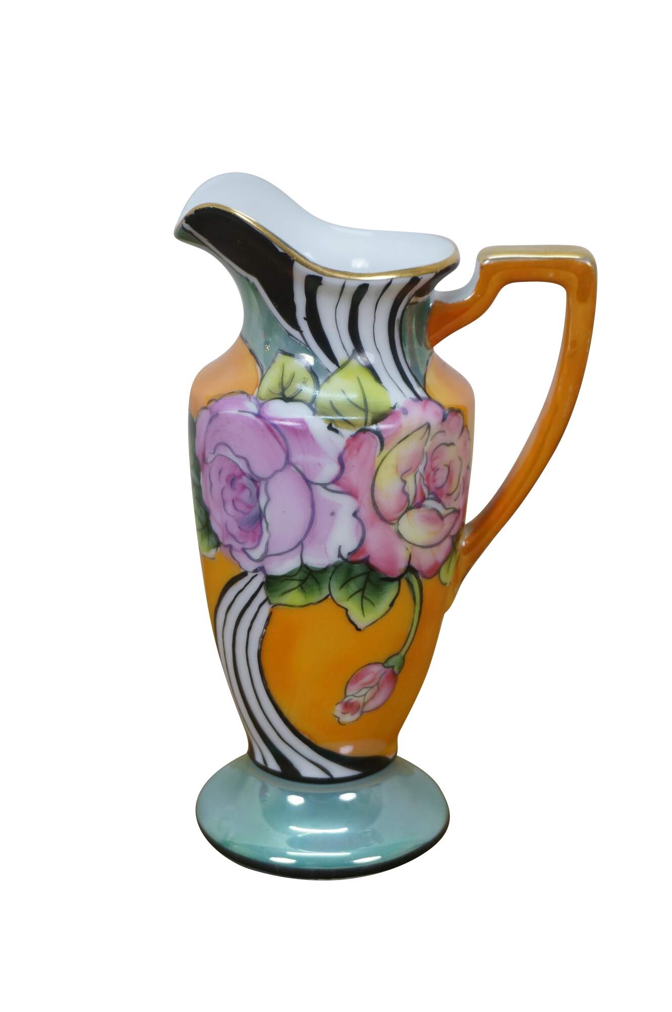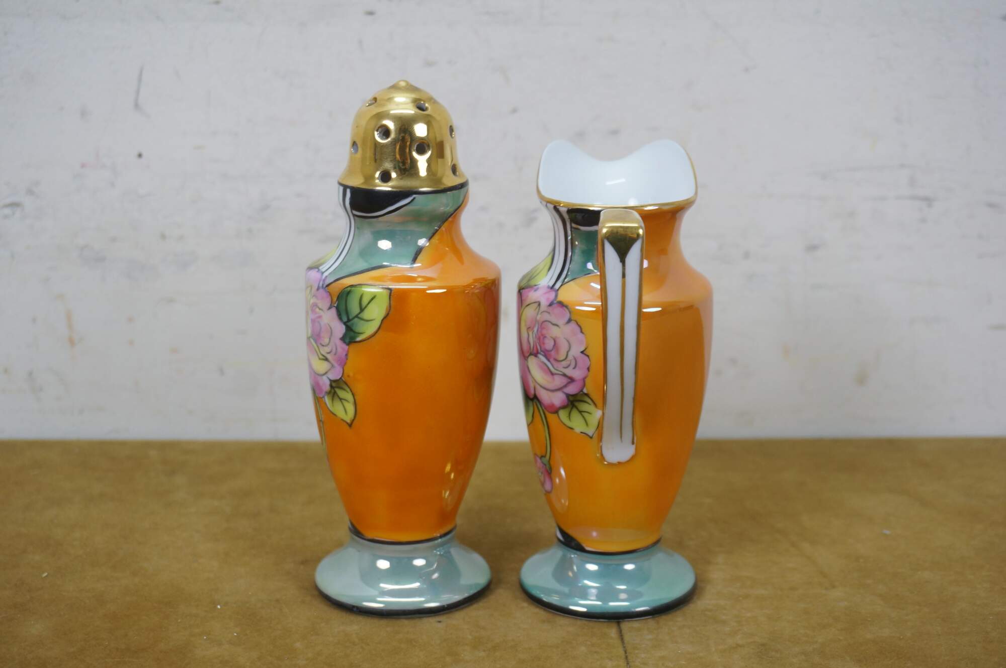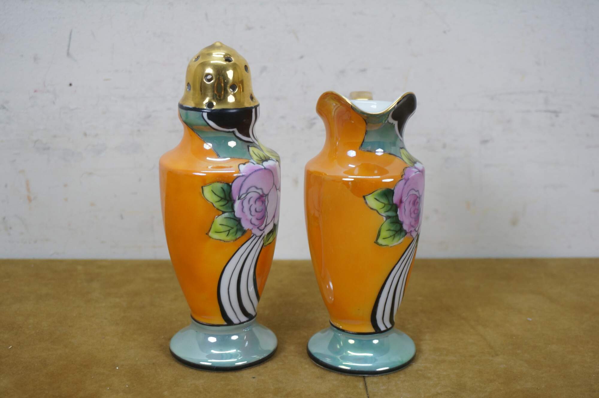 Vintage porcelain muffin tin / sugar shaker and creamer / syrup pitcher set. Decorated in orange with swirling black and white stripes, blue lustre and gilt accents. Made in Japan.