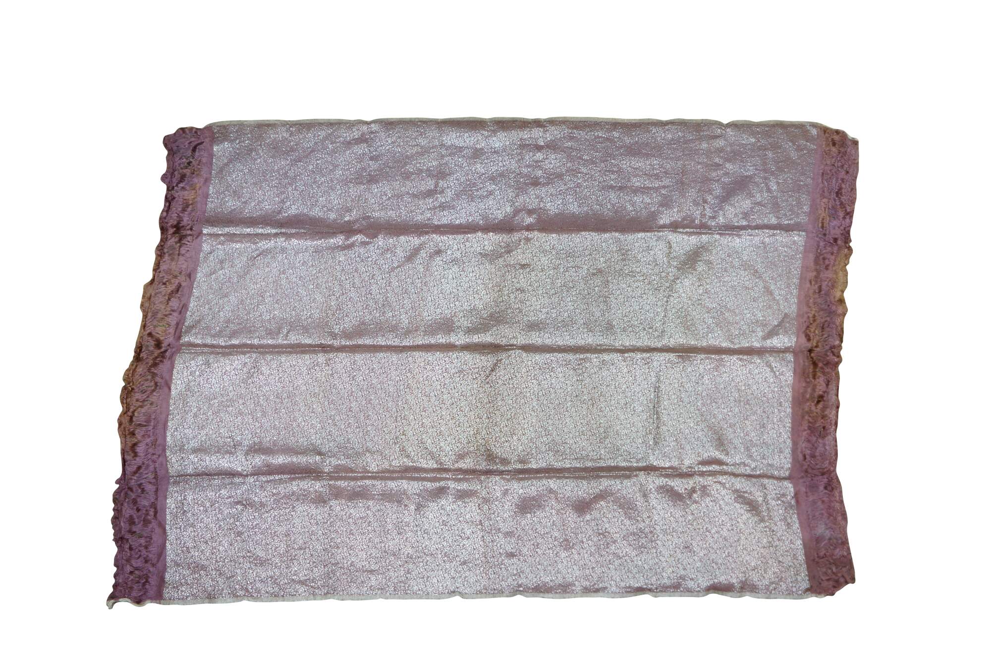 Pair of vintage woven silk shawls / wraps or tablecloths - soft pink and emerald green with fringed edges and floral /foliated designs in metallic gold thread.