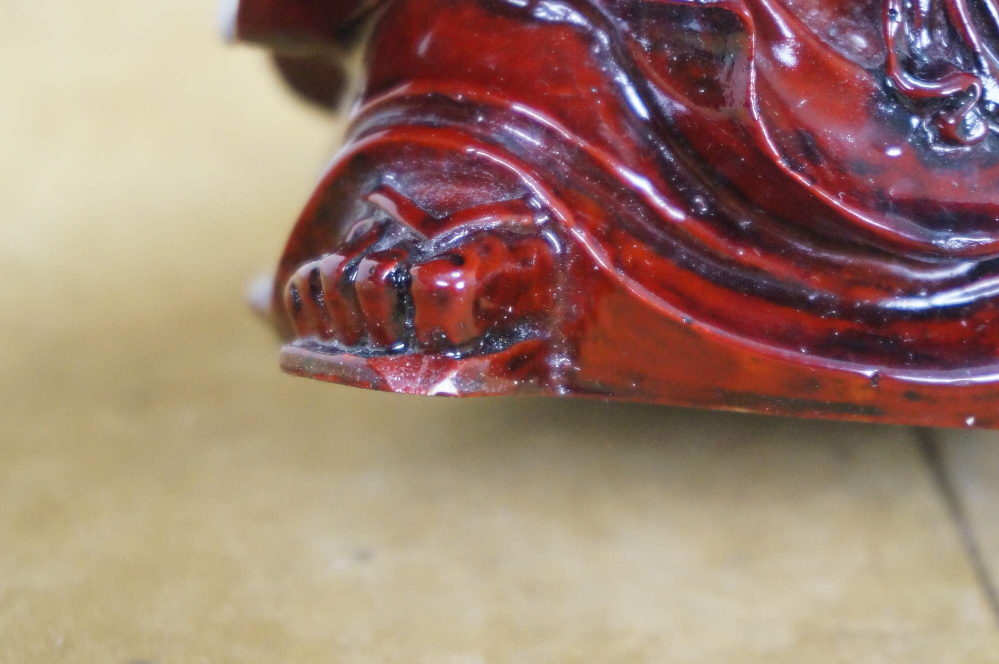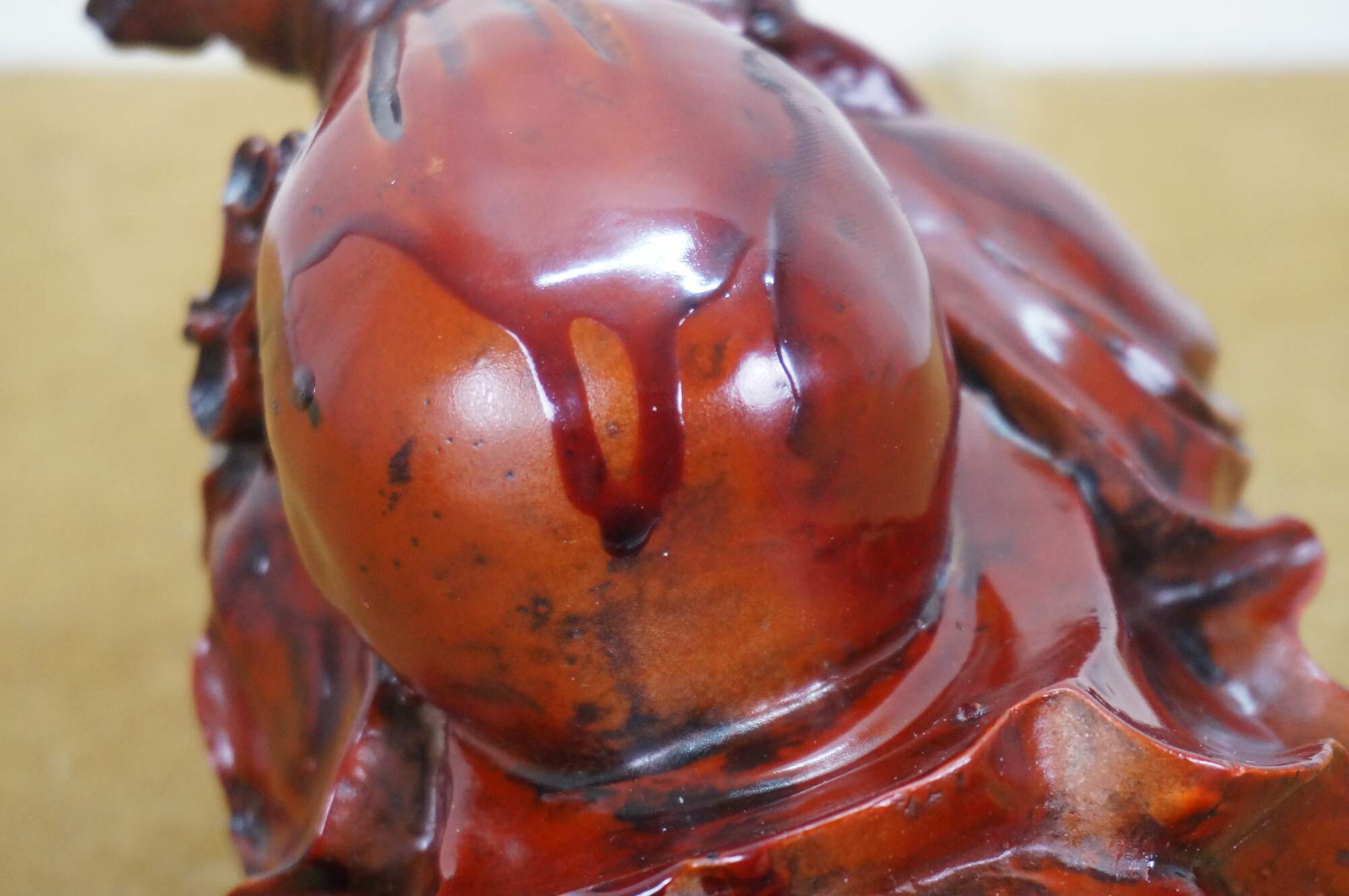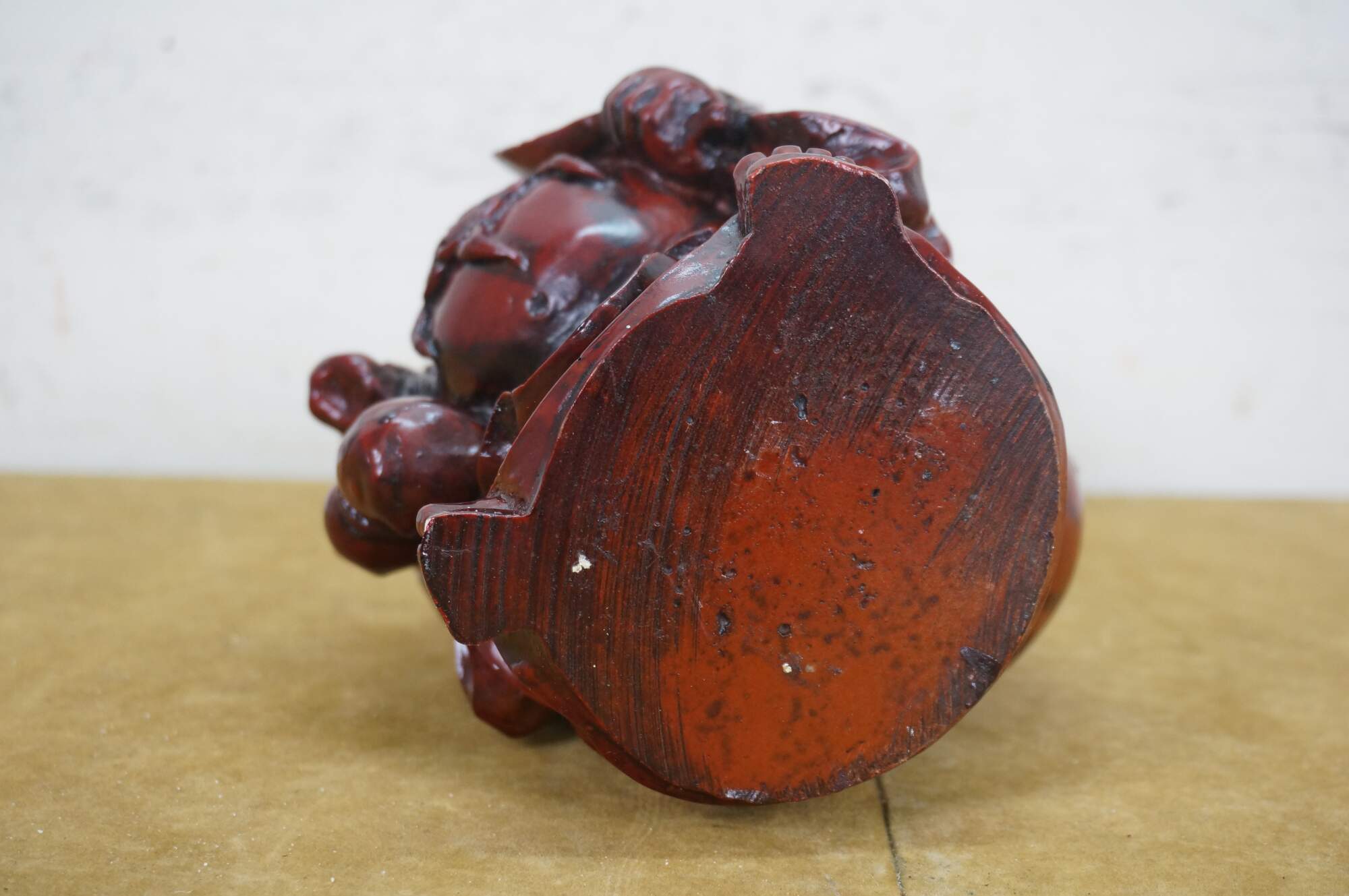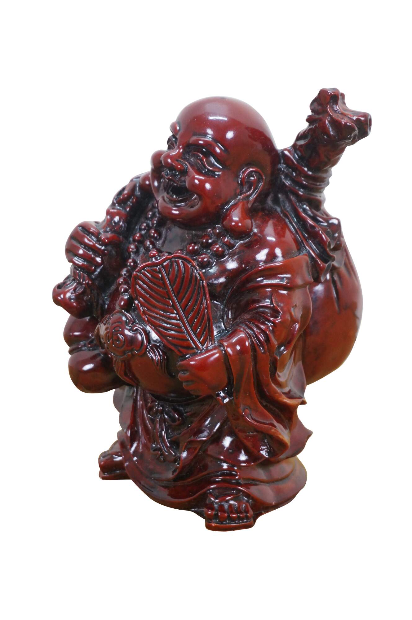 Resin figurine with a glossy red finish, depicting a large-bellied, laughing Buddha laden for travel on a spiritual journey, carrying a large sack of good fortune on his back, a gourd of enlightenment, a fan symbolizing joy, used to banish troubles and misfortune, and a necklace of prayer beads, evoking mindfulness and meditation in daily life.