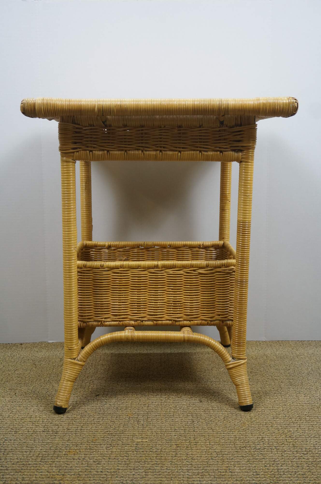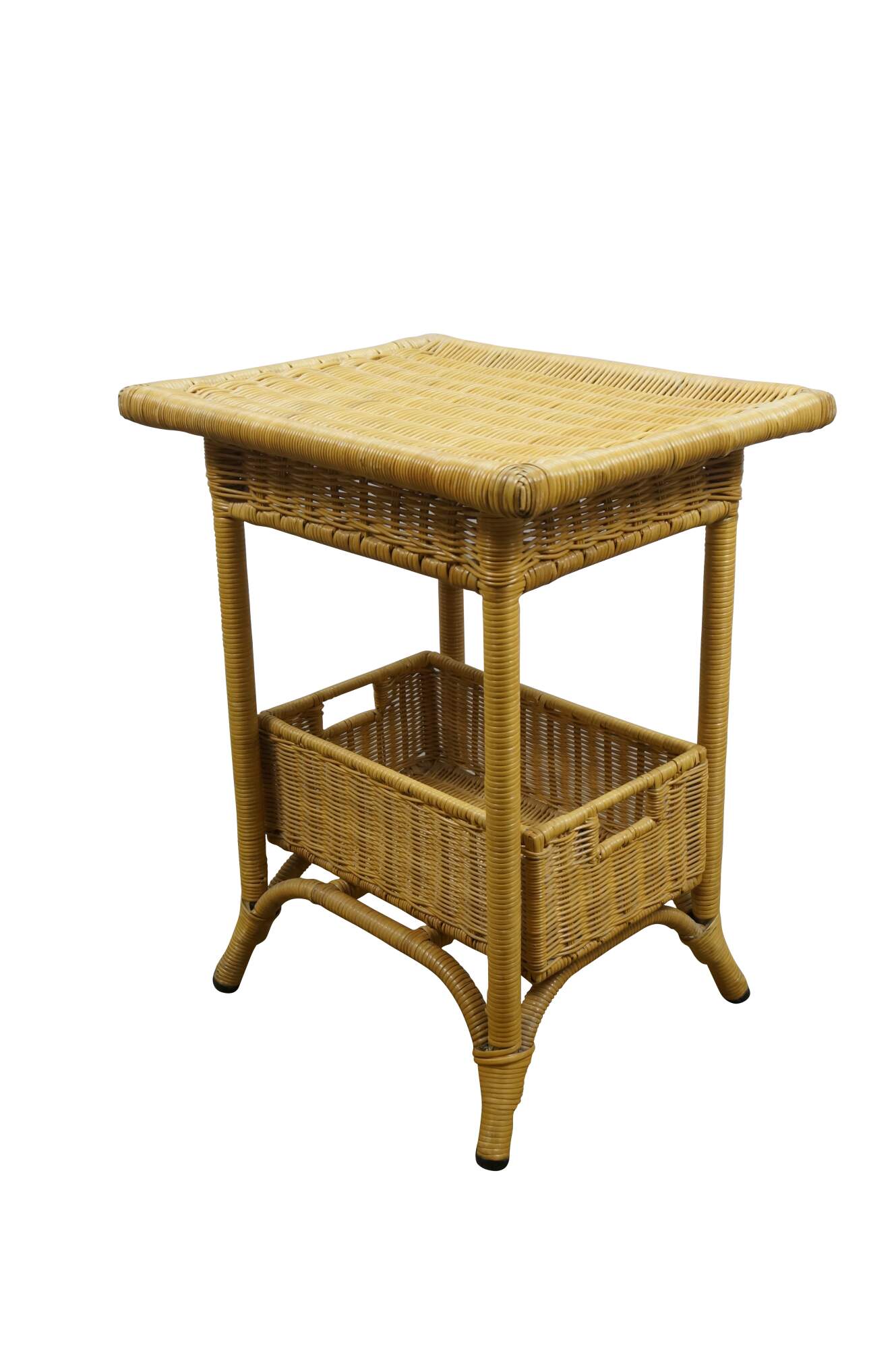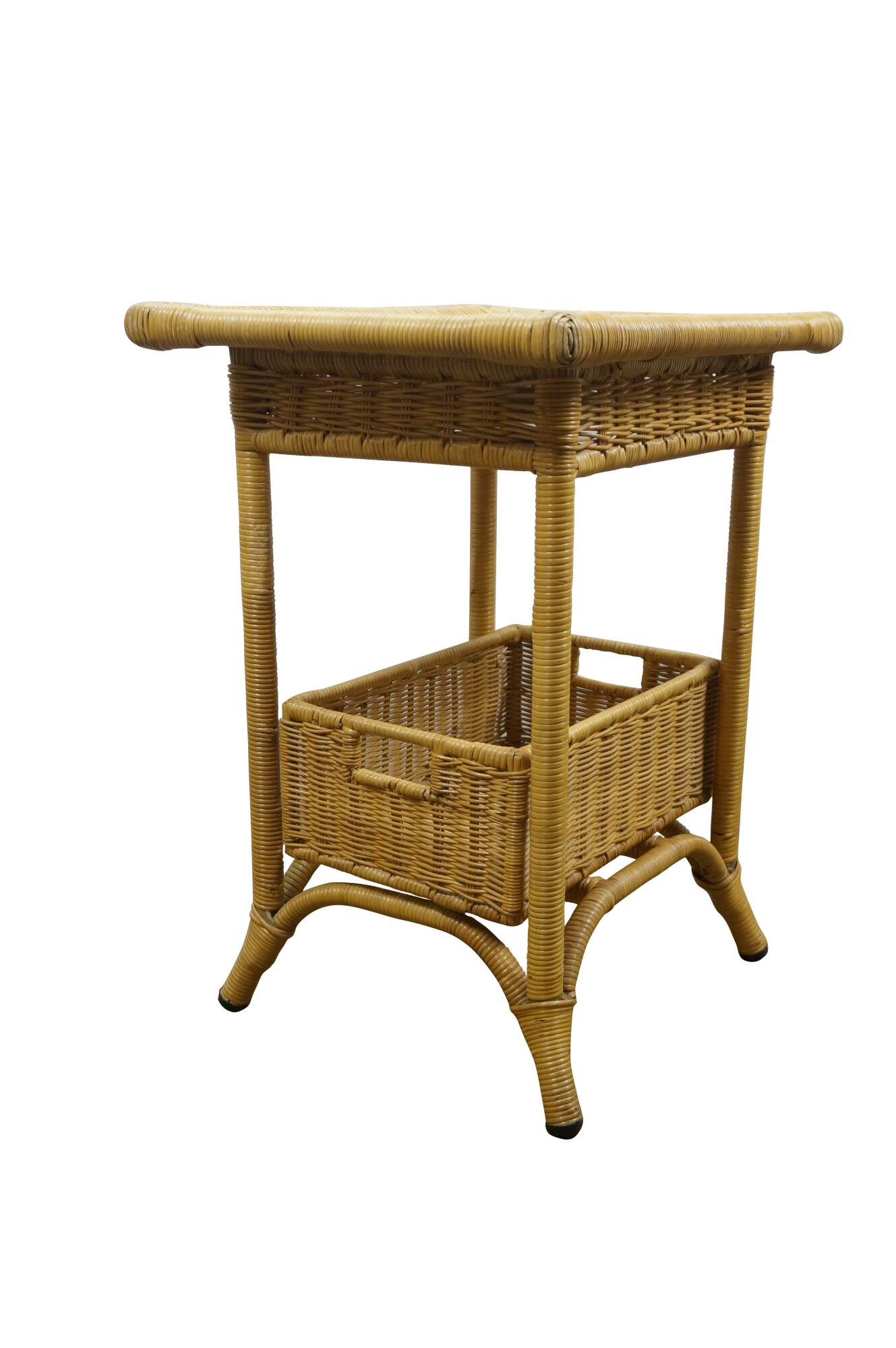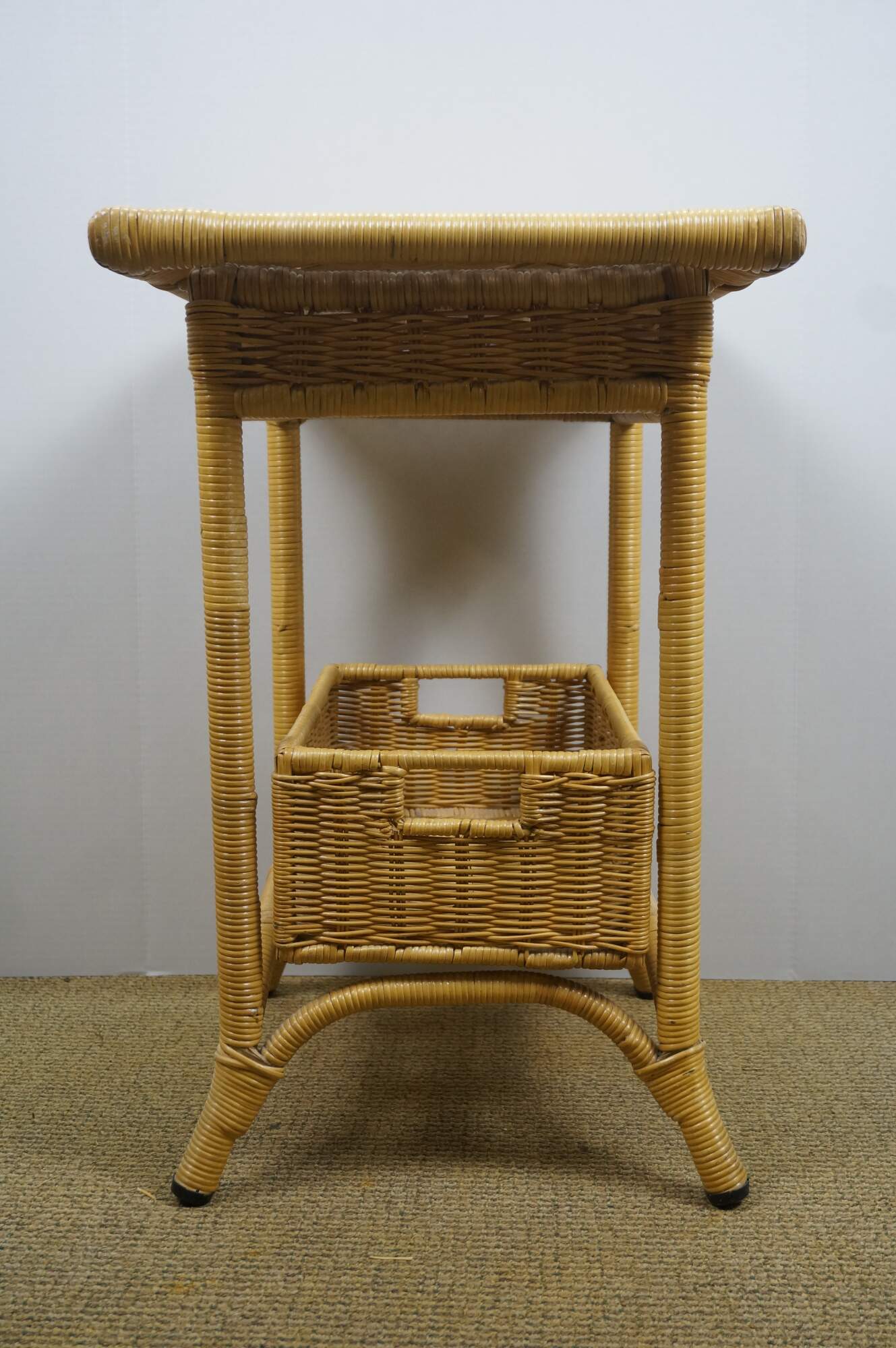 Vintage 20th century wicker end / accent table - rectangular top with apron, four legs and basket that fits on the lower stretchers.