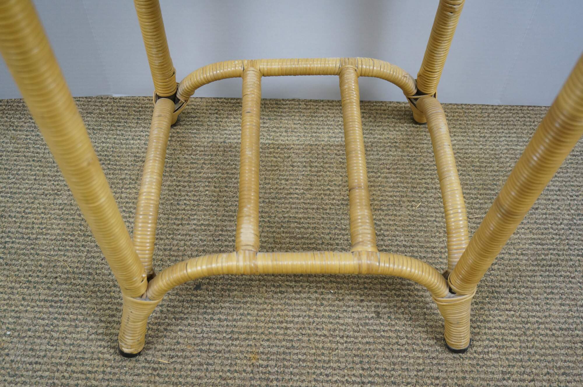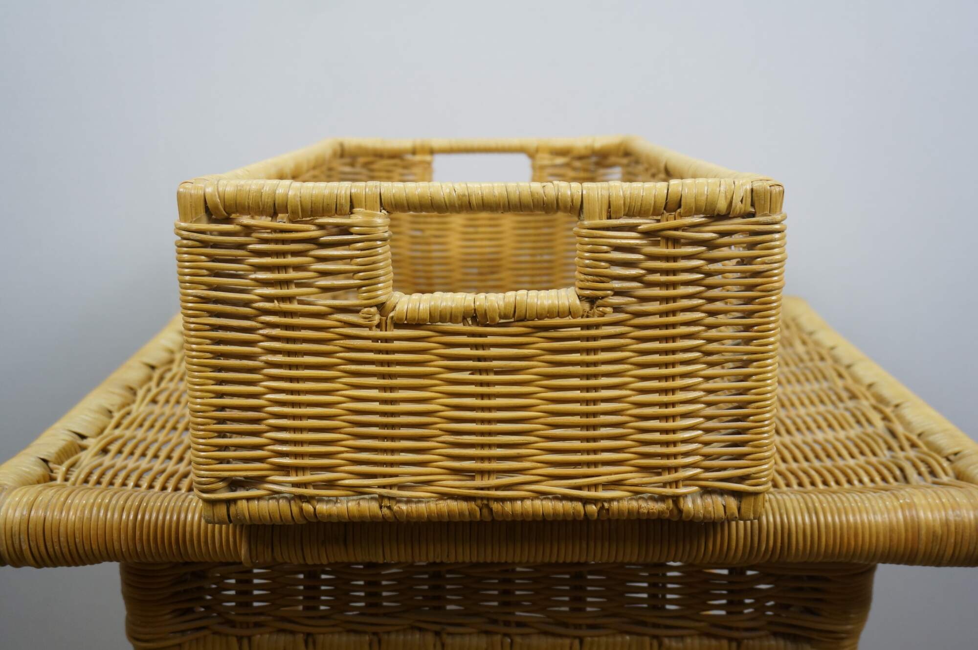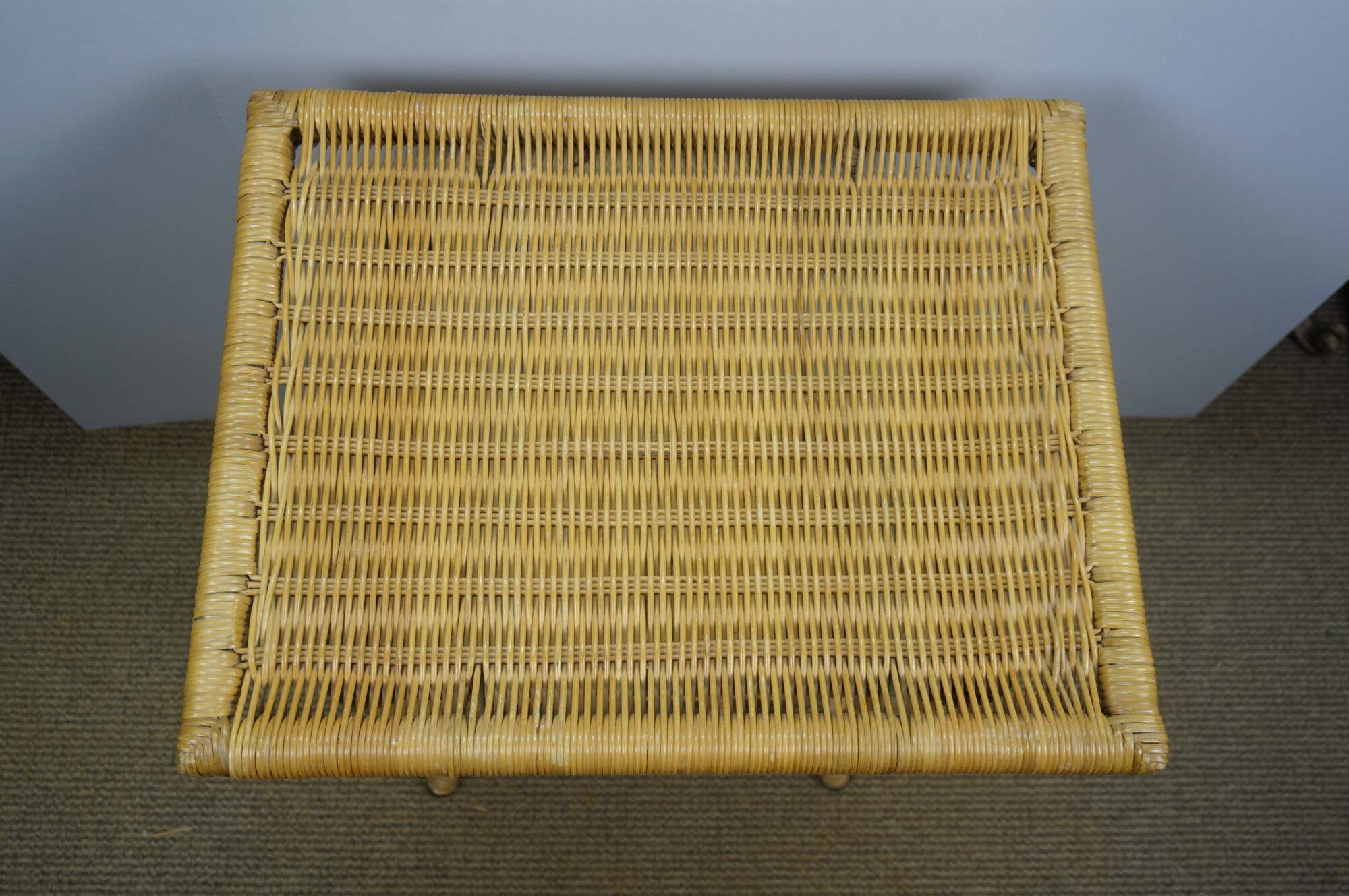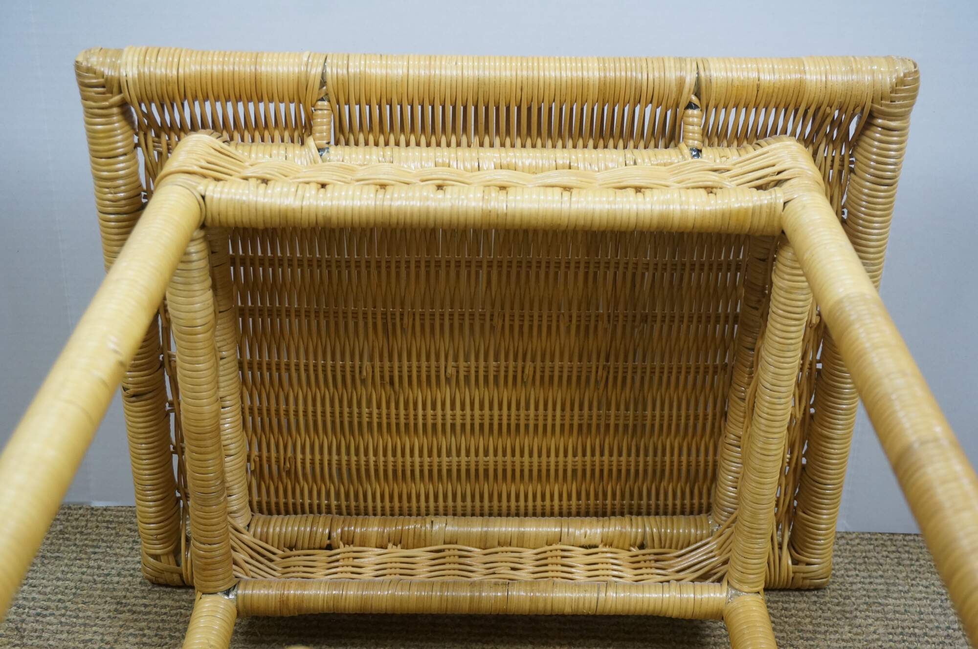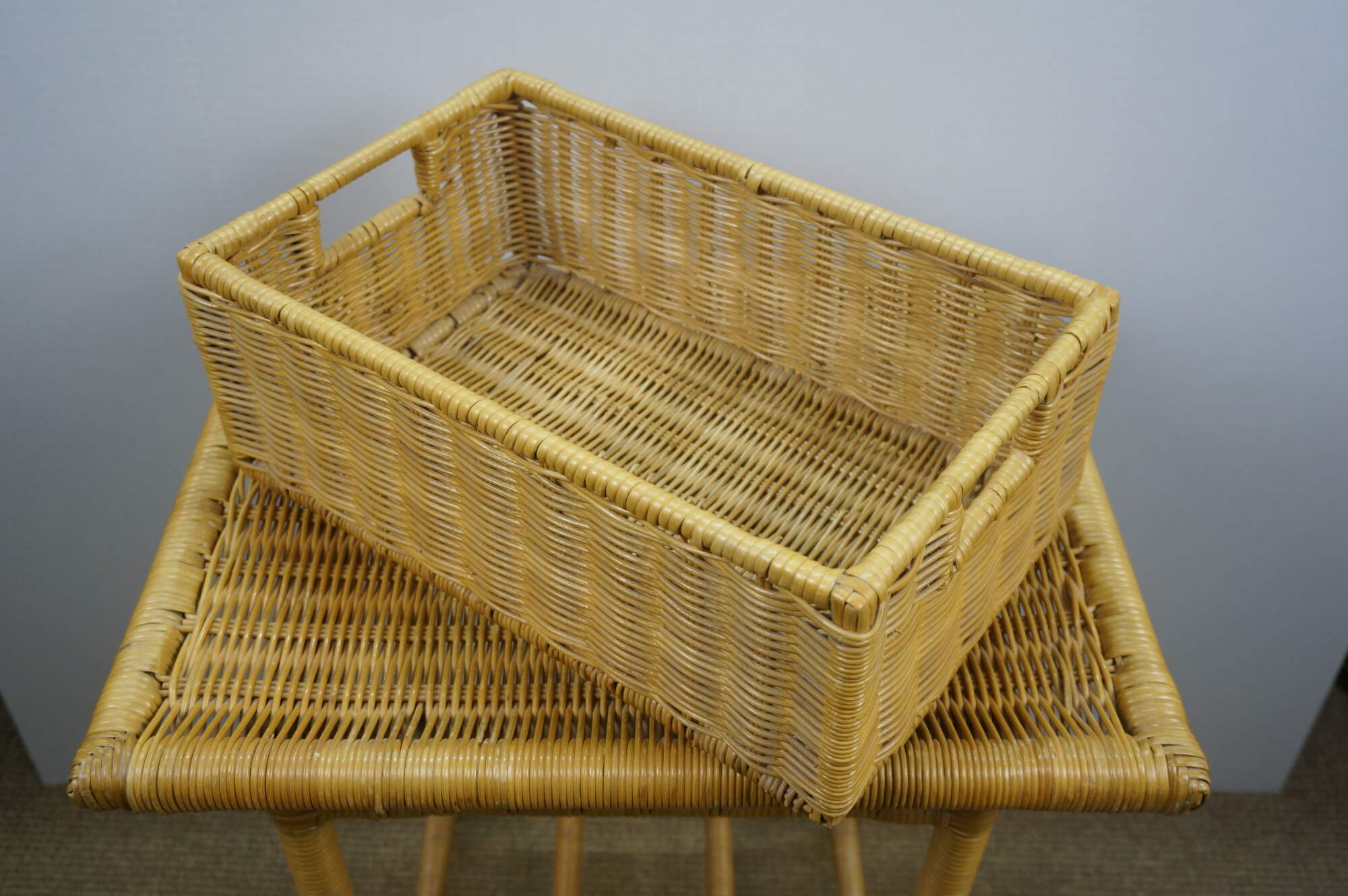 Vintage 20th century wicker end / accent table - rectangular top with apron, four legs and basket that fits on the lower stretchers.