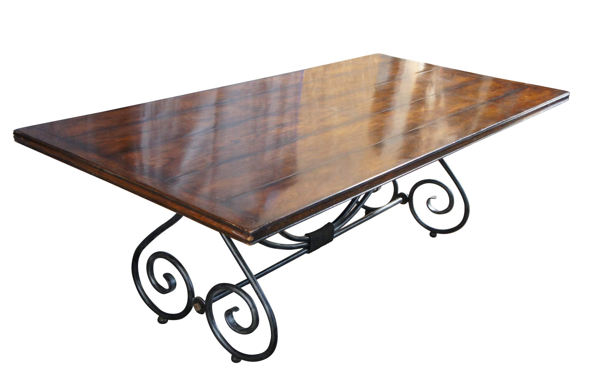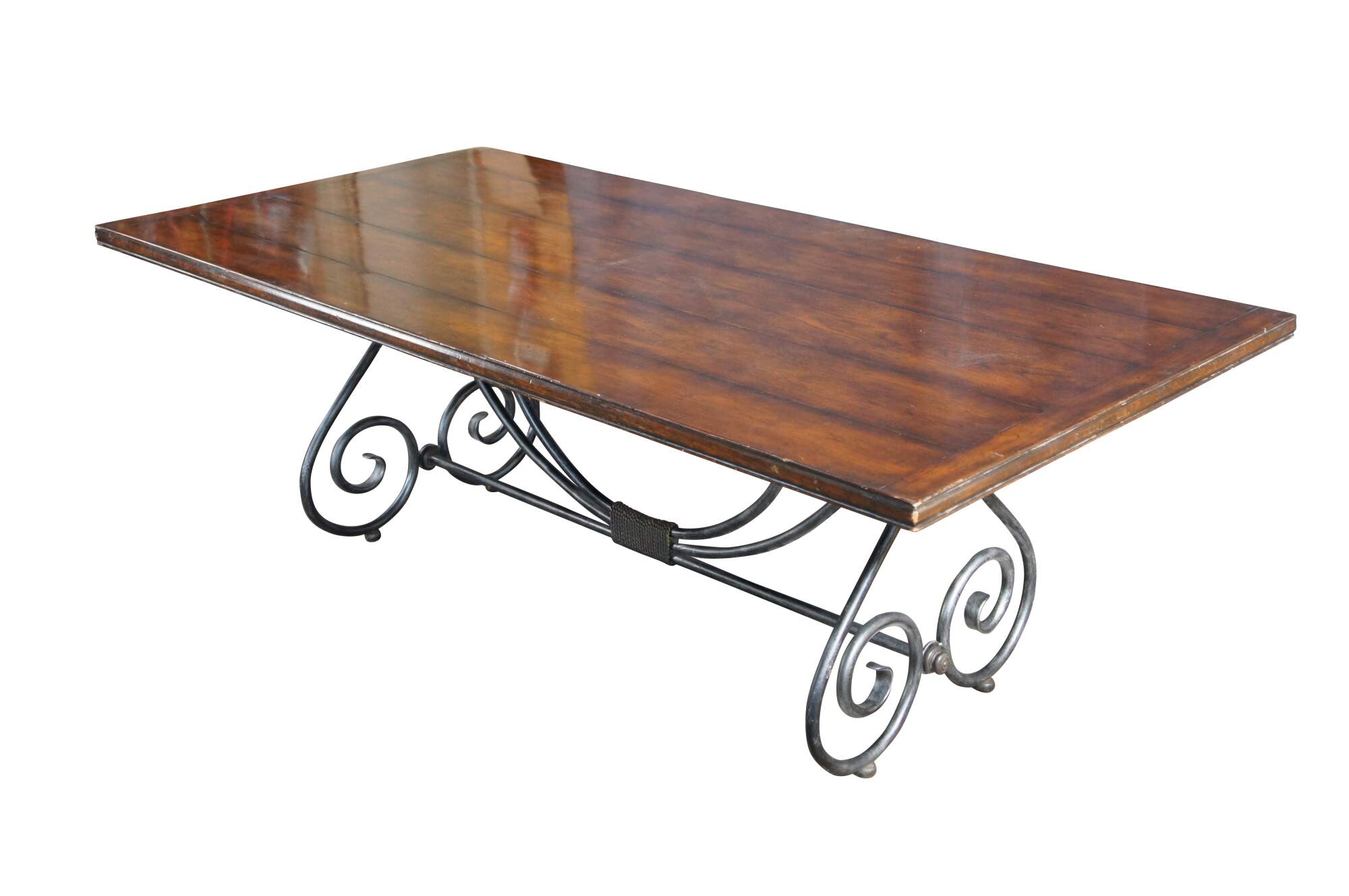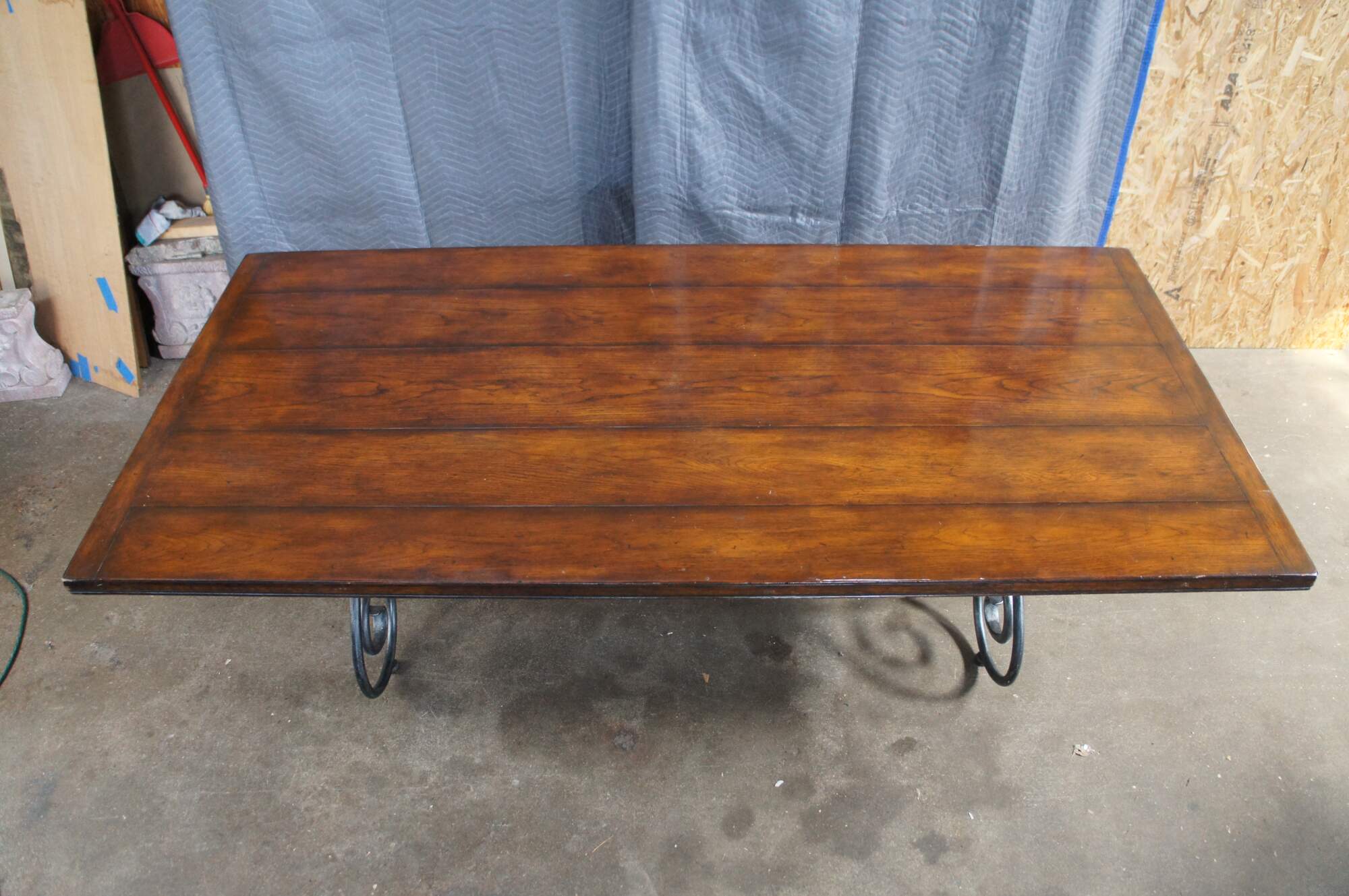 Theodore Alexander farmhouse dining table. Features a rectangular oak plank-style top over a scrolled iron footed base. Circa 2010s