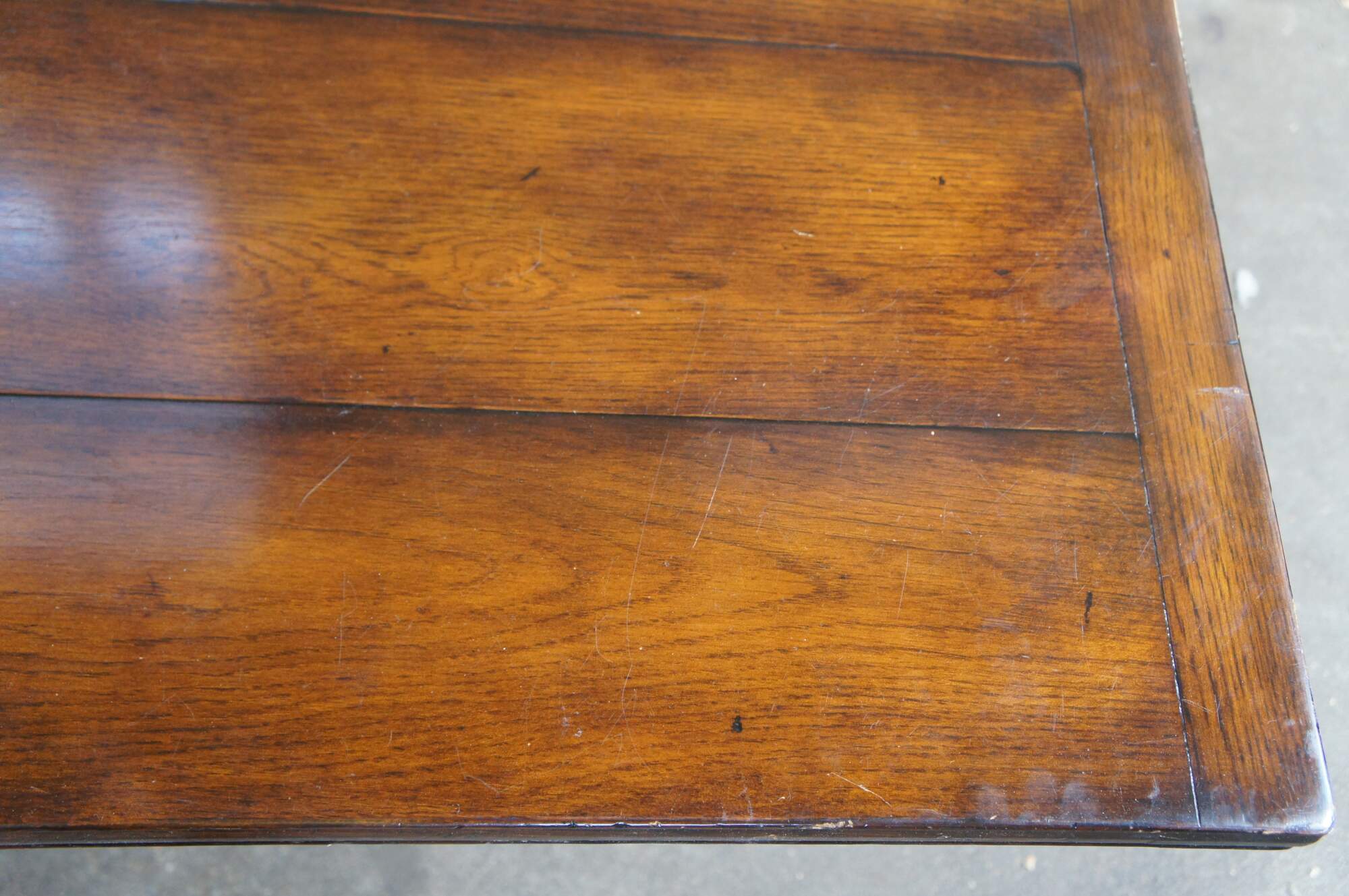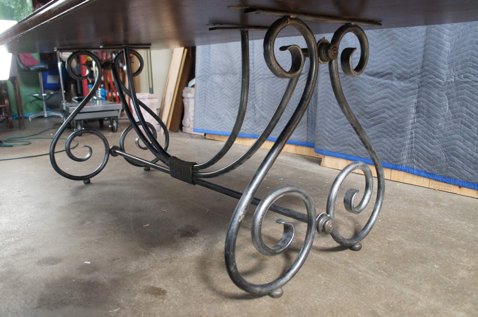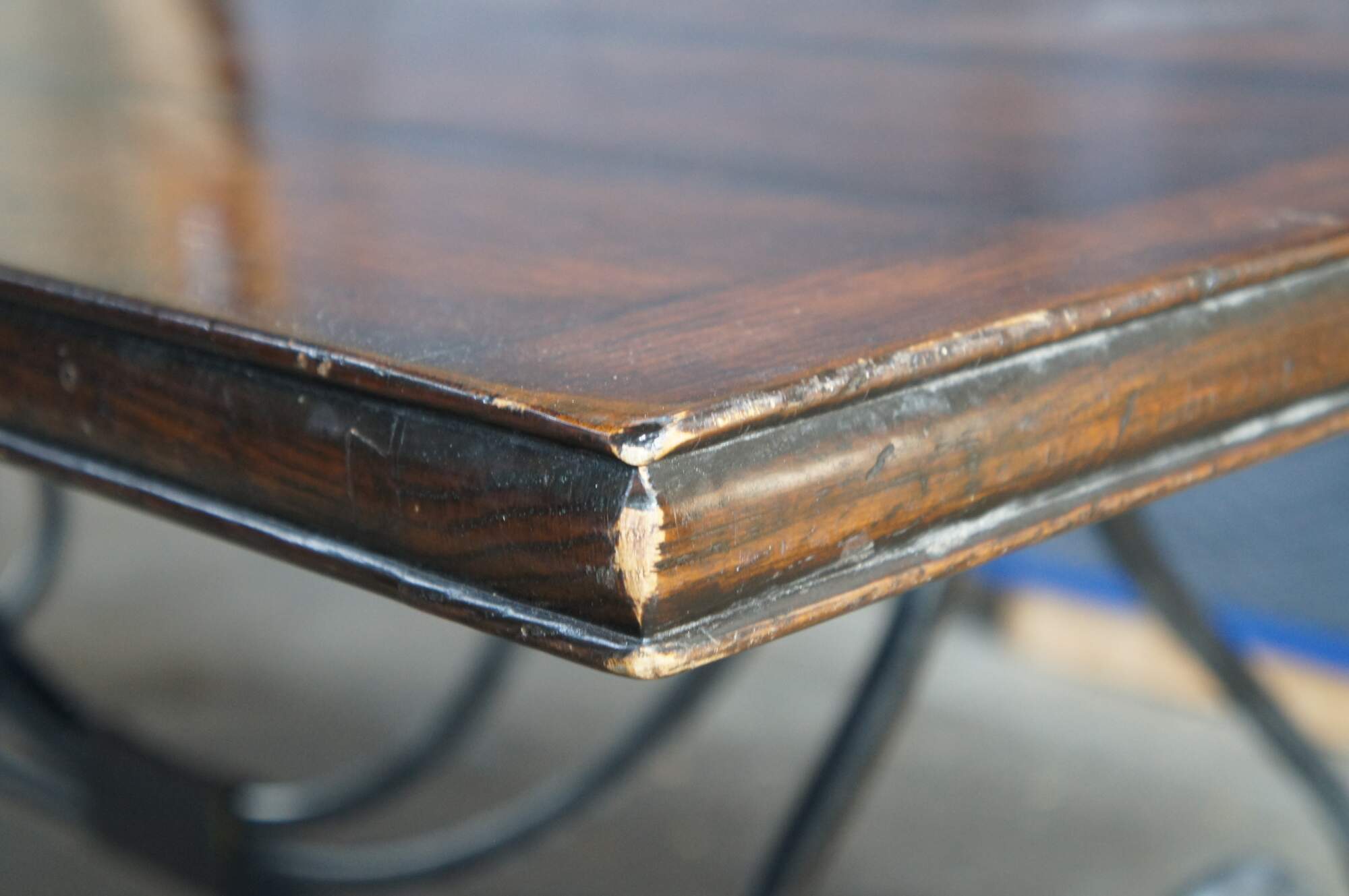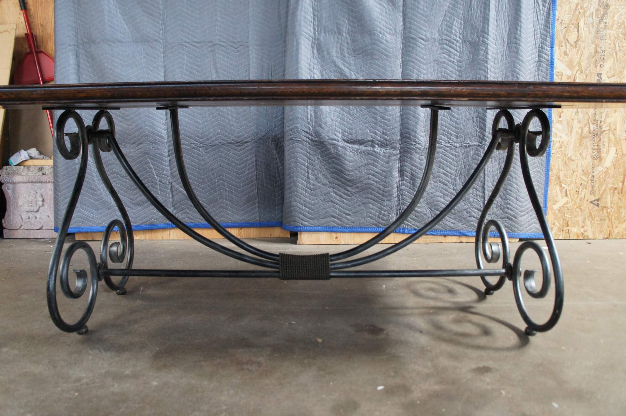 Theodore Alexander farmhouse dining table. Features a rectangular oak plank-style top over a scrolled iron footed base. Circa 2010s